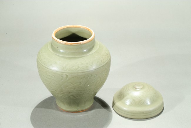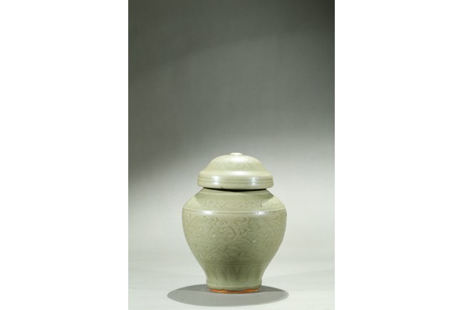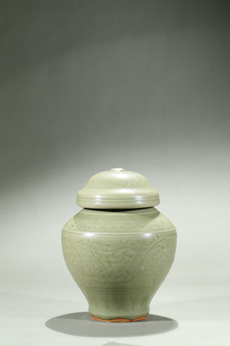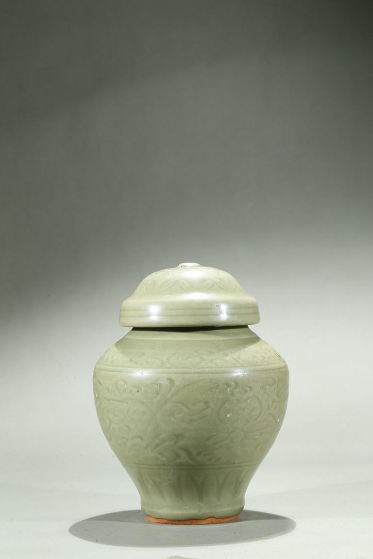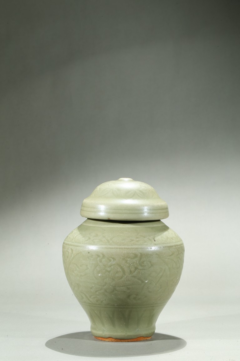 The jar is potted with ovoid tapering body carved with floral scrolls pattern, rising from countersunk base to broad shoulders, fitted with a domed stepped cover, overall covered in olive green glaze. Ming Dynasty period.
