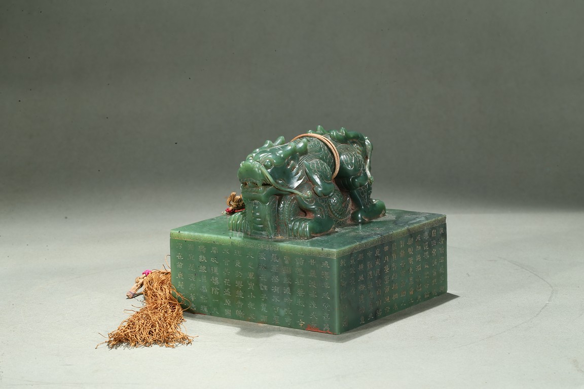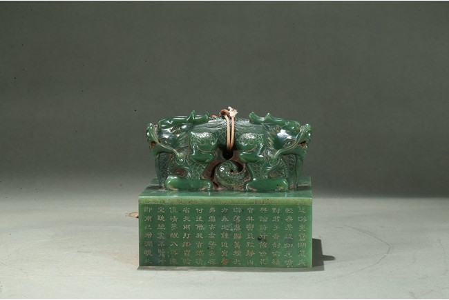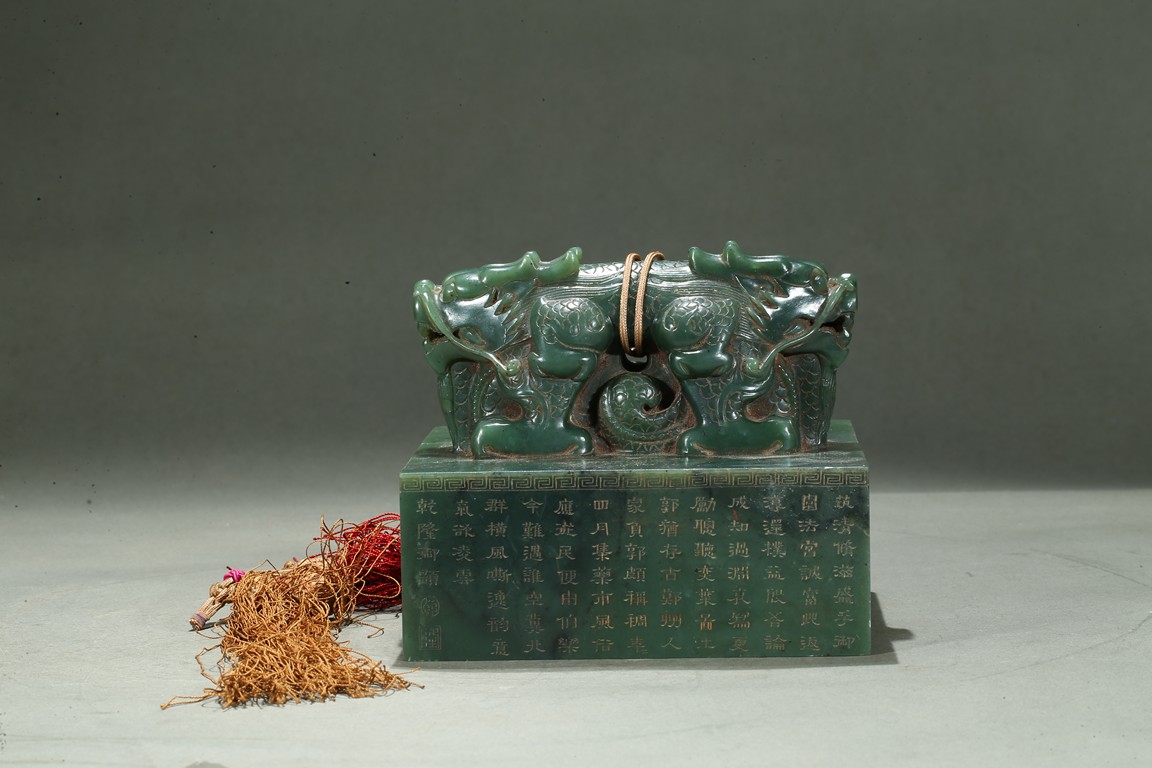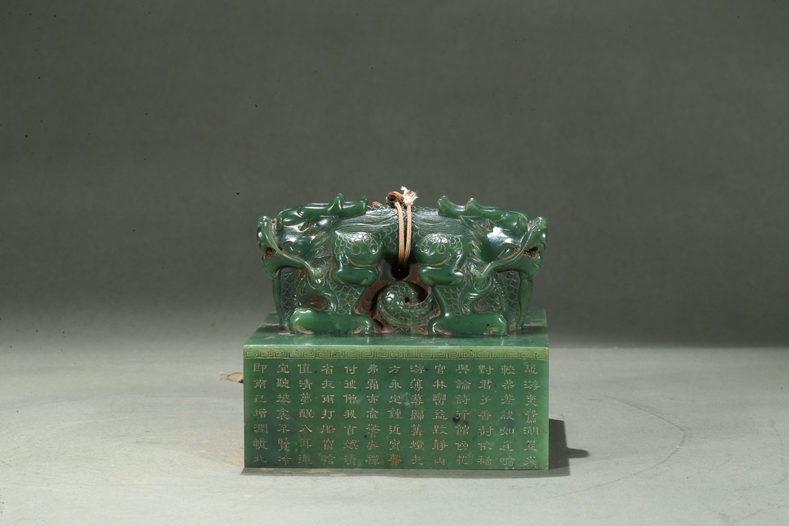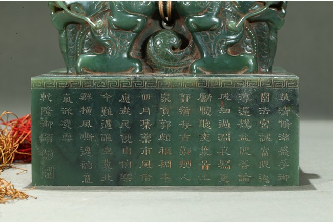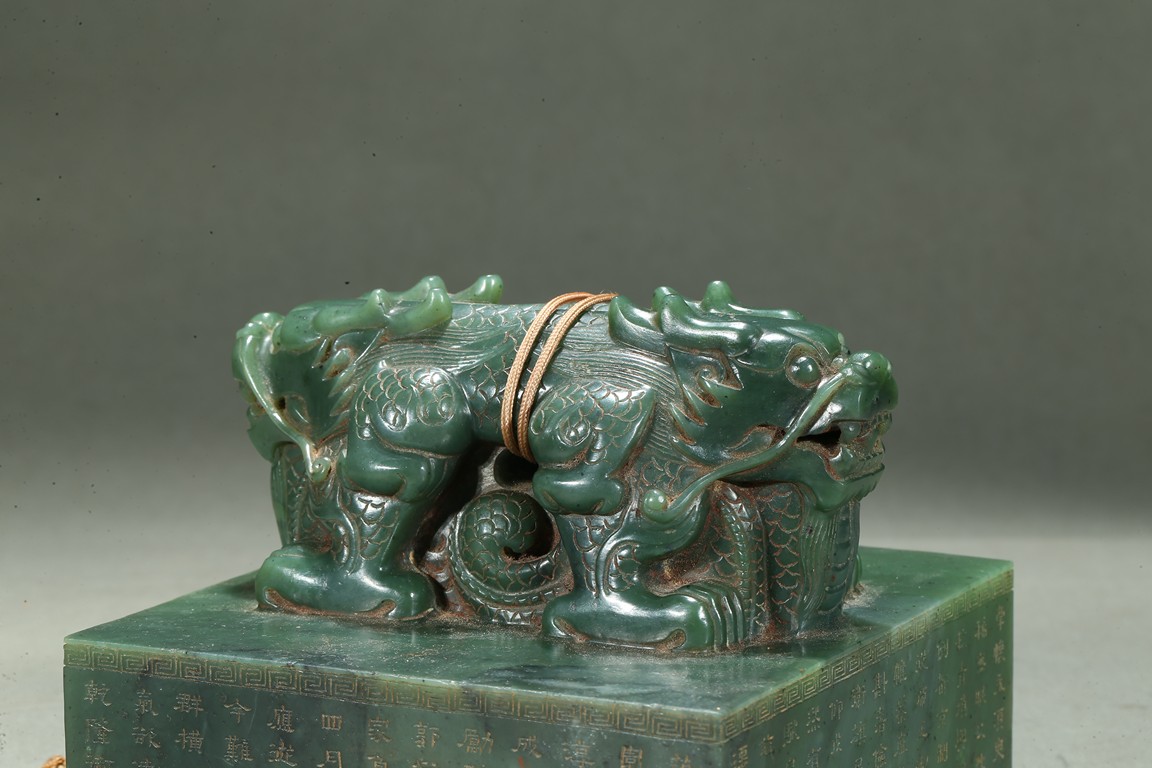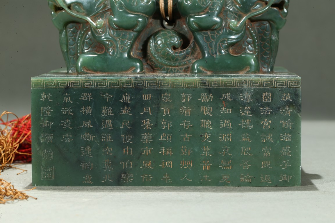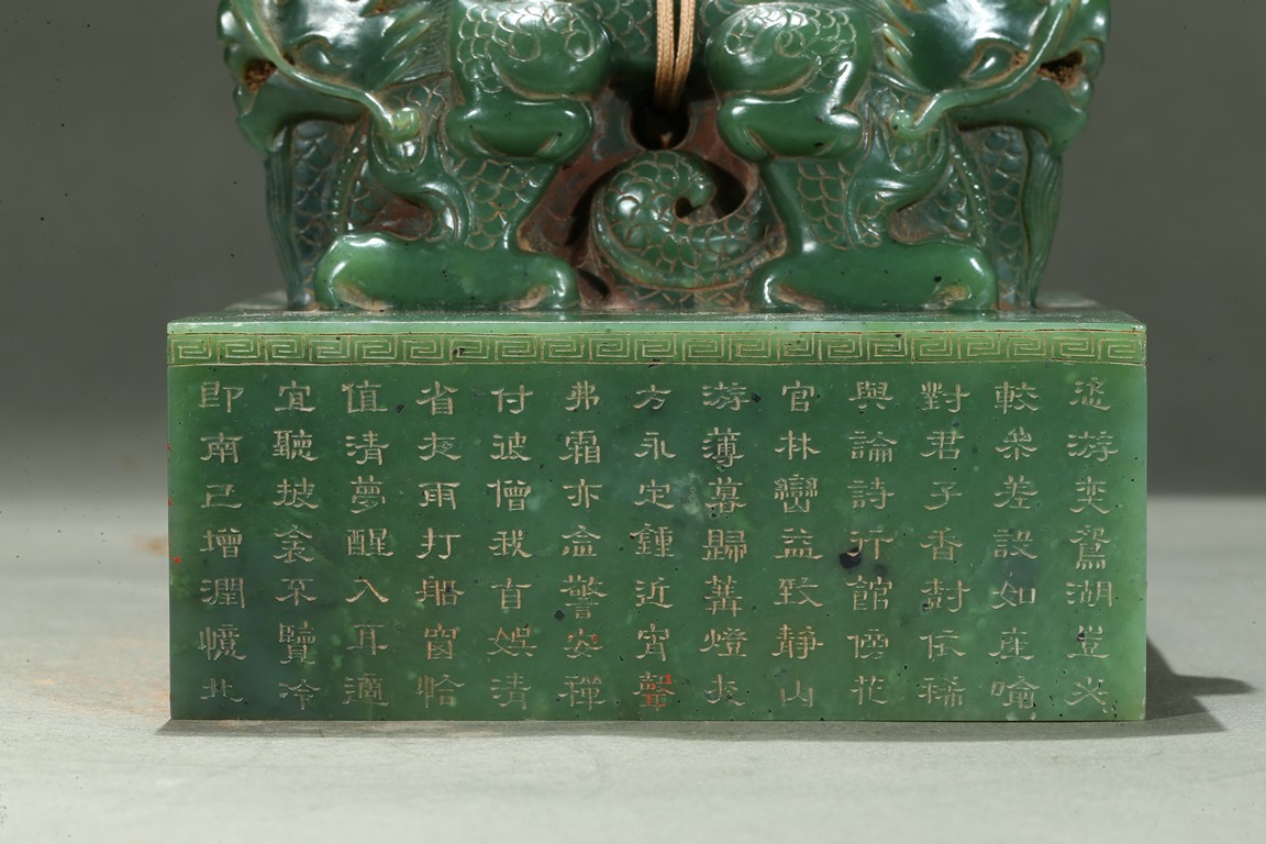 The square seal is surmounted with a mythical double-headed beast carved recumbent with scales and wings, the two pairs of opposing horns conjoining above the articulated spine, the side inscribed in gilt with imperial inscriptions, the base carved with four characters, the stone of a deep green tone with areas of darker speckling.