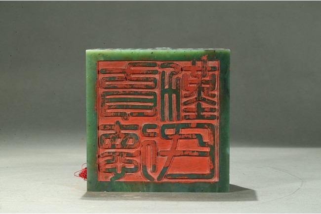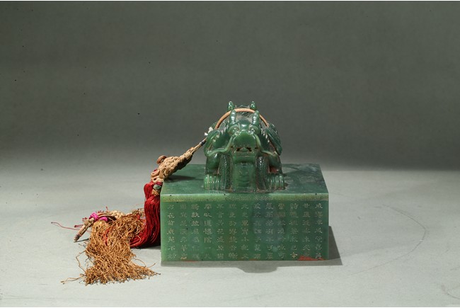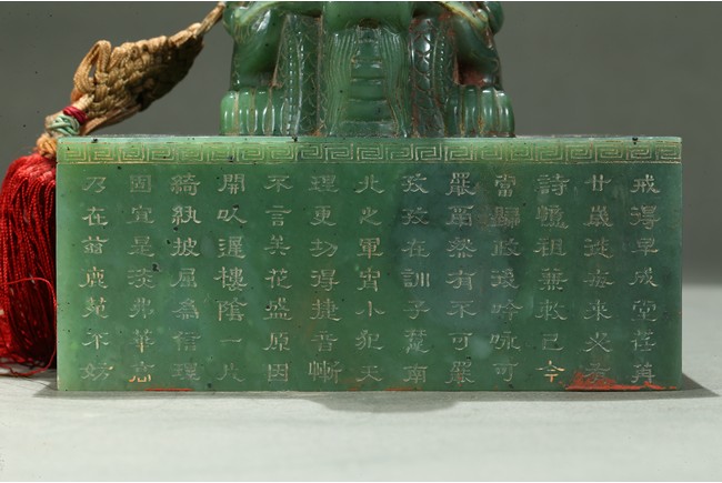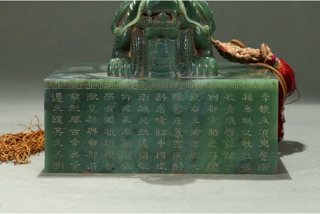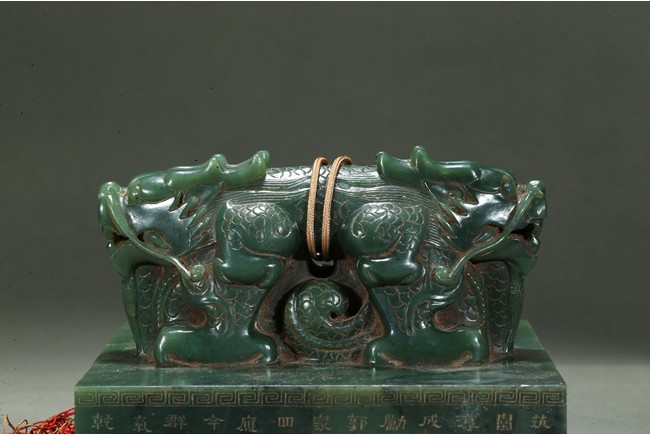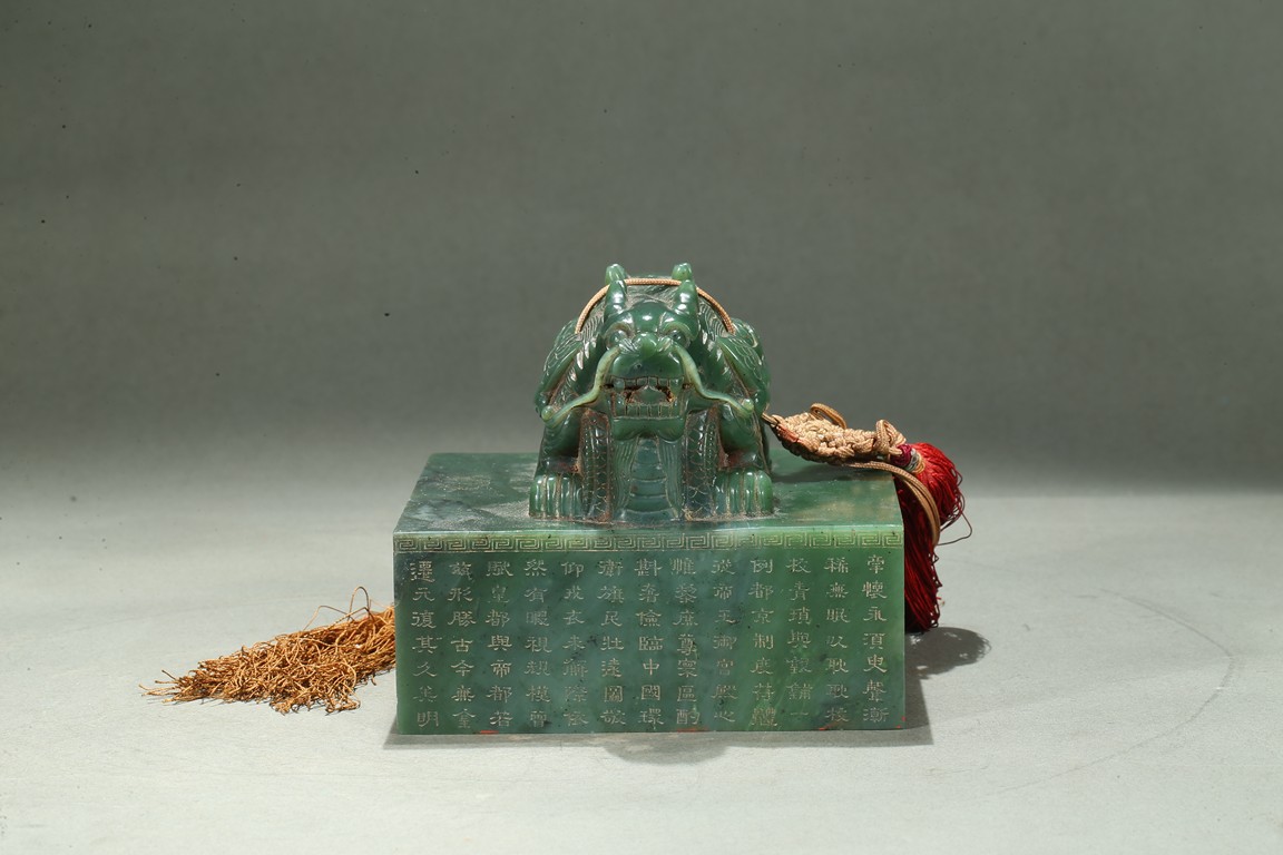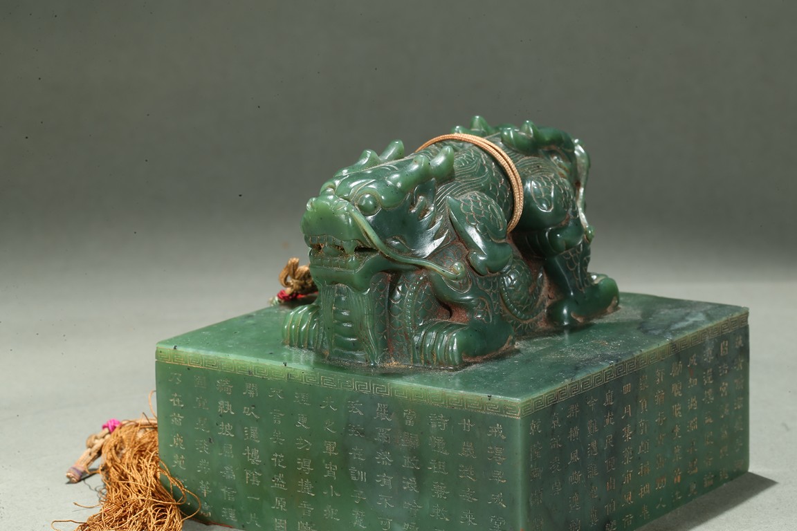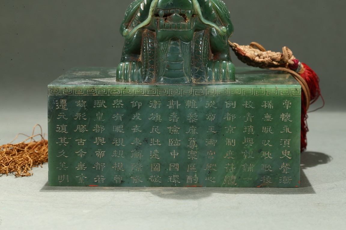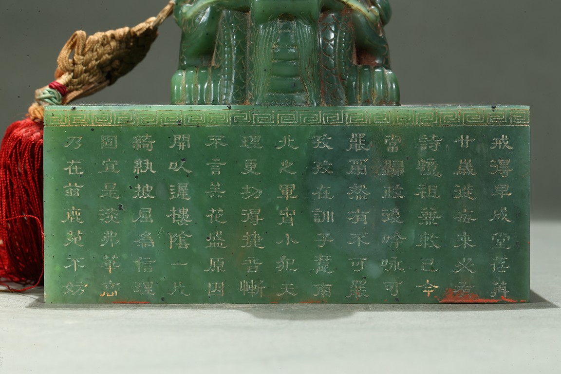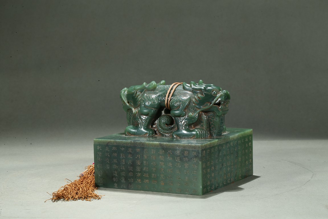 The square seal is surmounted with a mythical double-headed beast carved recumbent with scales and wings, the two pairs of opposing horns conjoining above the articulated spine, the side inscribed in gilt with imperial inscriptions, the base carved with four characters, the stone of a deep green tone with areas of darker speckling.