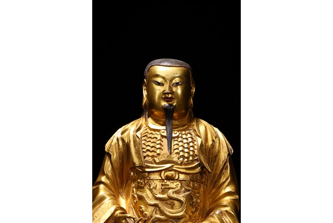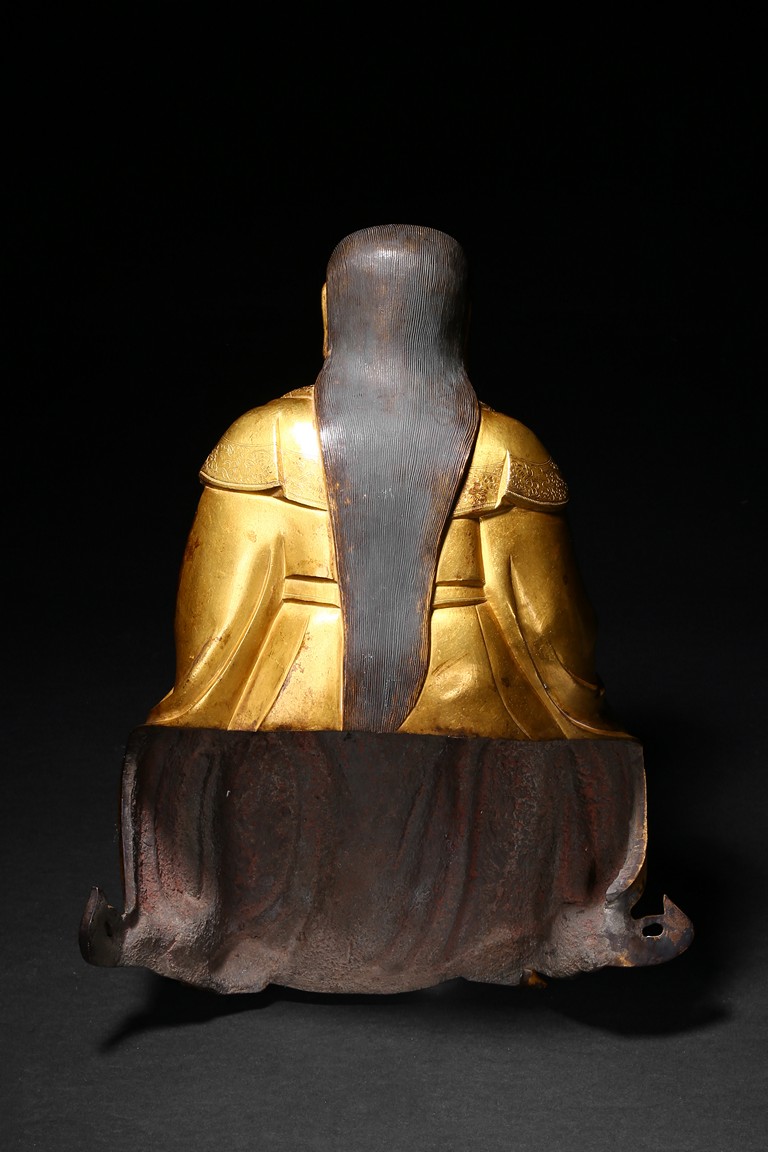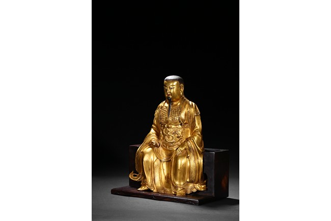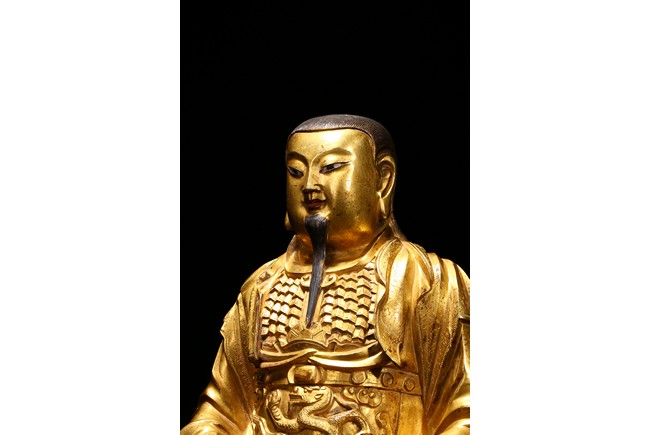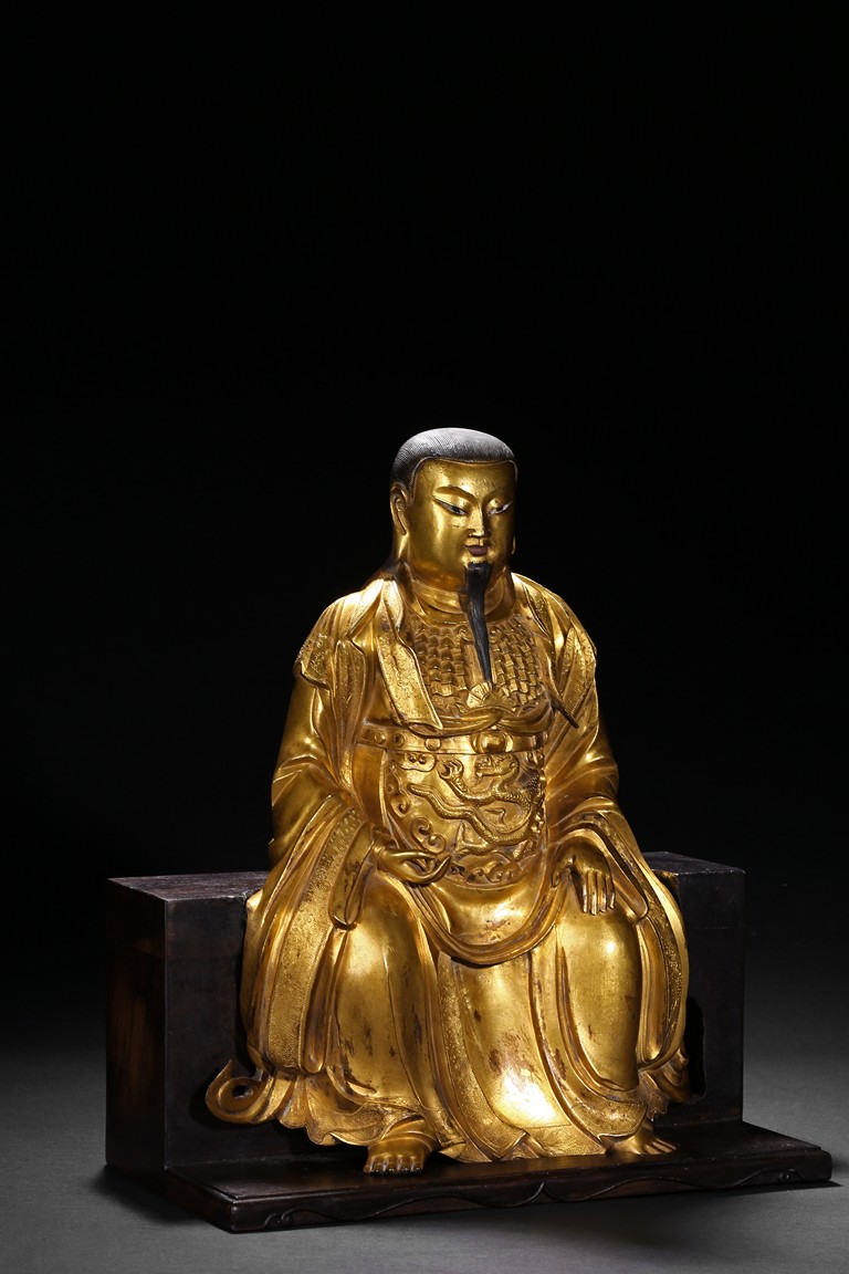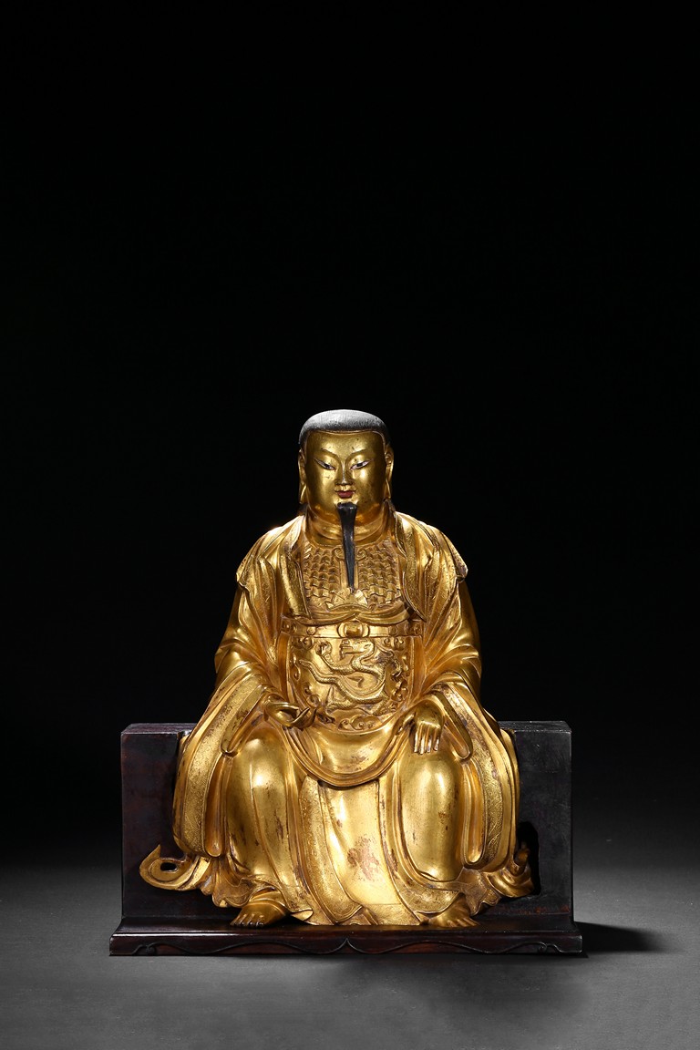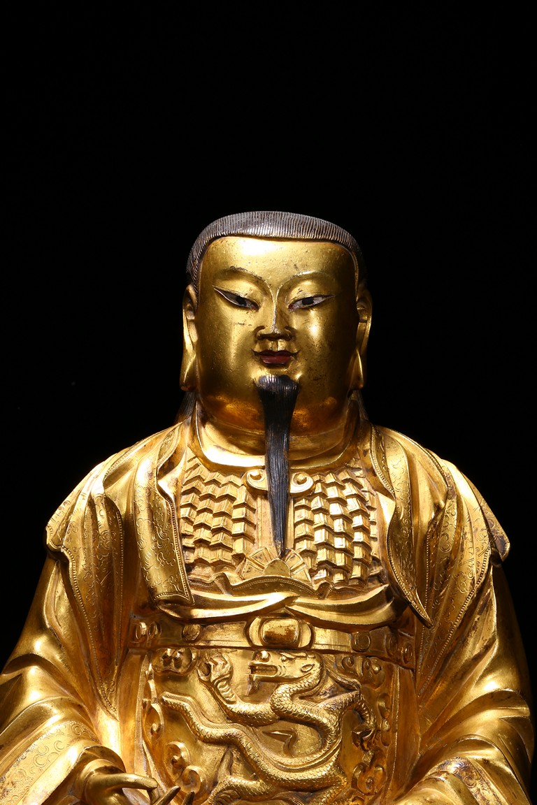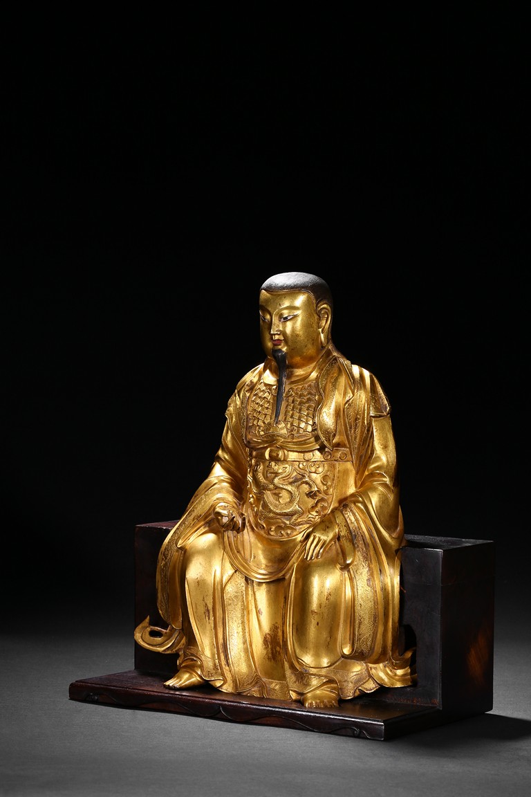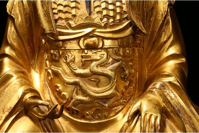 The 'Perfected Warrior' is shown seated with his hands resting on his knees, wearing armor beneath his full robe that is decorated on the front with a dragon leaping in profile below his court belt. His long hair is combed back smoothly to fall below his waist in back.