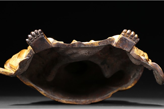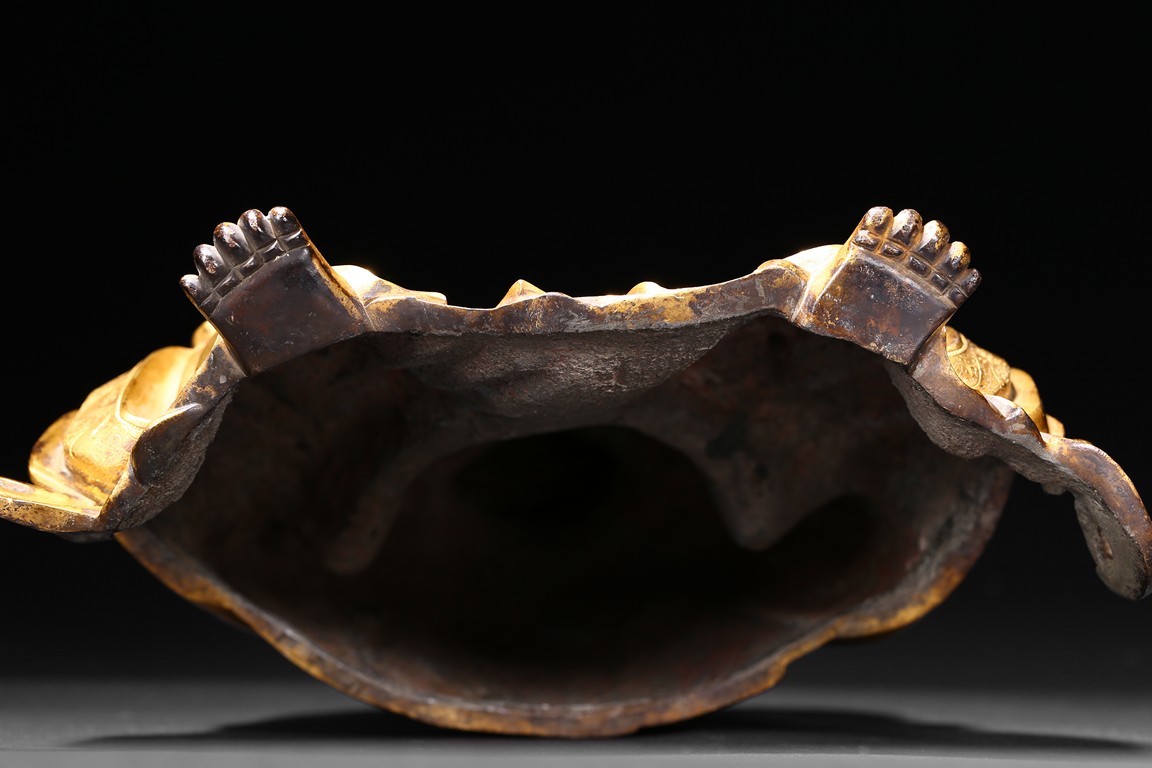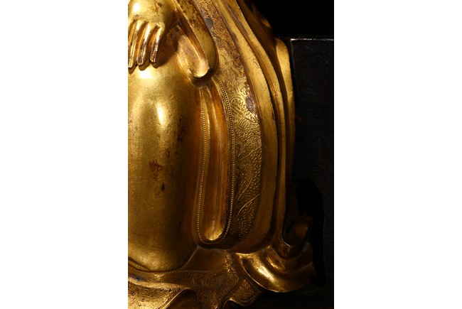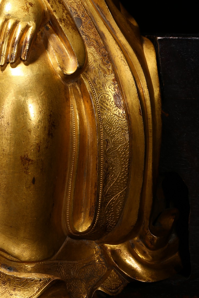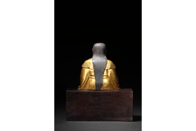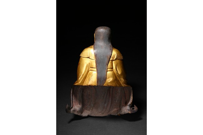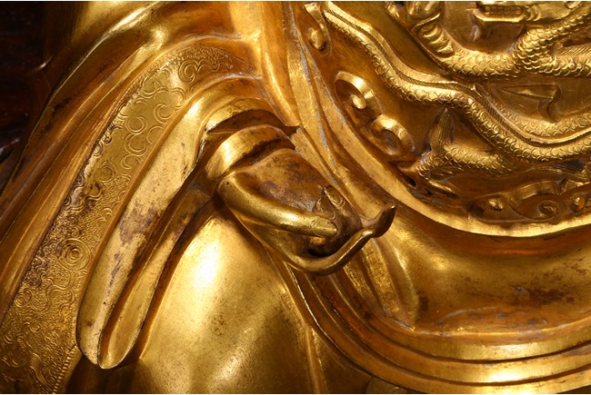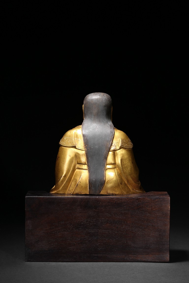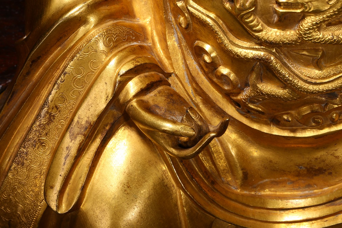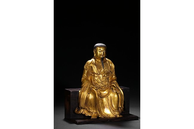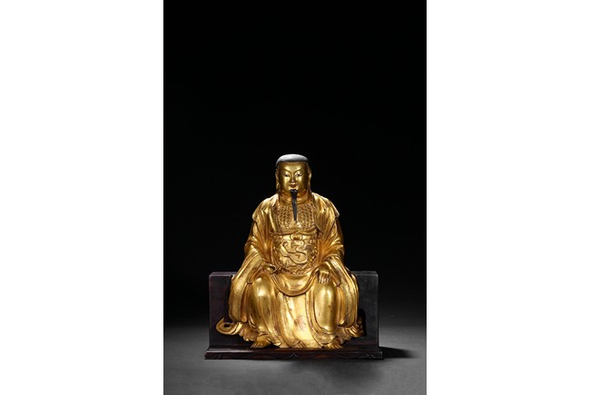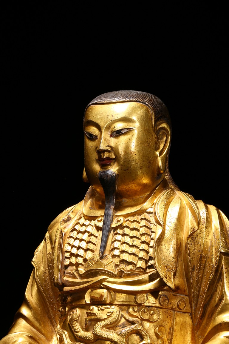 The 'Perfected Warrior' is shown seated with his hands resting on his knees, wearing armor beneath his full robe that is decorated on the front with a dragon leaping in profile below his court belt. His long hair is combed back smoothly to fall below his waist in back.