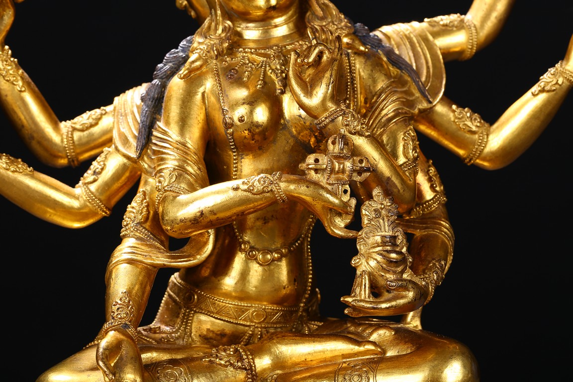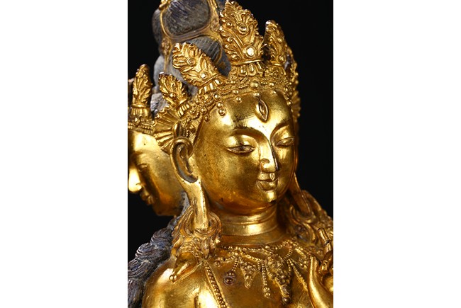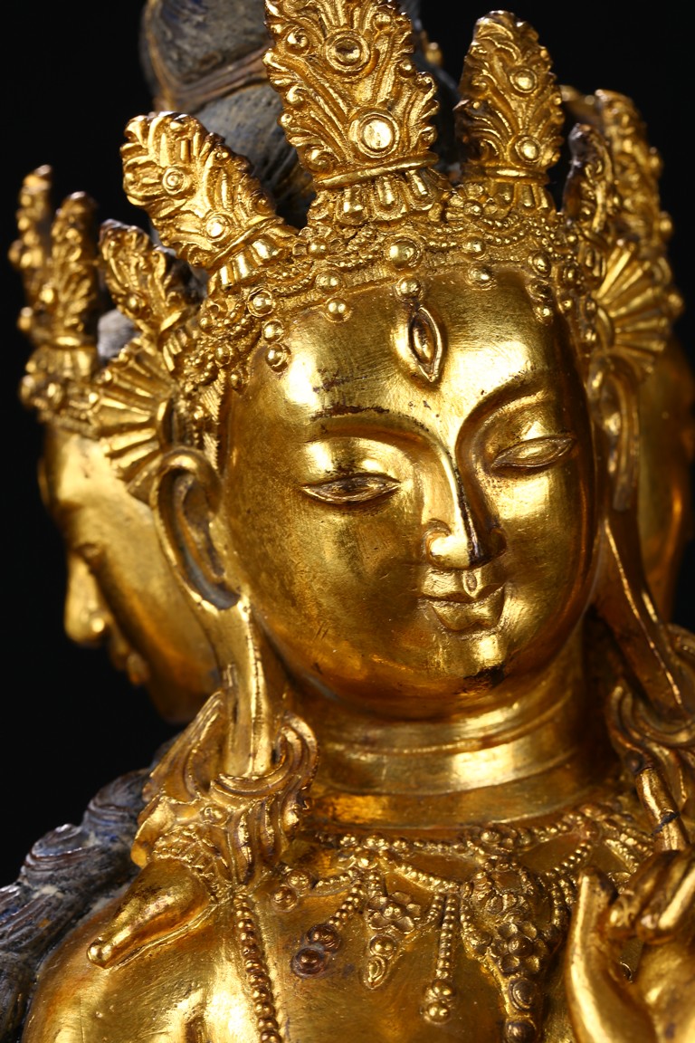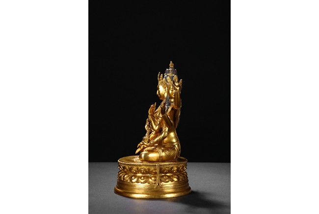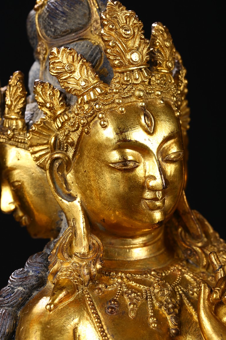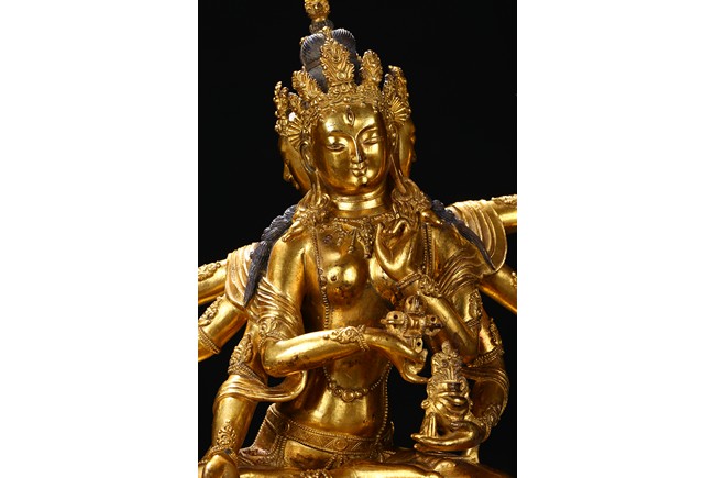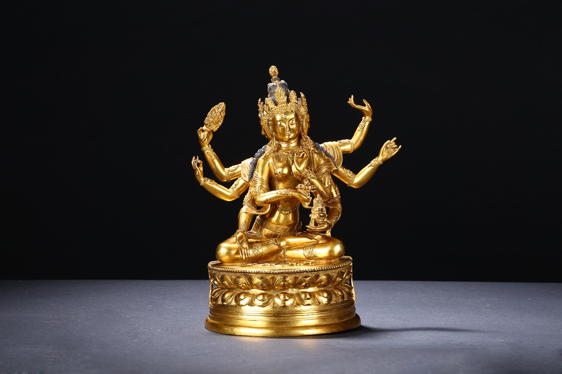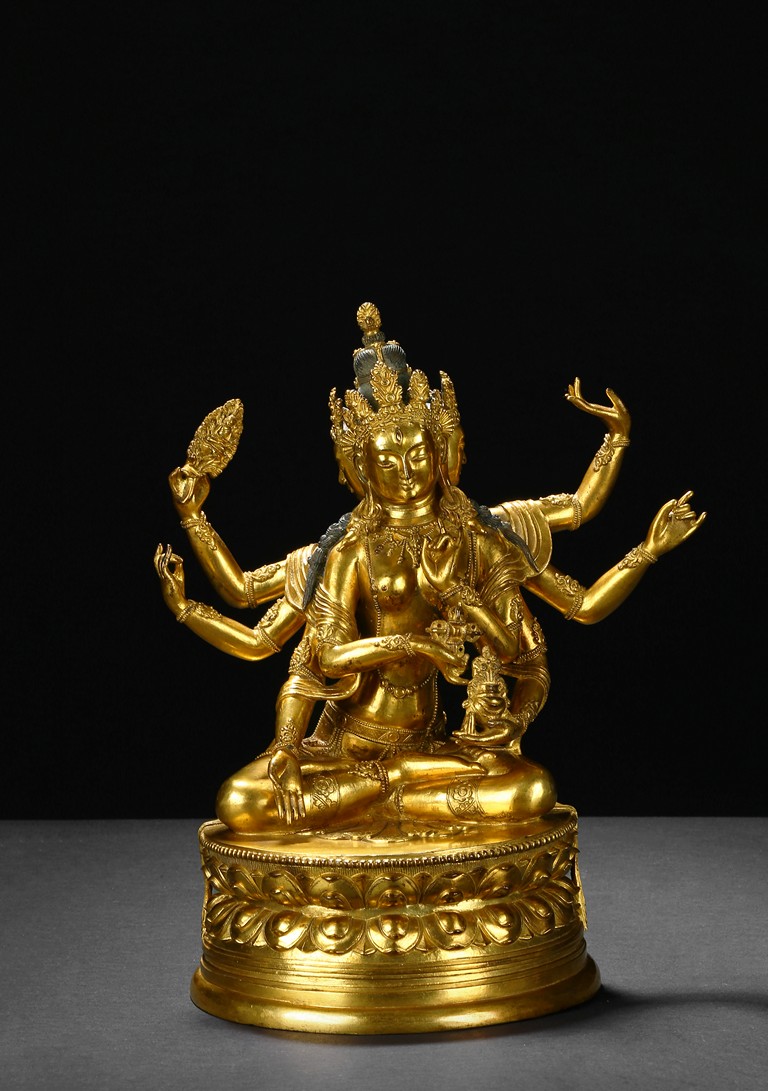 Zanabazar school. The three faced and eight armed bodhisattva is shown seated in dhyanasana on a double lotus throne, her radiating arms shown carrying various attributes including visvavajra, vase, and a small buddha. Her body adorned with elaborate beaded jewellry, face shown with peaceful expression, framed by a jeweled tiara enclosing a tall chignon. Base sealed. Qing Dynasty period.