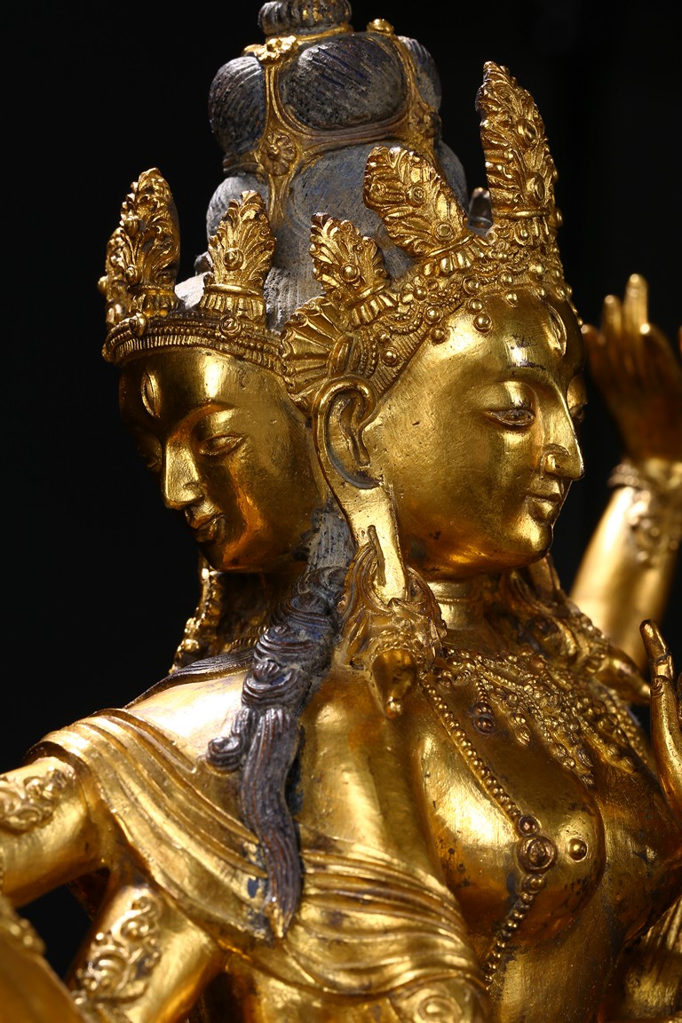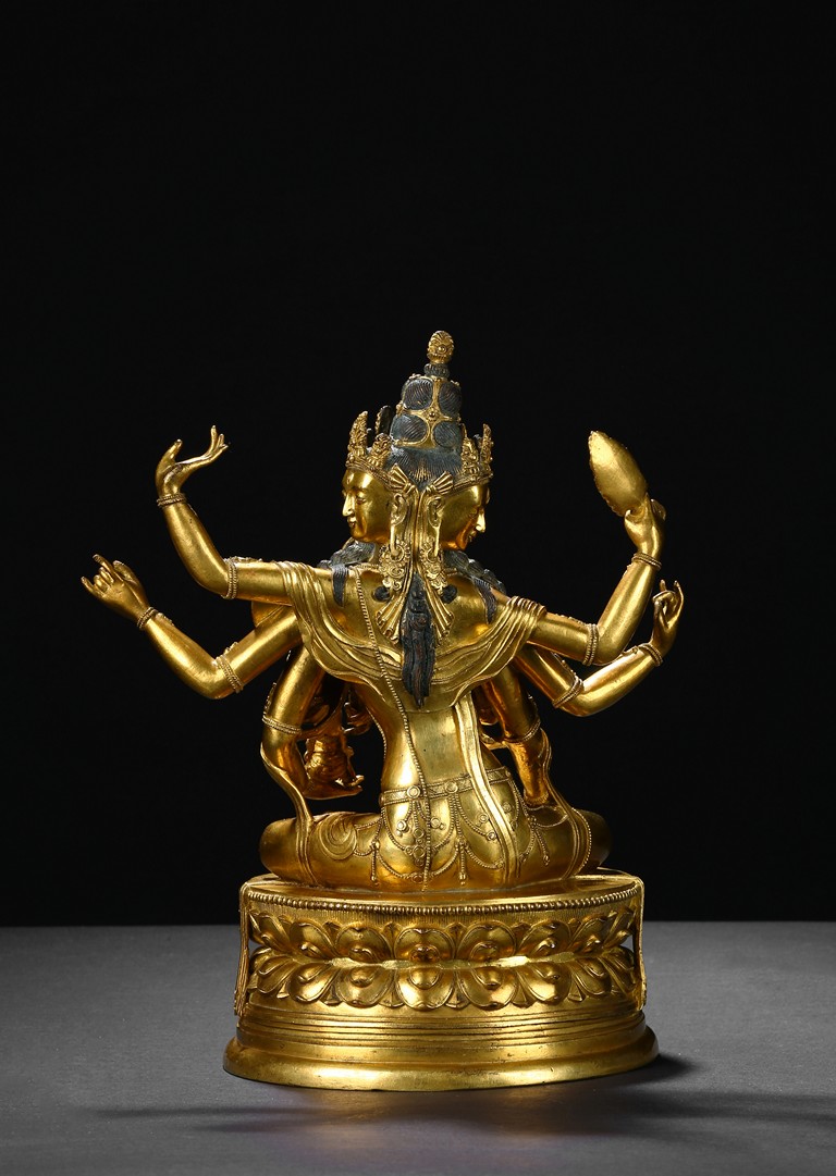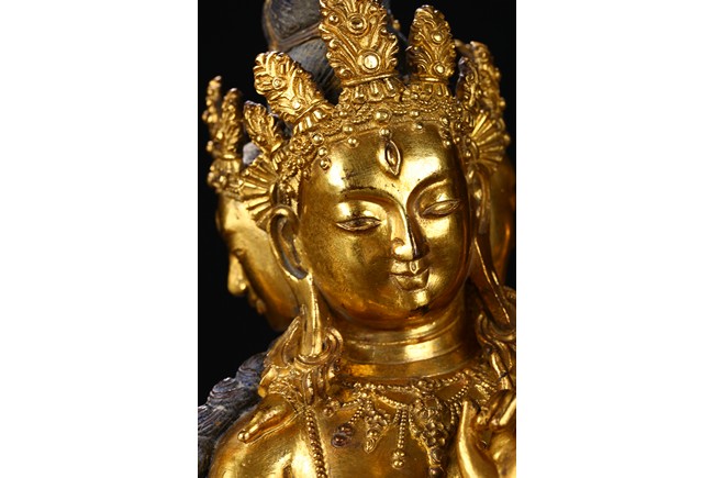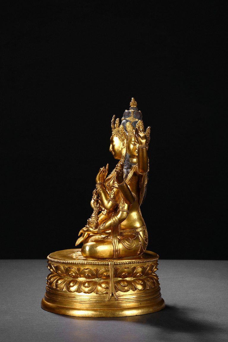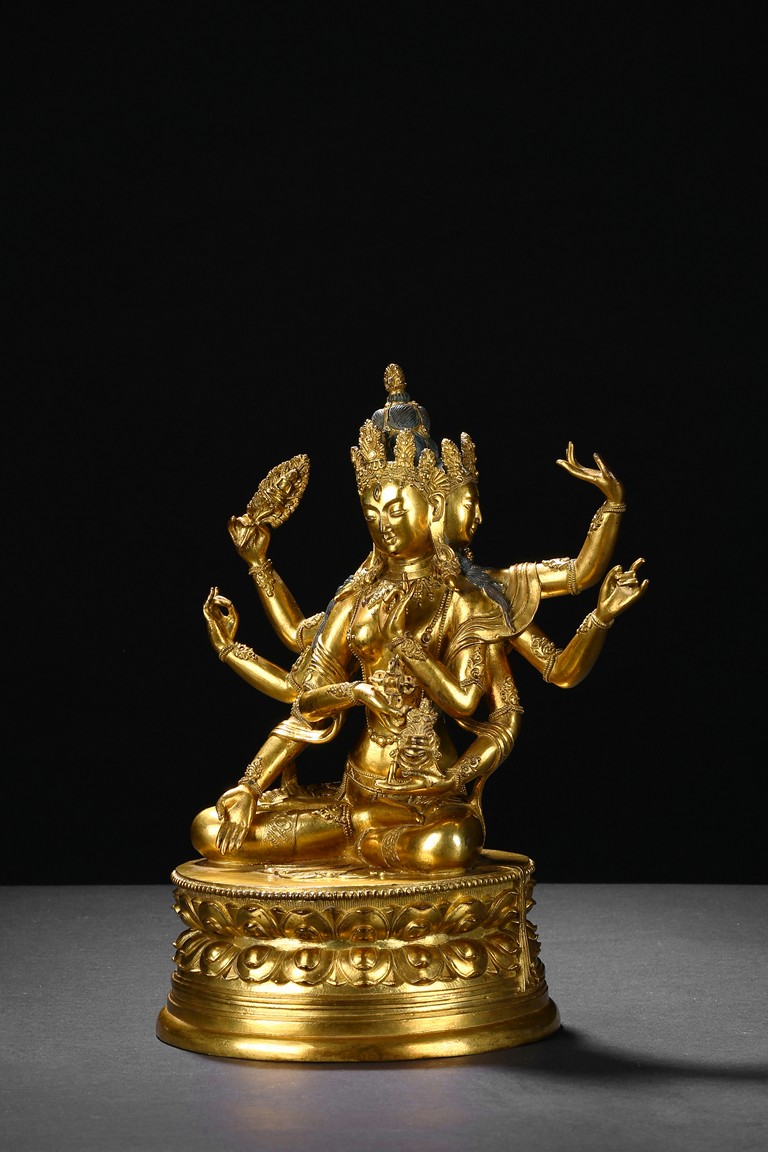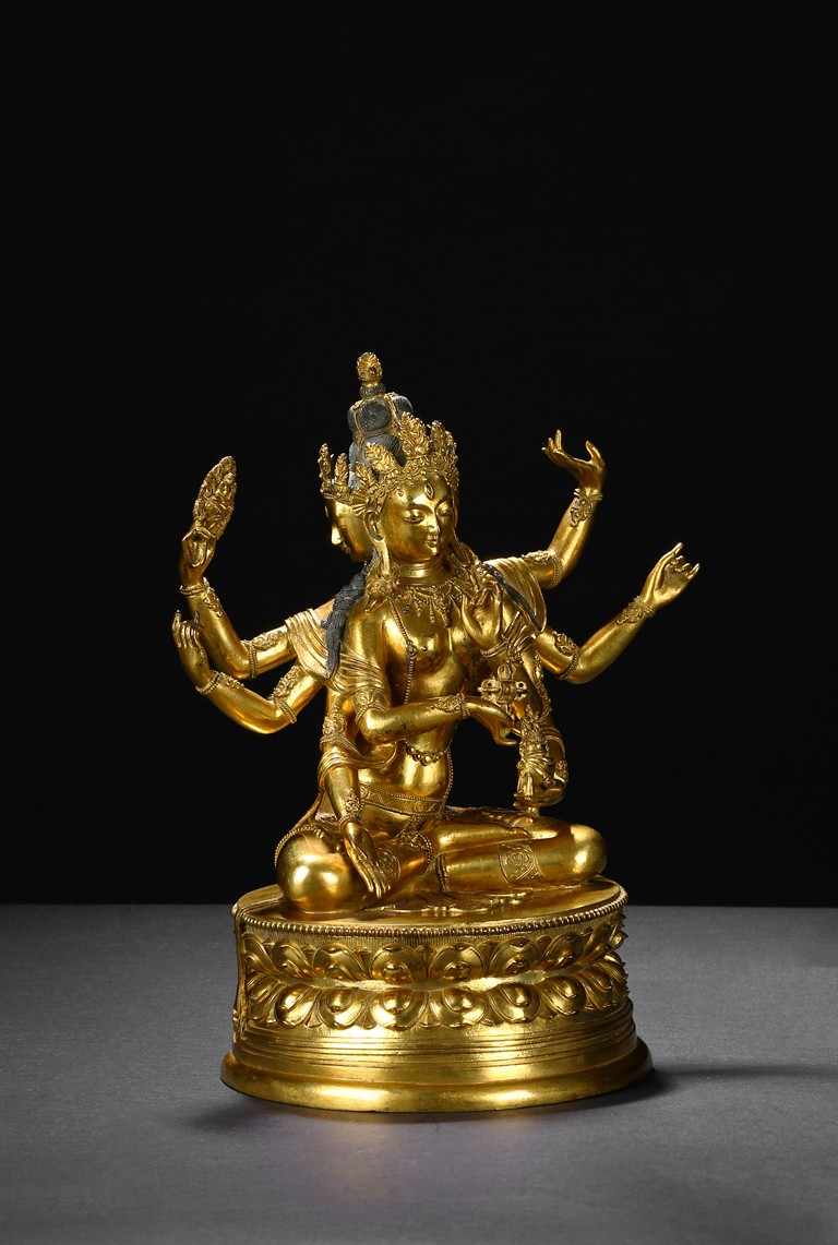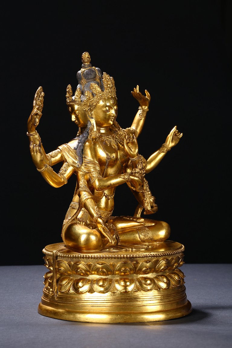 Zanabazar school. The three faced and eight armed bodhisattva is shown seated in dhyanasana on a double lotus throne, her radiating arms shown carrying various attributes including visvavajra, vase, and a small buddha. Her body adorned with elaborate beaded jewellry, face shown with peaceful expression, framed by a jeweled tiara enclosing a tall chignon. Base sealed. Qing Dynasty period.