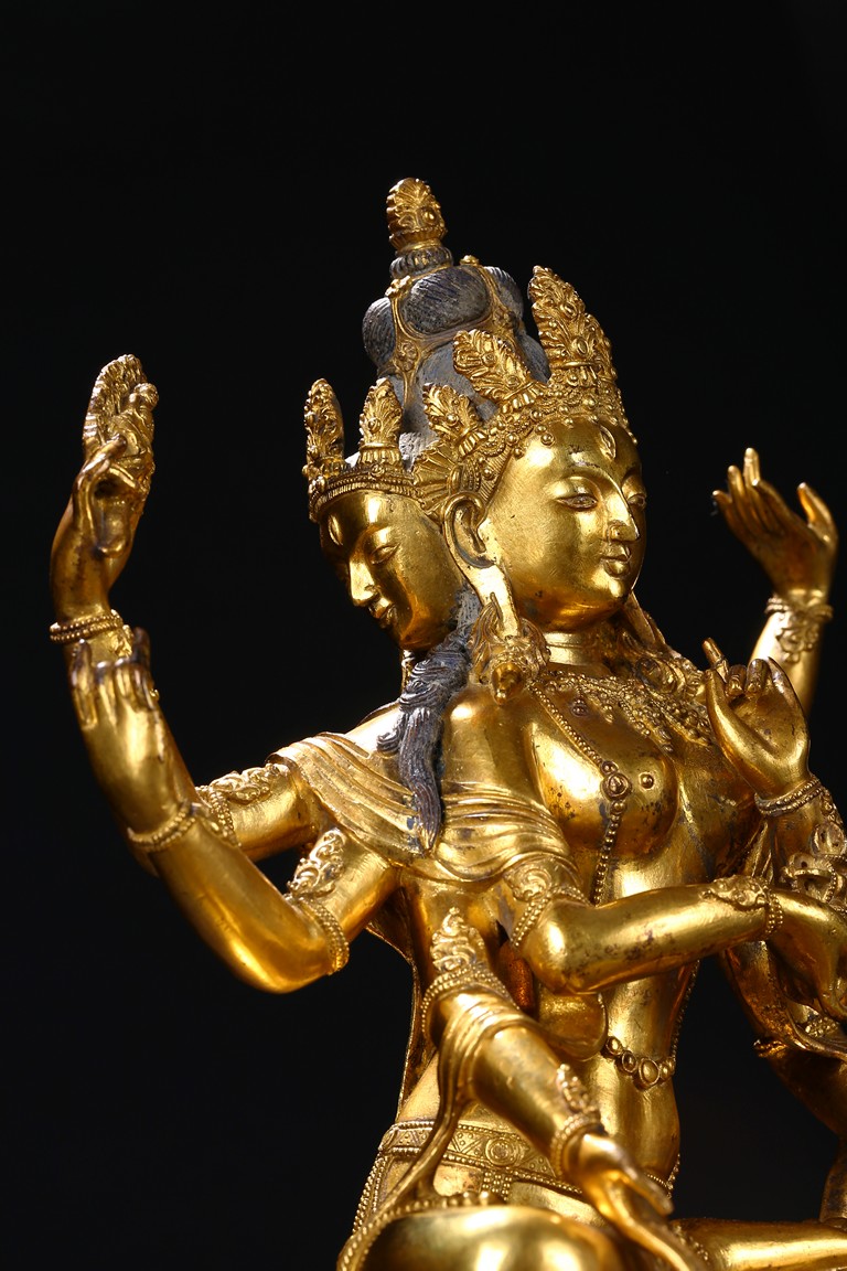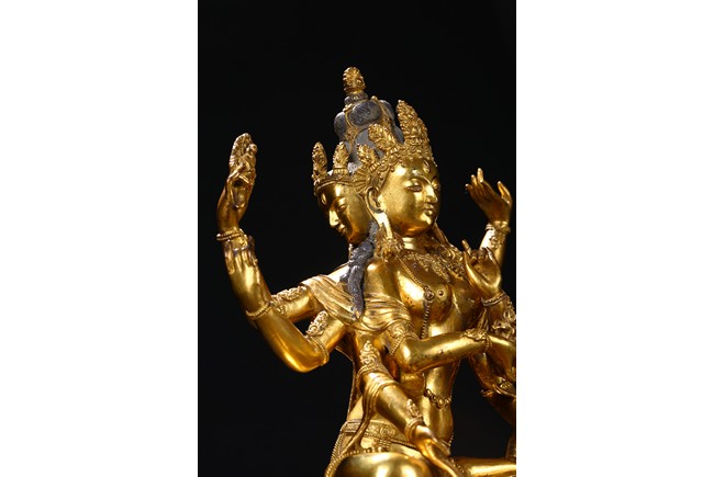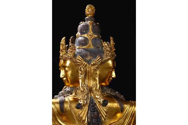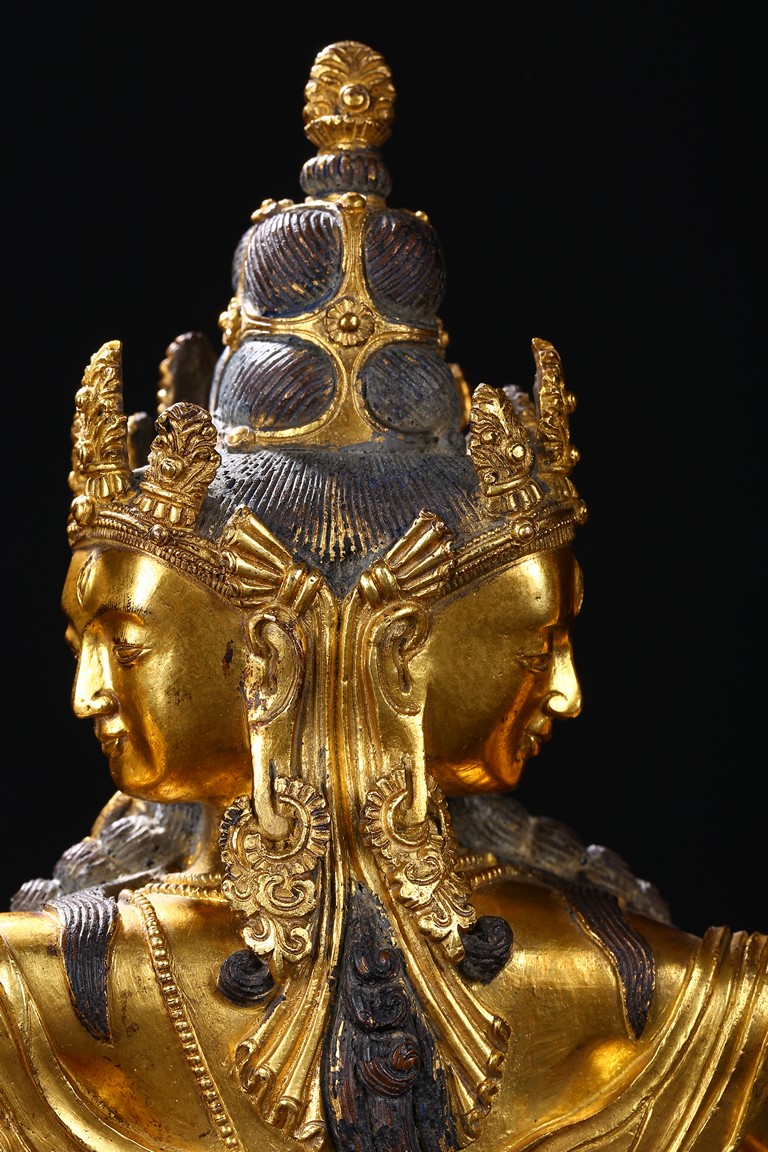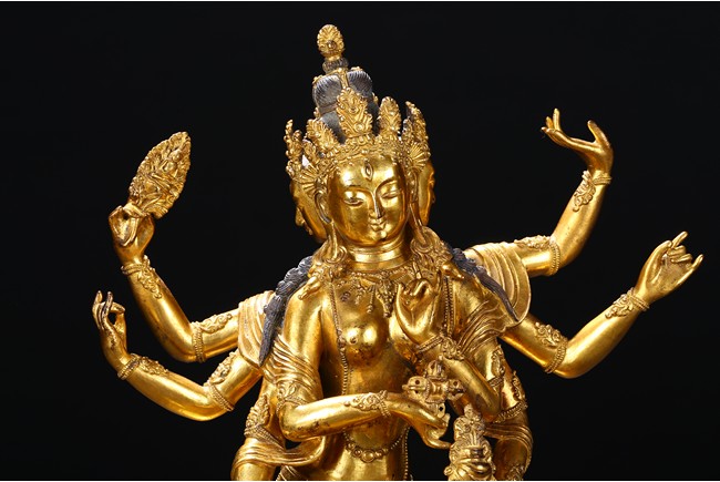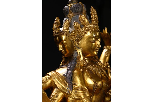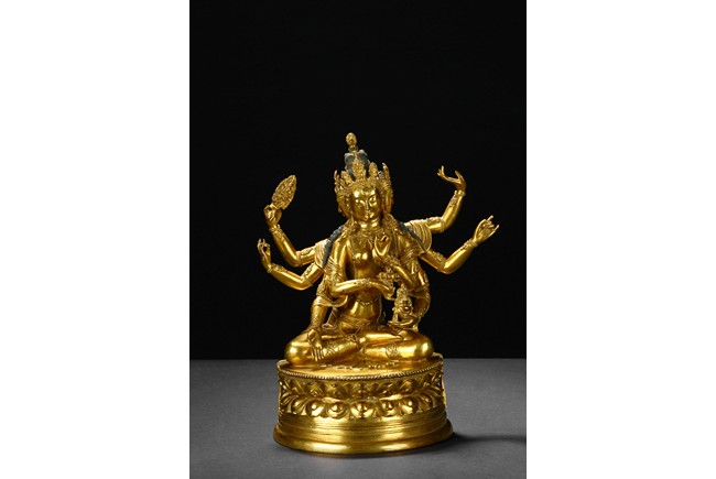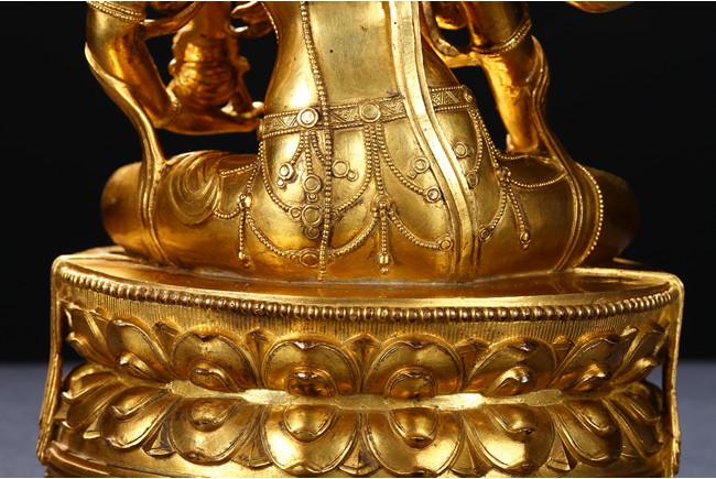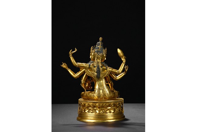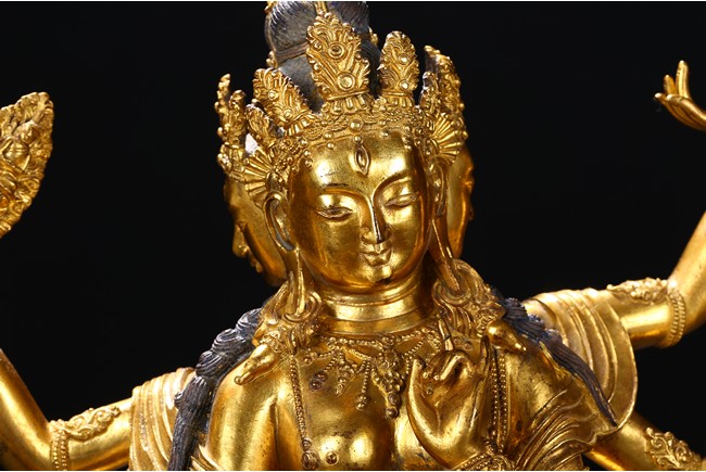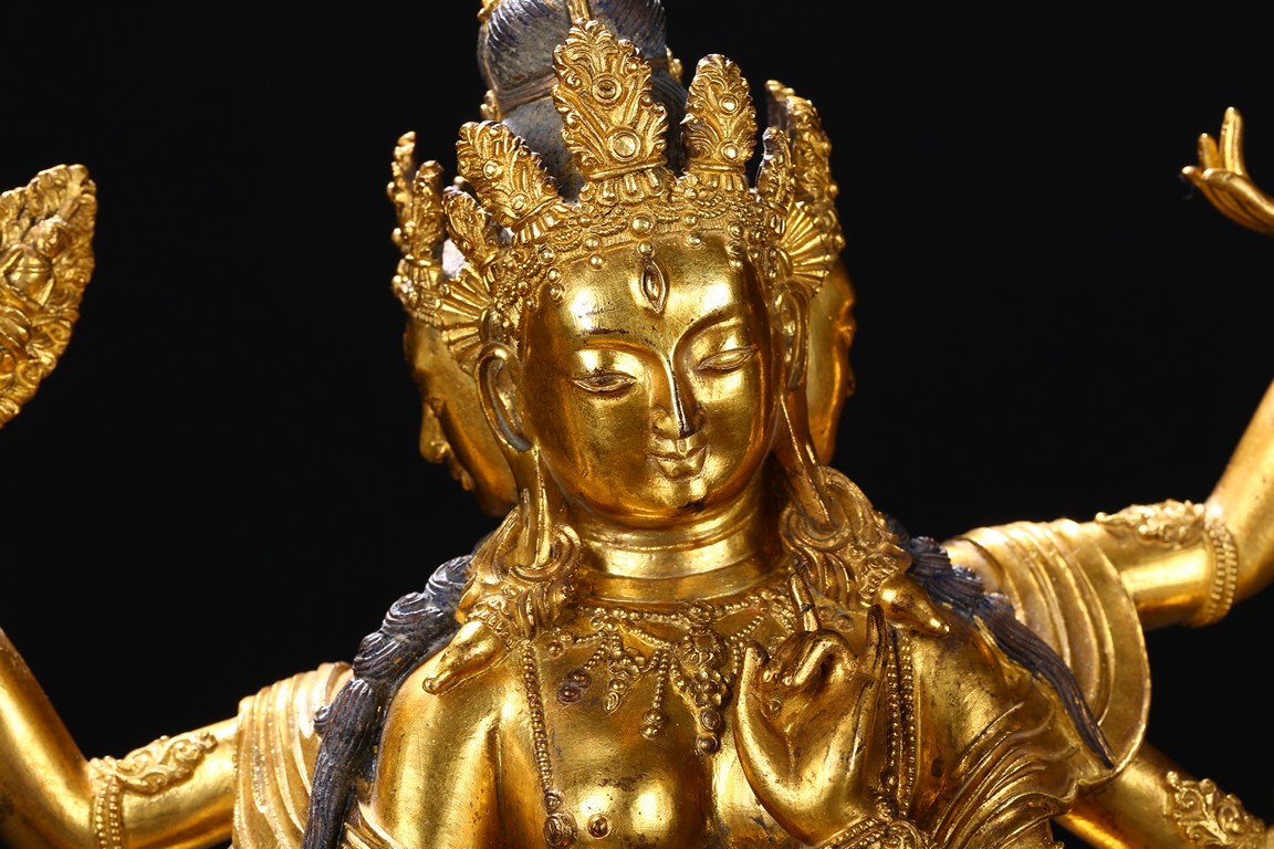 Zanabazar school. The three faced and eight armed bodhisattva is shown seated in dhyanasana on a double lotus throne, her radiating arms shown carrying various attributes including visvavajra, vase, and a small buddha. Her body adorned with elaborate beaded jewellry, face shown with peaceful expression, framed by a jeweled tiara enclosing a tall chignon. Base sealed. Qing Dynasty period.