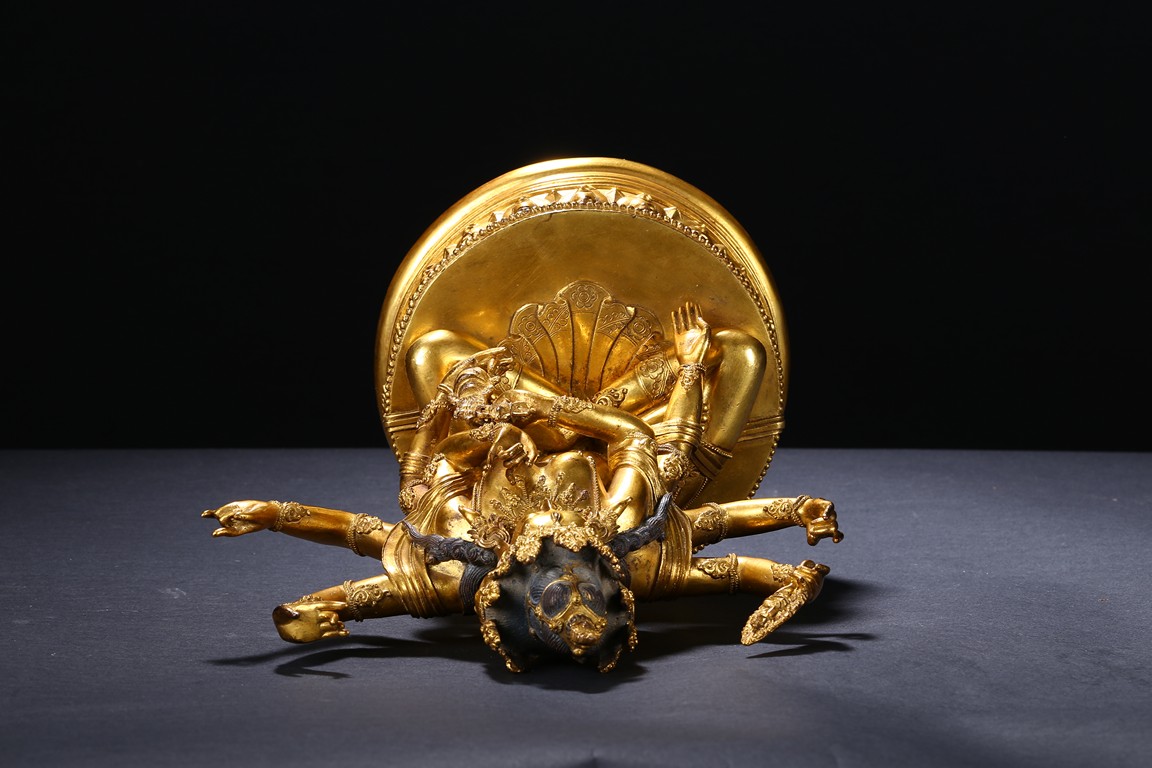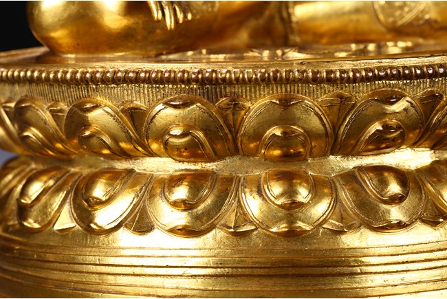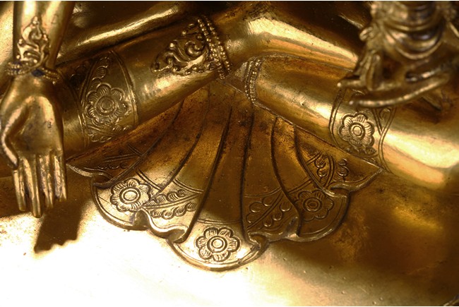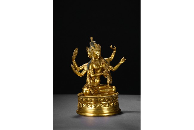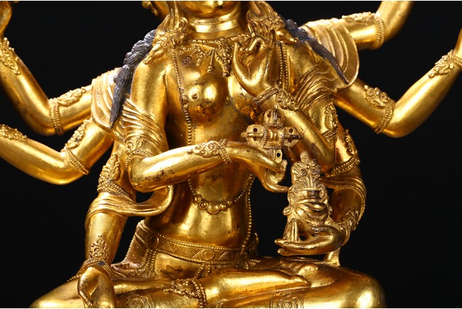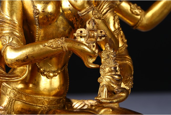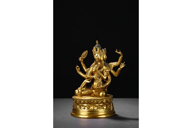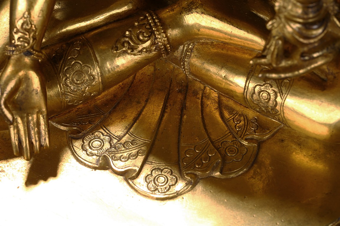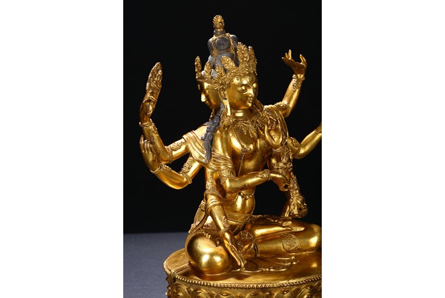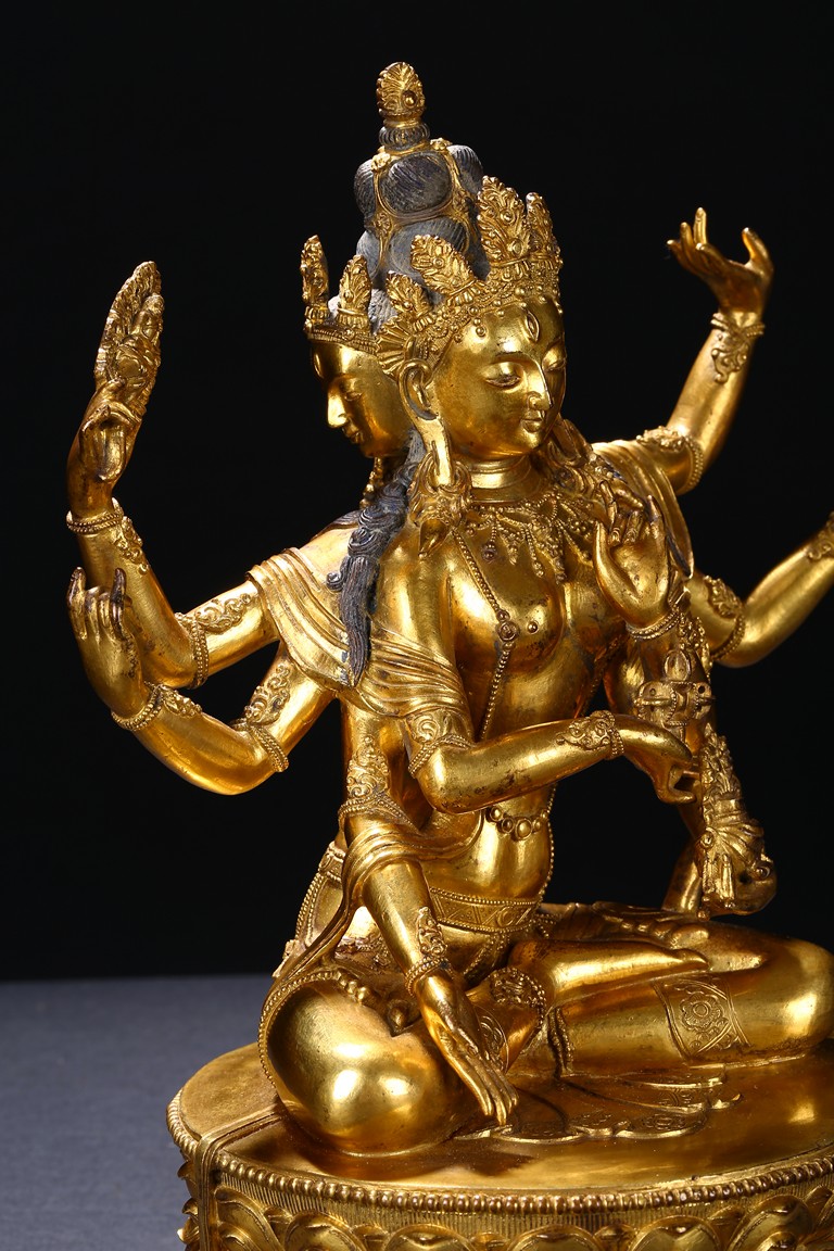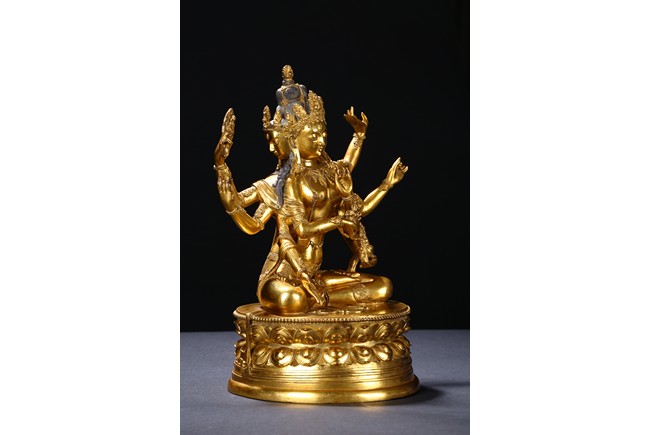 Zanabazar school. The three faced and eight armed bodhisattva is shown seated in dhyanasana on a double lotus throne, her radiating arms shown carrying various attributes including visvavajra, vase, and a small buddha. Her body adorned with elaborate beaded jewellry, face shown with peaceful expression, framed by a jeweled tiara enclosing a tall chignon. Base sealed. Qing Dynasty period.