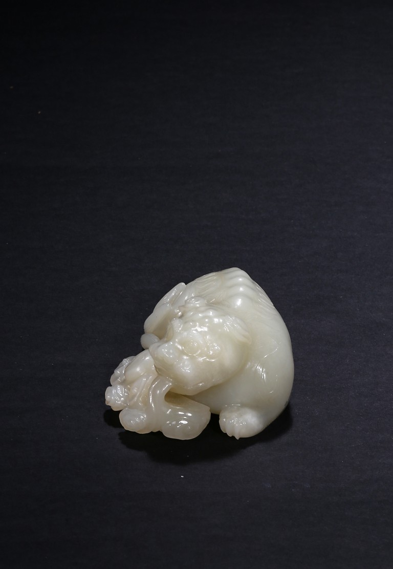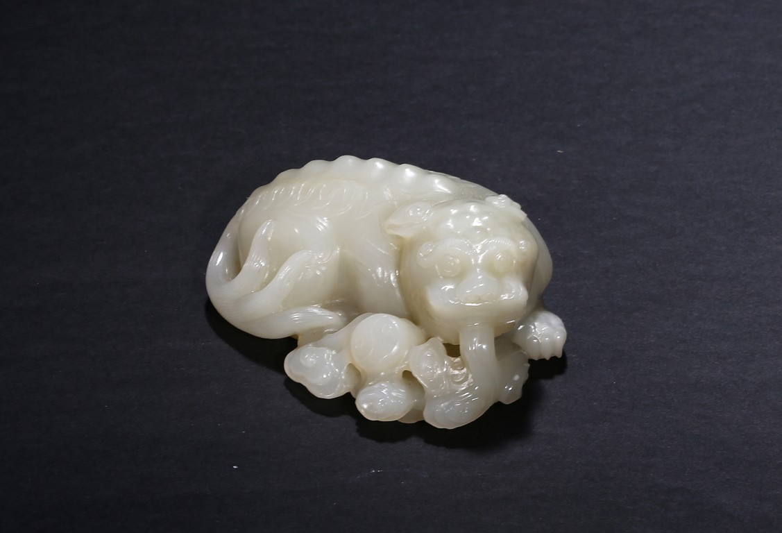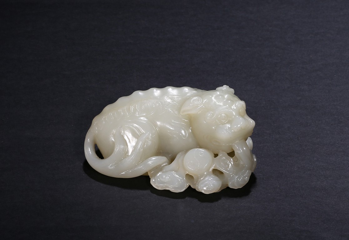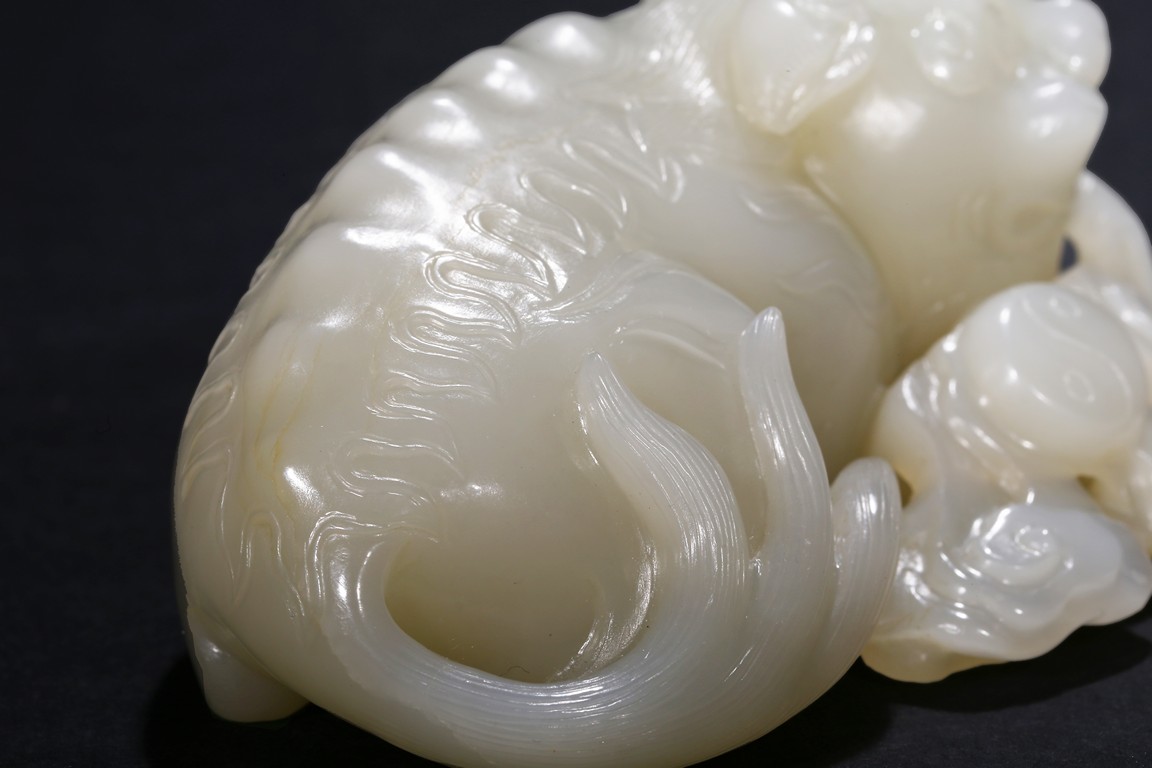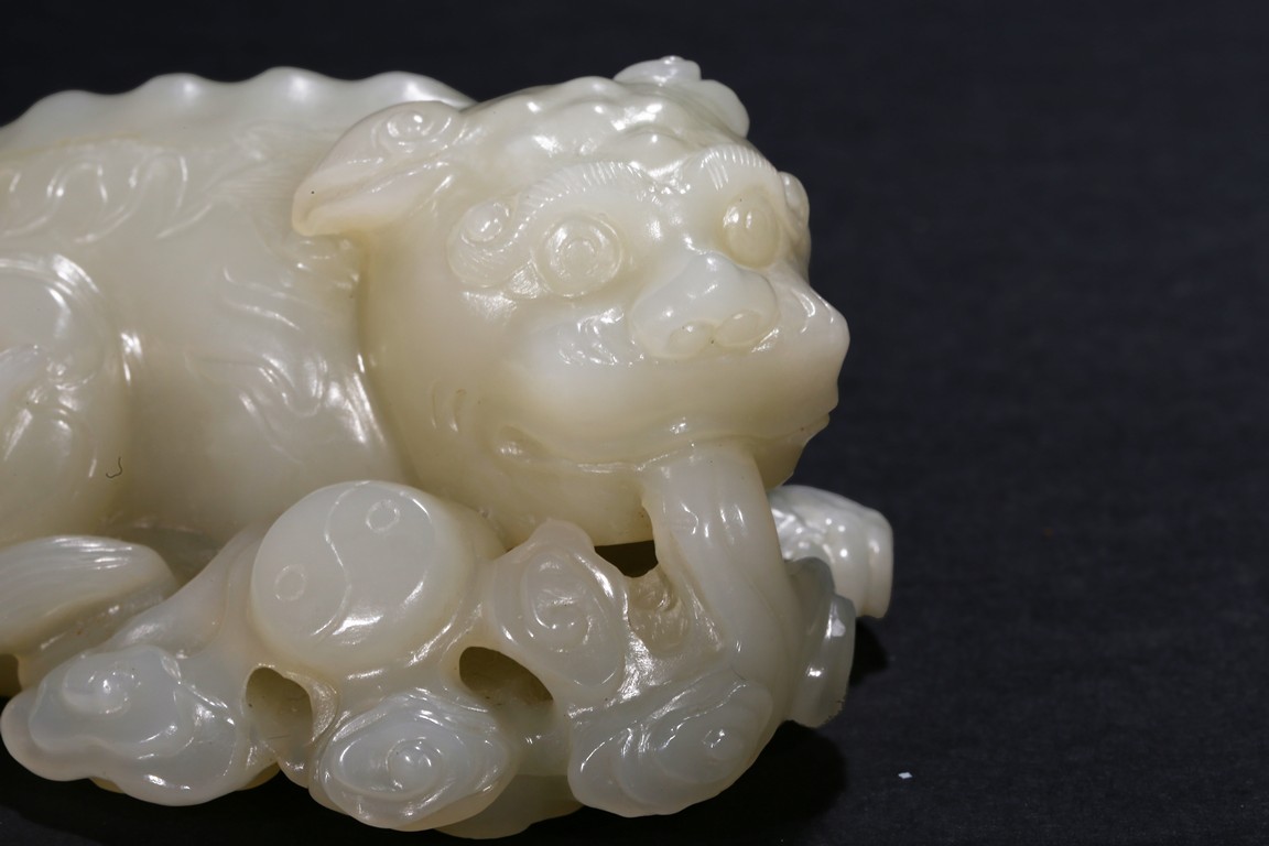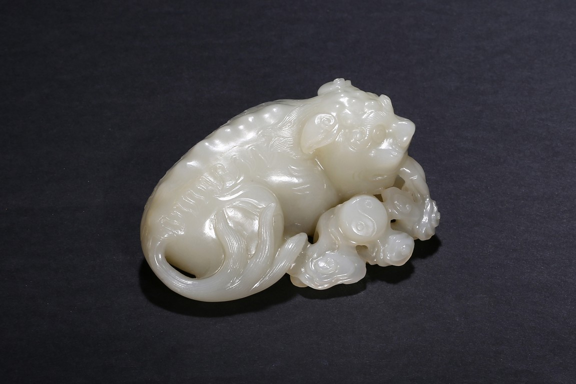 The recumbent mythical beast with its splitted bushy tail curled between its hind legs, its head turned to one side, detailed with bulging eyes, flaring nostrils and a pair of funnel-shaped ears, with smoke emitting from its mouth, the stone of an attractive smooth and even white tone. Qing Dynasty period.