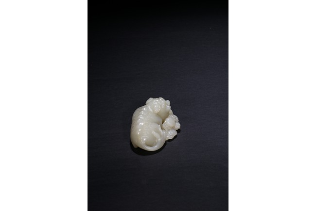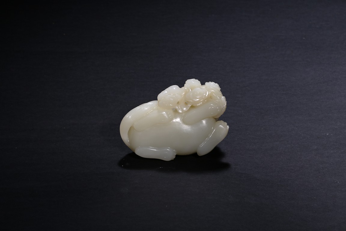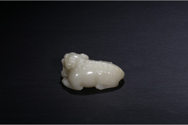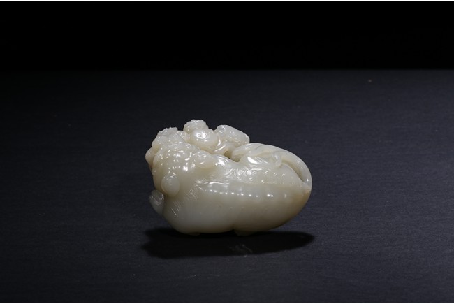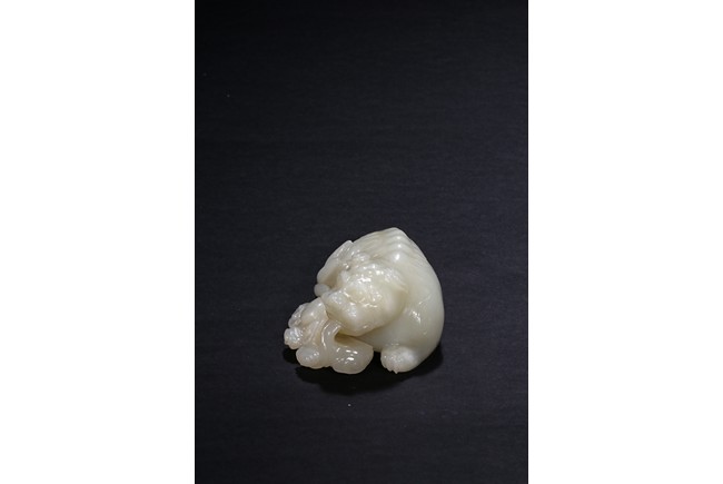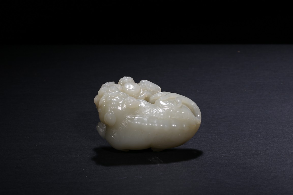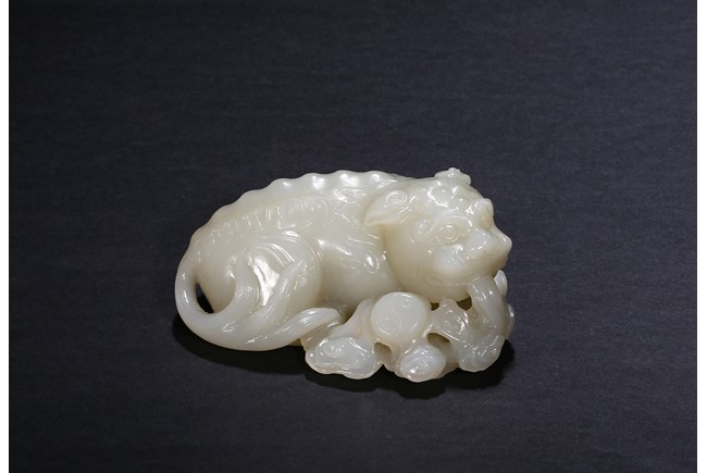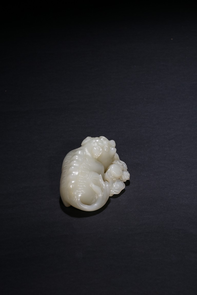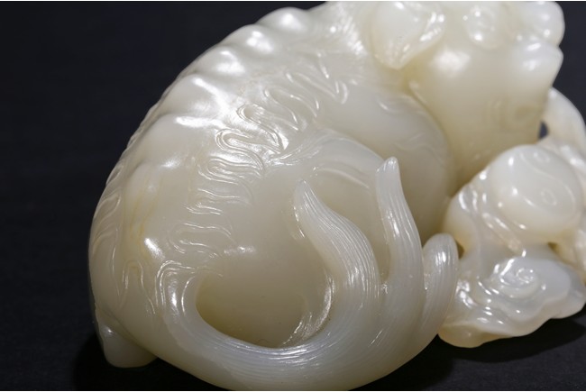 The recumbent mythical beast with its splitted bushy tail curled between its hind legs, its head turned to one side, detailed with bulging eyes, flaring nostrils and a pair of funnel-shaped ears, with smoke emitting from its mouth, the stone of an attractive smooth and even white tone. Qing Dynasty period.
