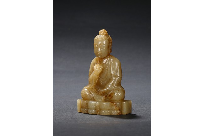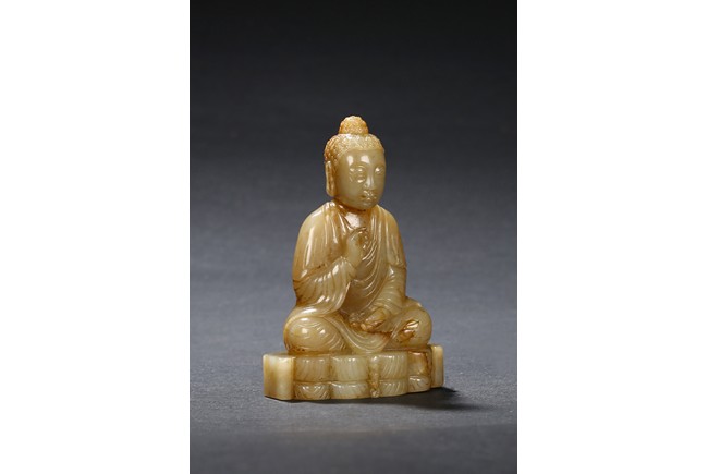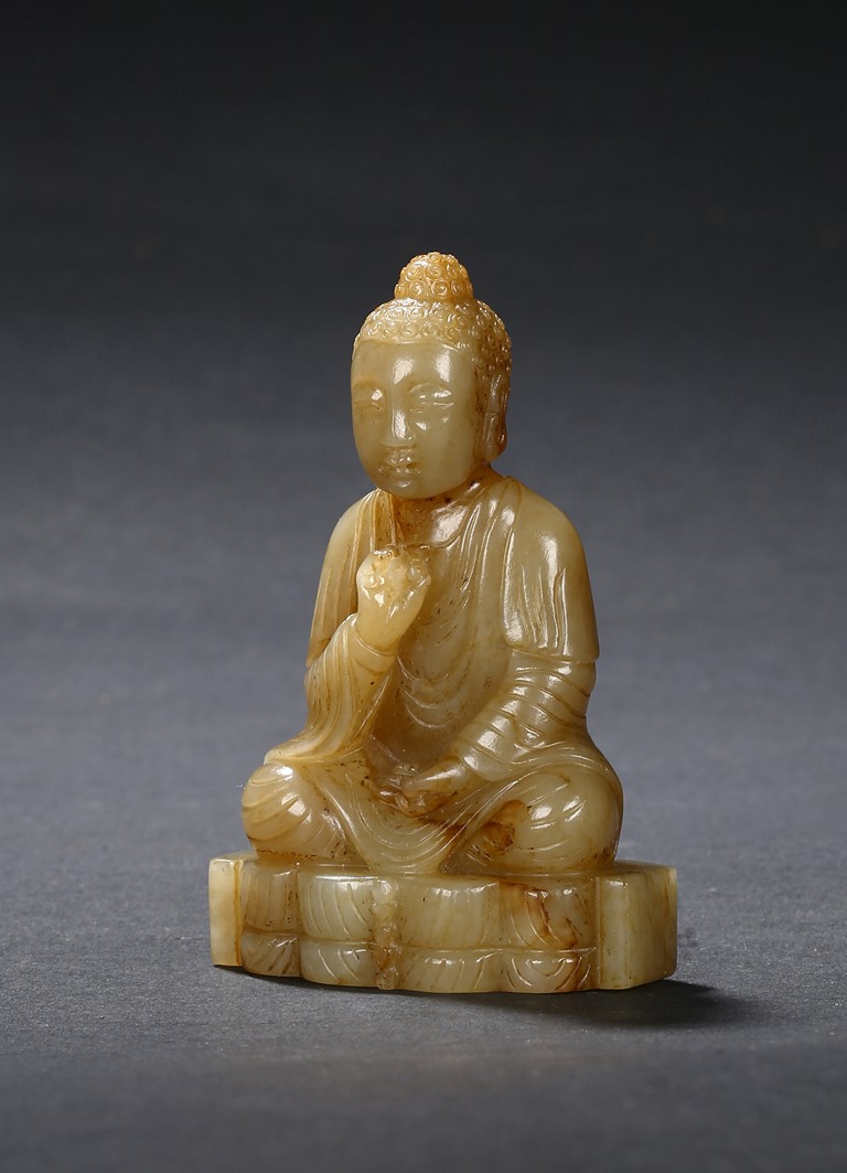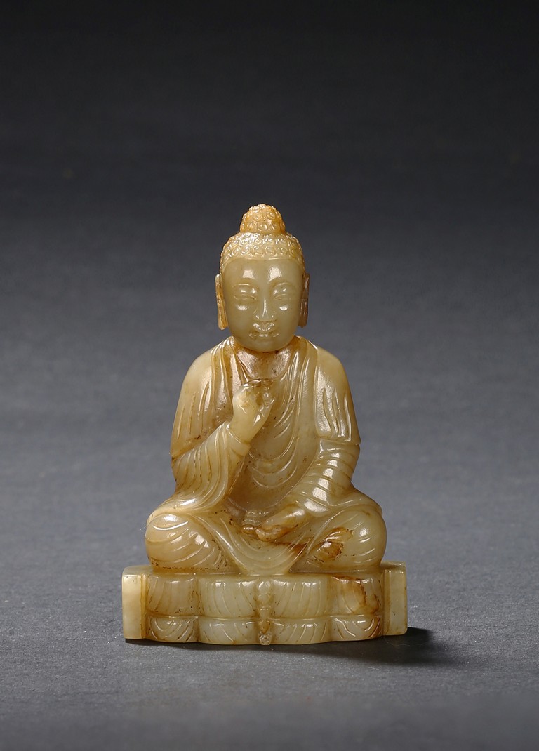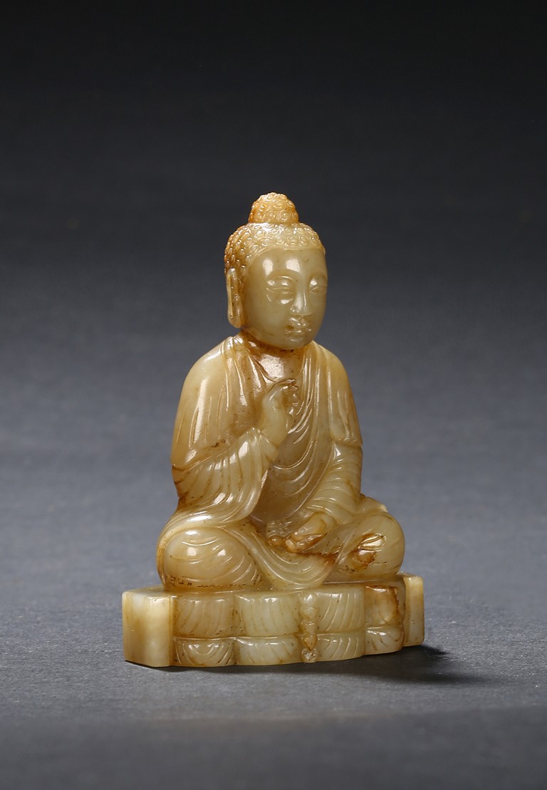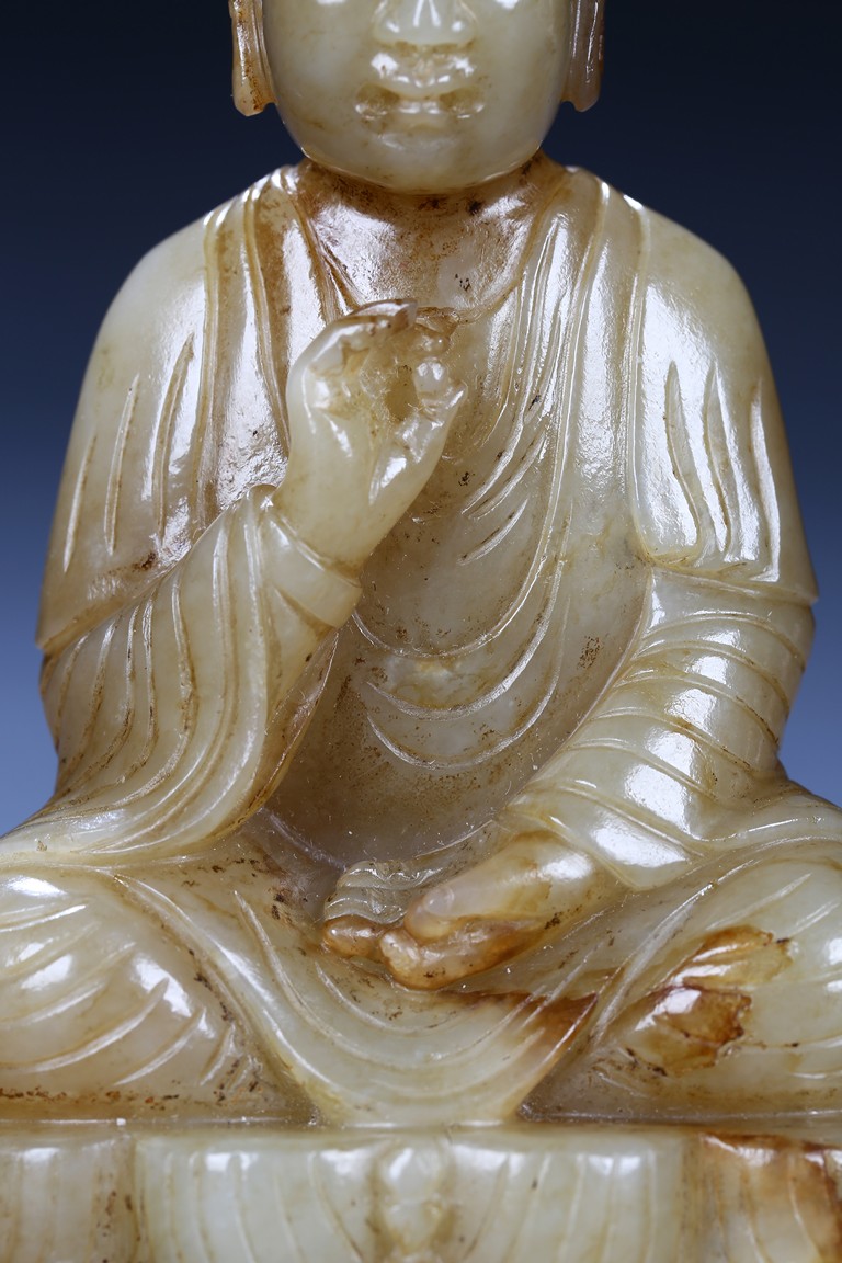The figure is seated on a stepped base wearing long flowing robes falling in elegant folds, his right hand is raised in vitarkamudra, and his left lowered to rest on his lap.Yuan/Early Ming Dynasty period.