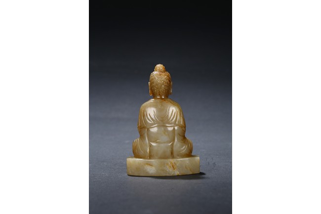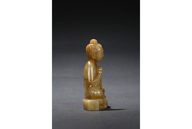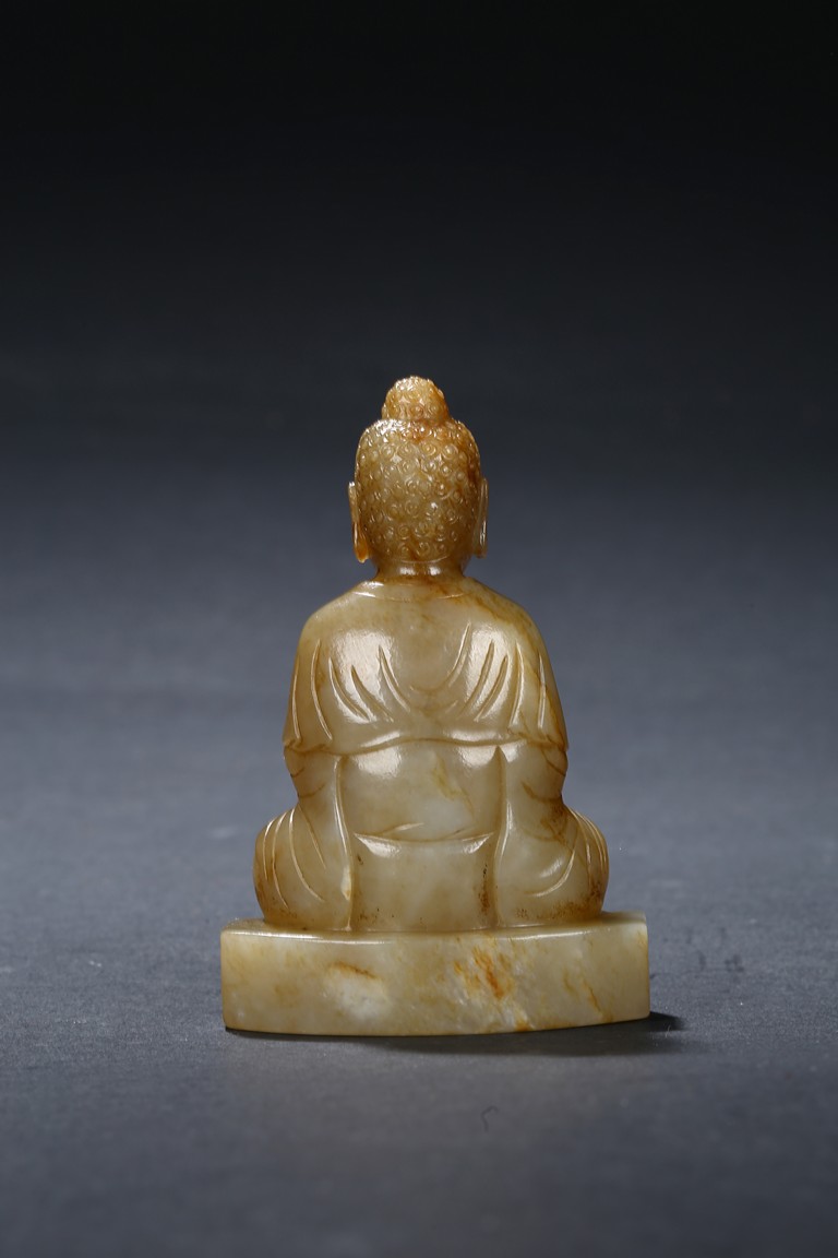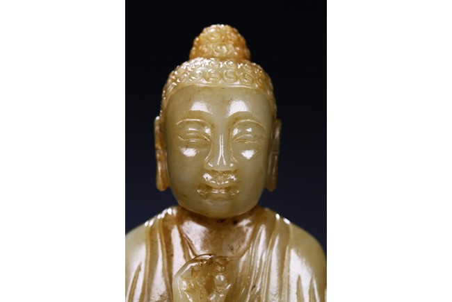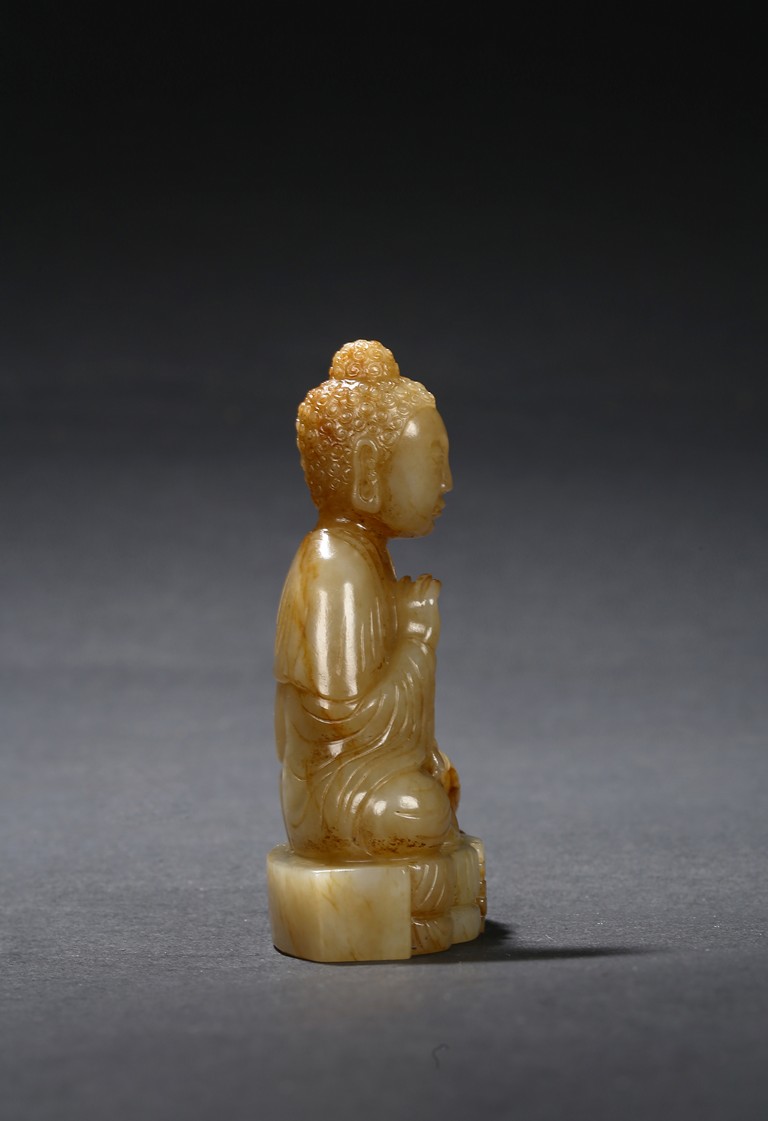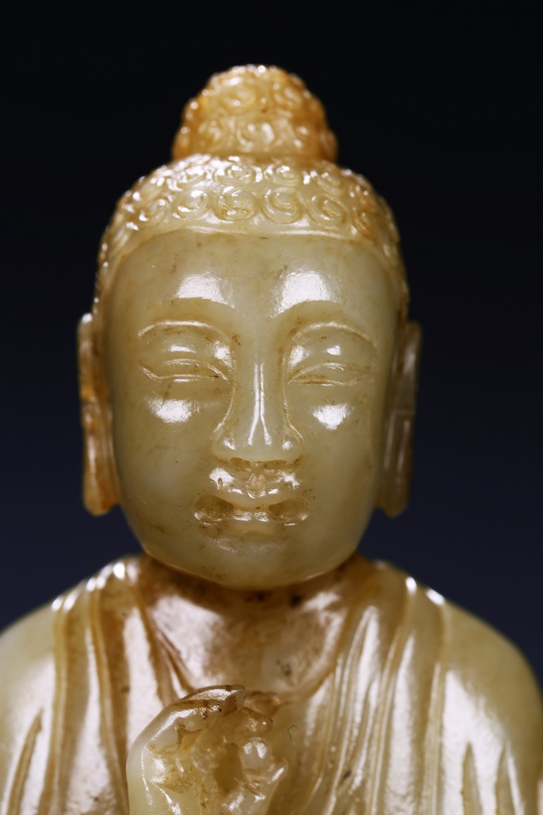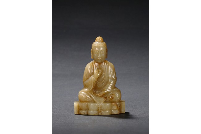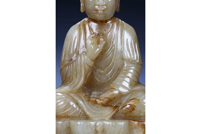 The figure is seated on a stepped base wearing long flowing robes falling in elegant folds, his right hand is raised in vitarkamudra, and his left lowered to rest on his lap.Yuan/Early Ming Dynasty period.