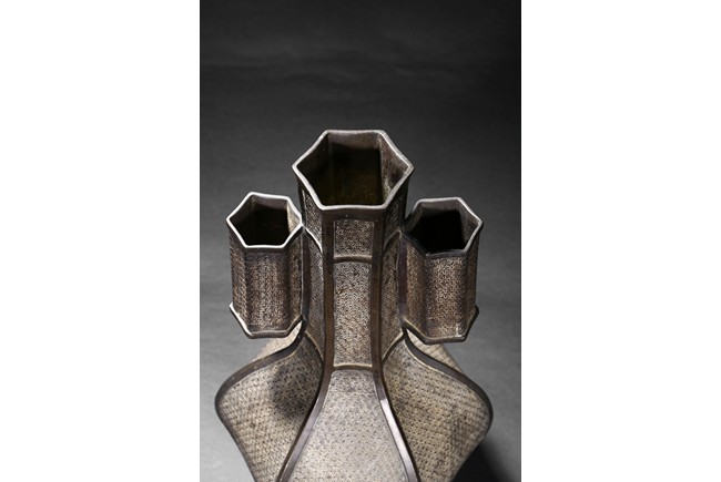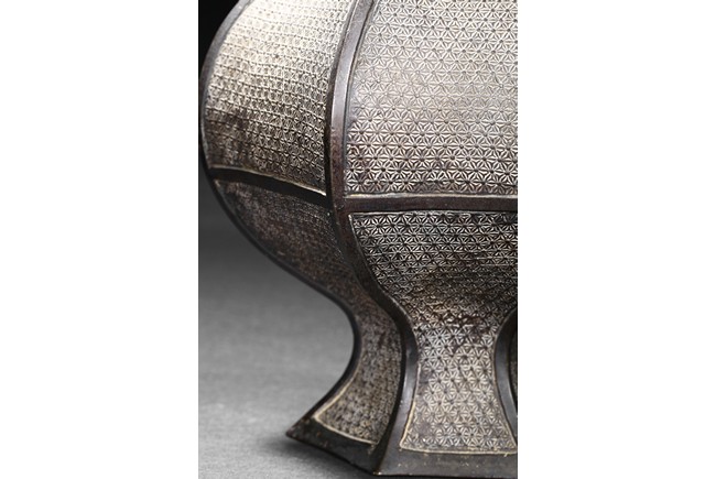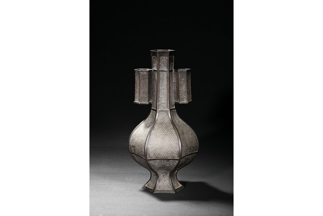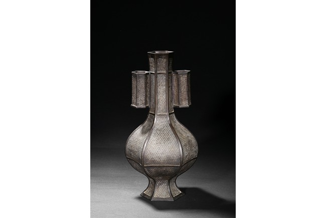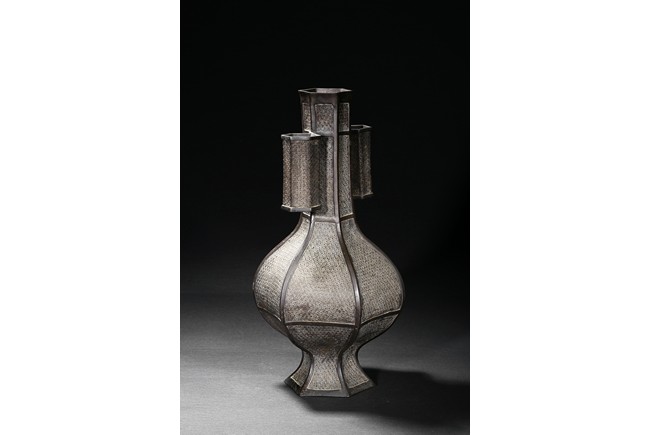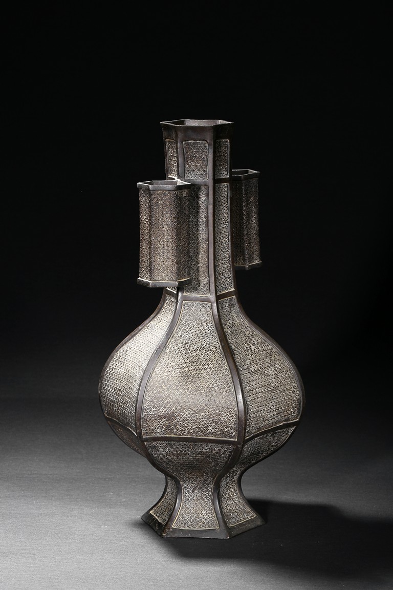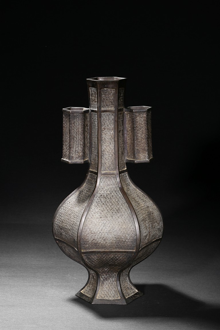 Of hexagonal section, the neck flanked by tubular handles, supported on splayed foot, decorated with floret diaper overall, base with six character xuande reign mark. Ming Dynasty period.