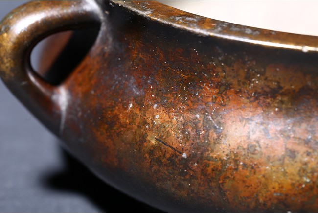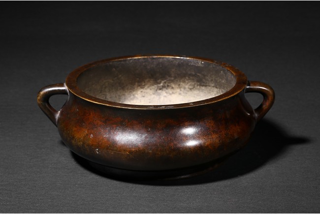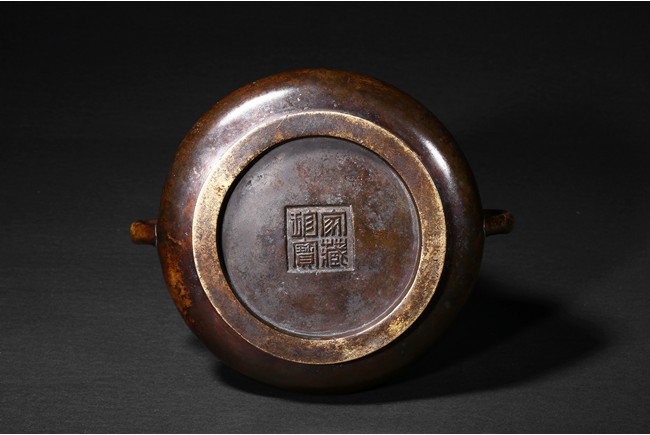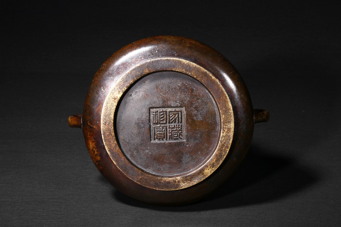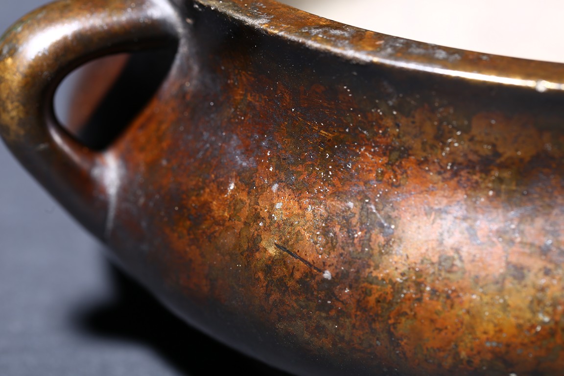 Of compressed globular body, rising from a slightly spreading foot to a flared rim, applied with a pair of loop handles, the base with a four character Jiacang zhenbao mark. Qing Dynasty period.