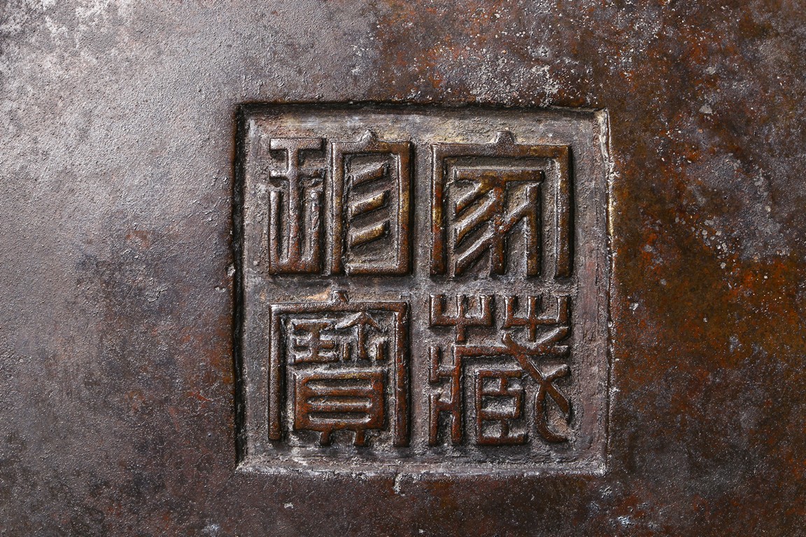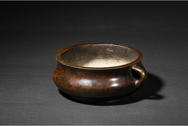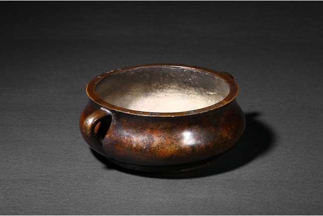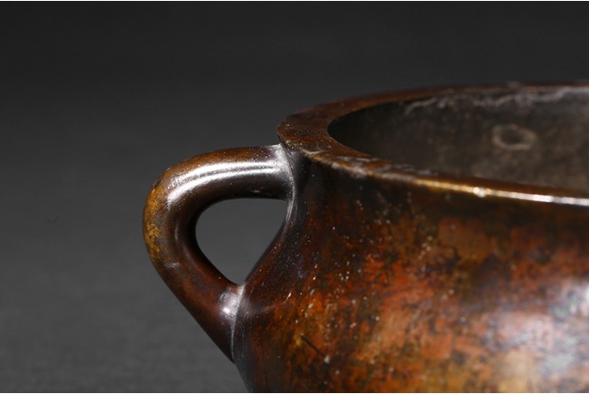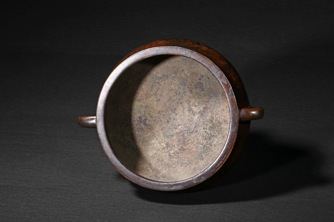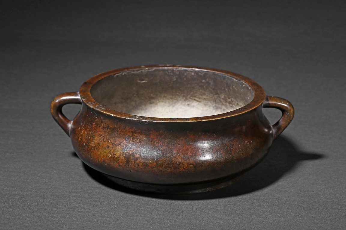 Of compressed globular body, rising from a slightly spreading foot to a flared rim, applied with a pair of loop handles, the base with a four character Jiacang zhenbao mark. Qing Dynasty period.
