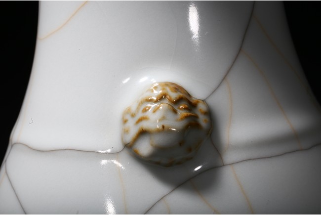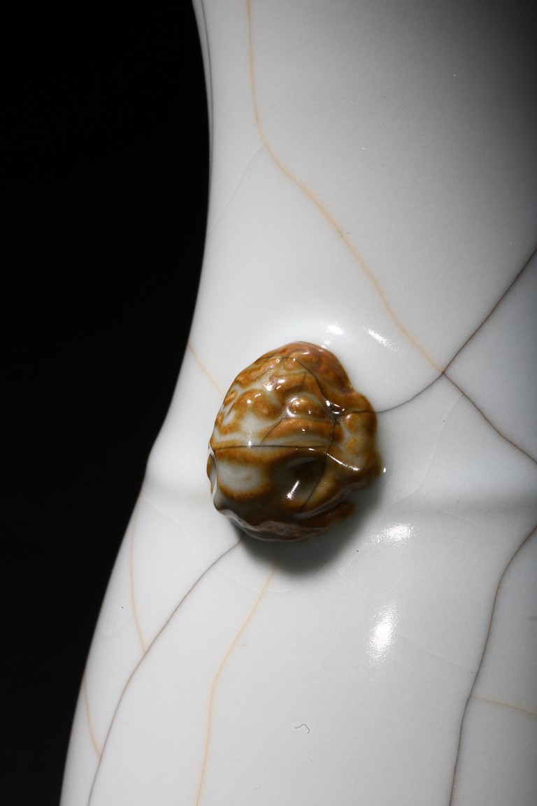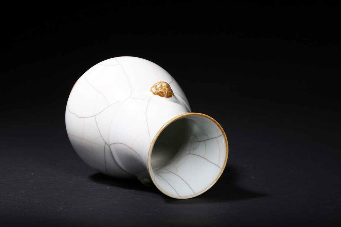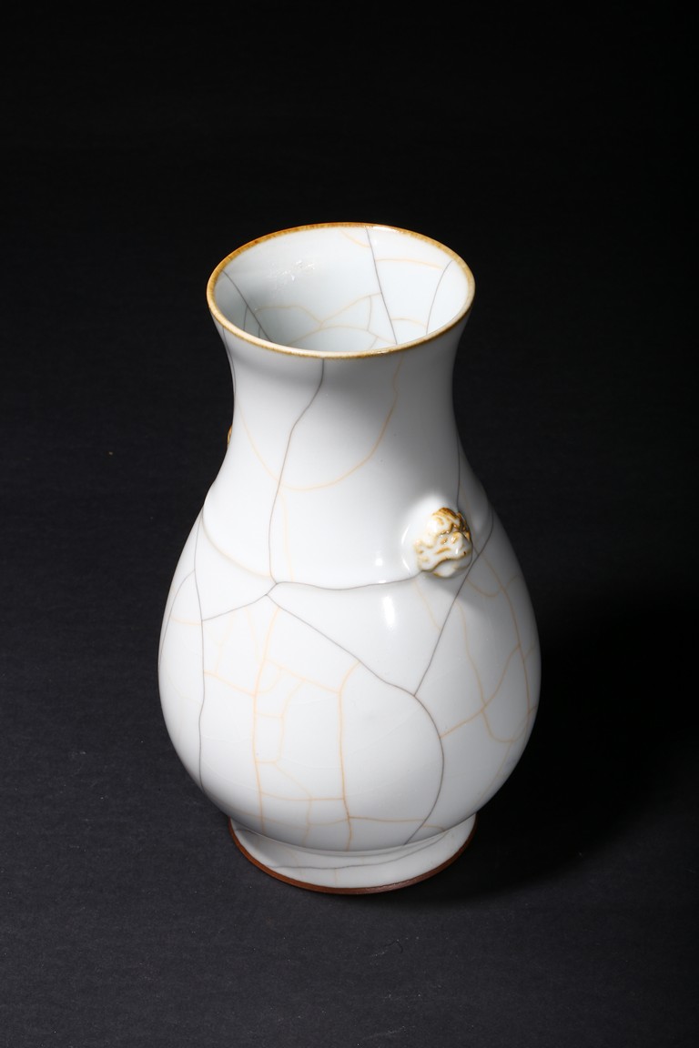 Of gently rounded sides, rising from a spreading foot to an everted rim, decorated with white glaze suffused with black and yellow crackles, with two gilt-painted lion-head handles, the base with six character QIANLONG mark. Qing Dynasty period.