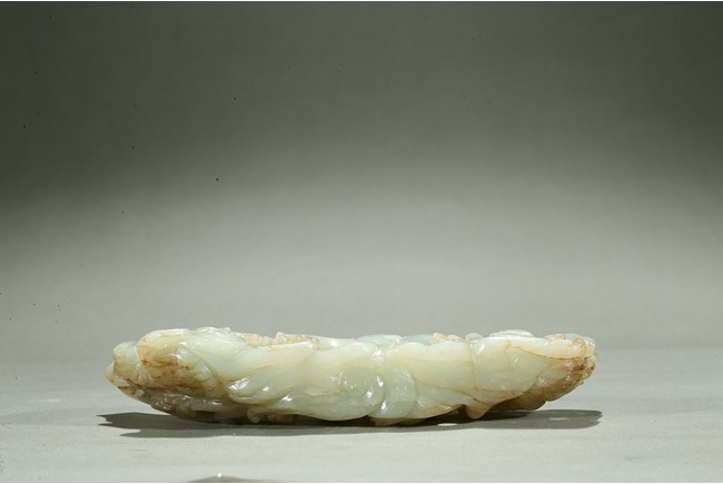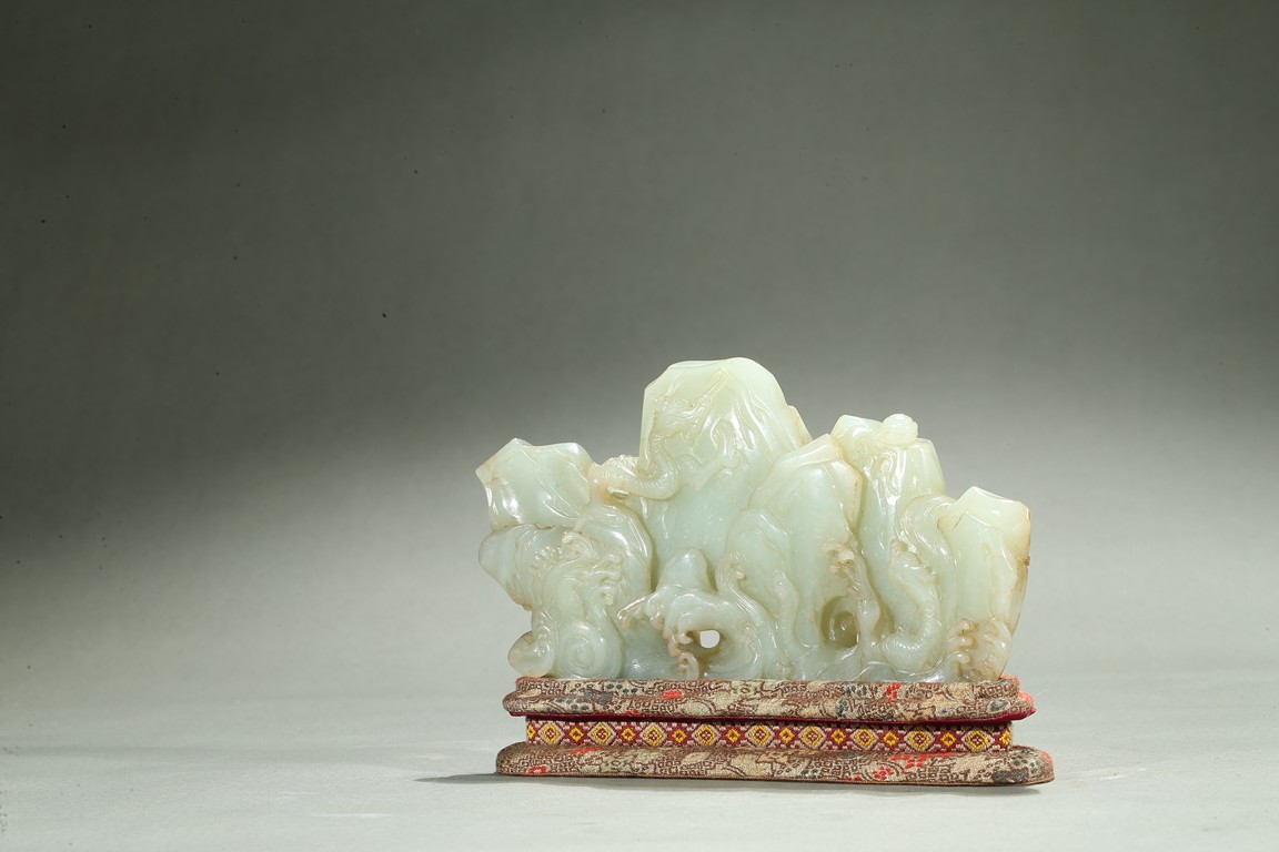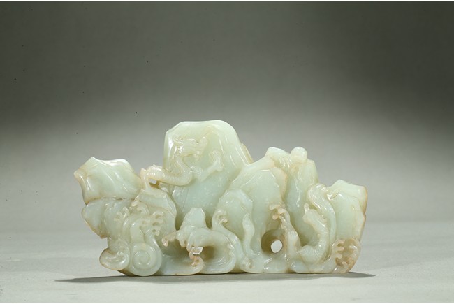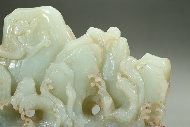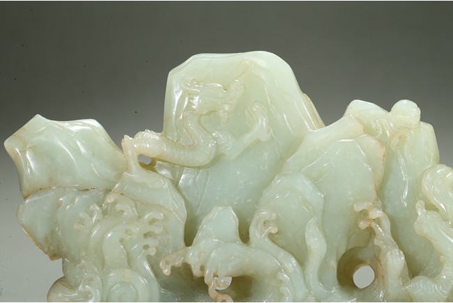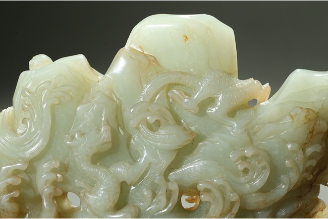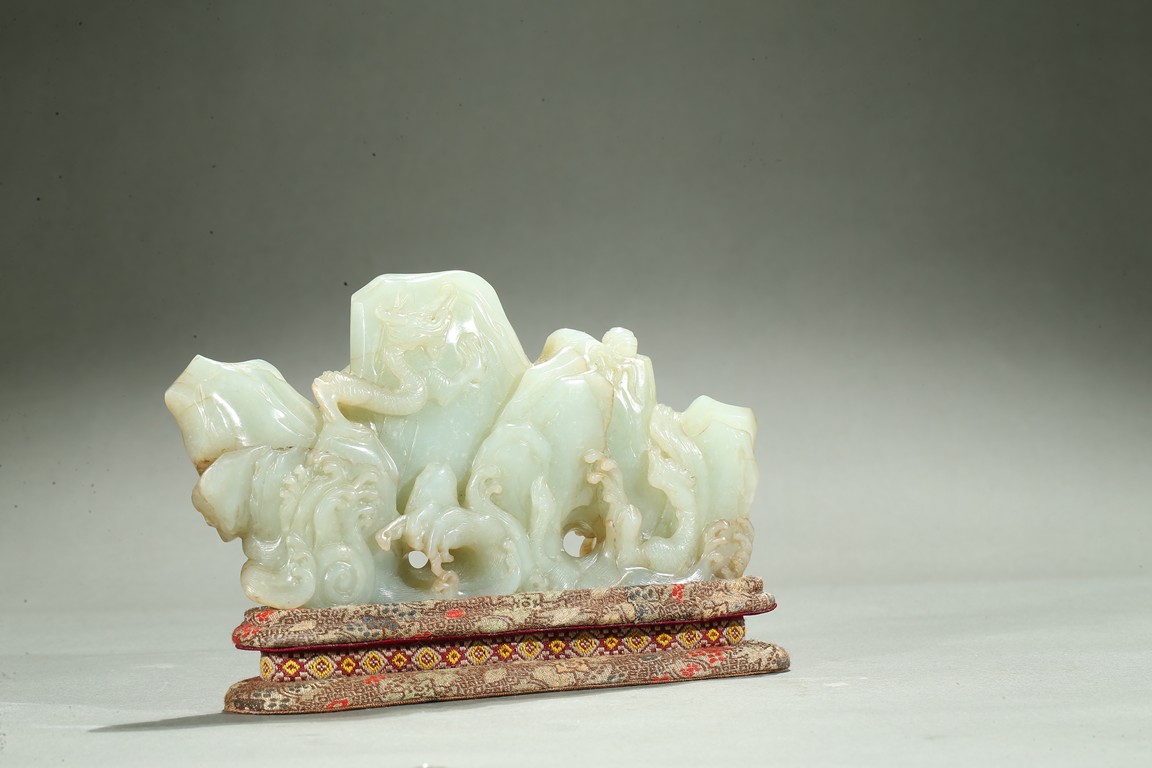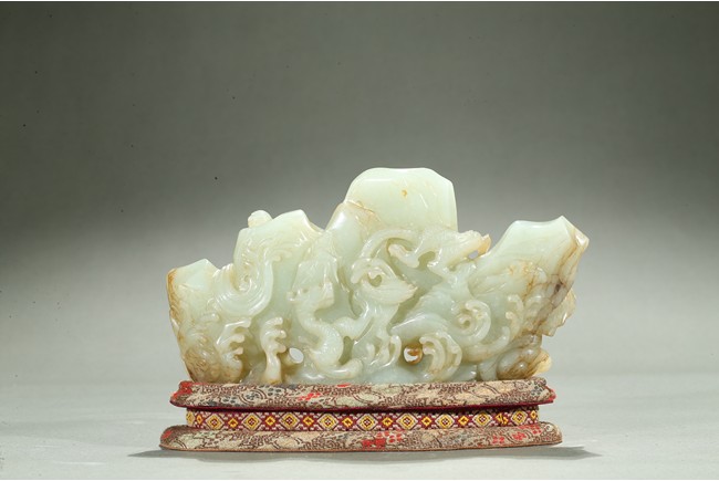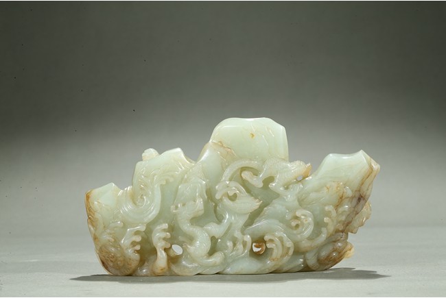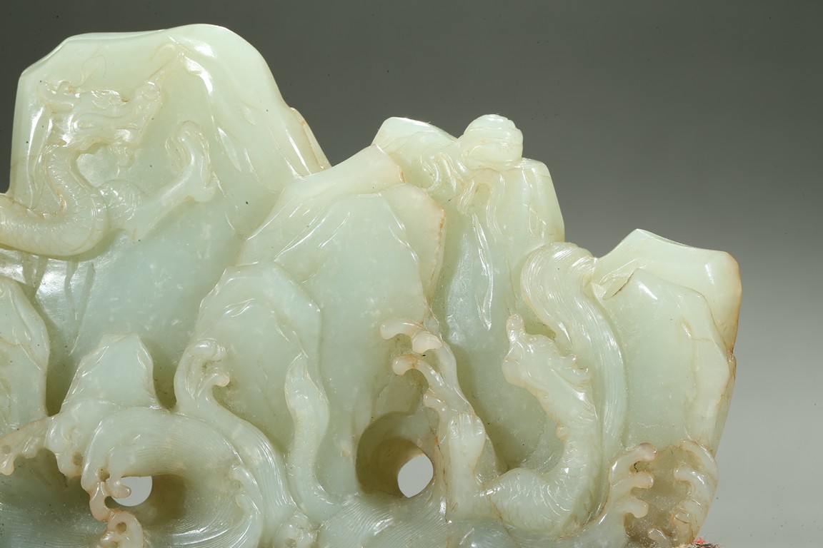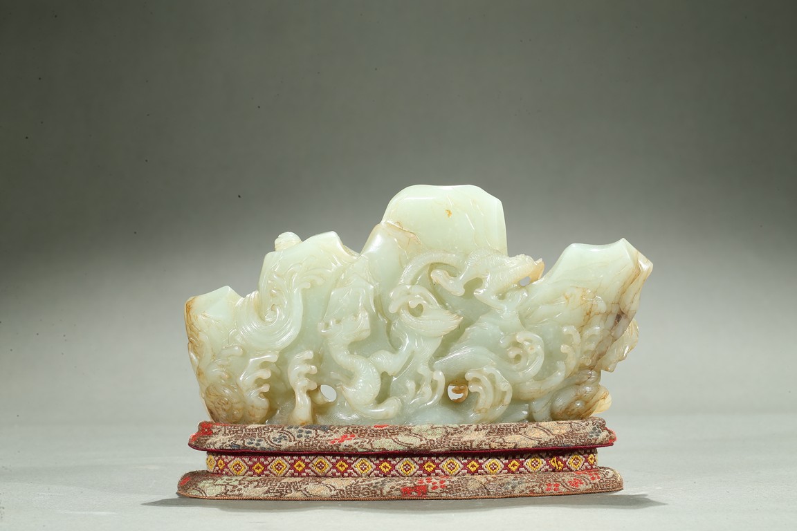 Modelled as a ragged mountain, carved in relief with scaly dragons emerging from crashing waves below. The stone is of celadon-white tone with russet skin and markings. Qing Dynasty period.