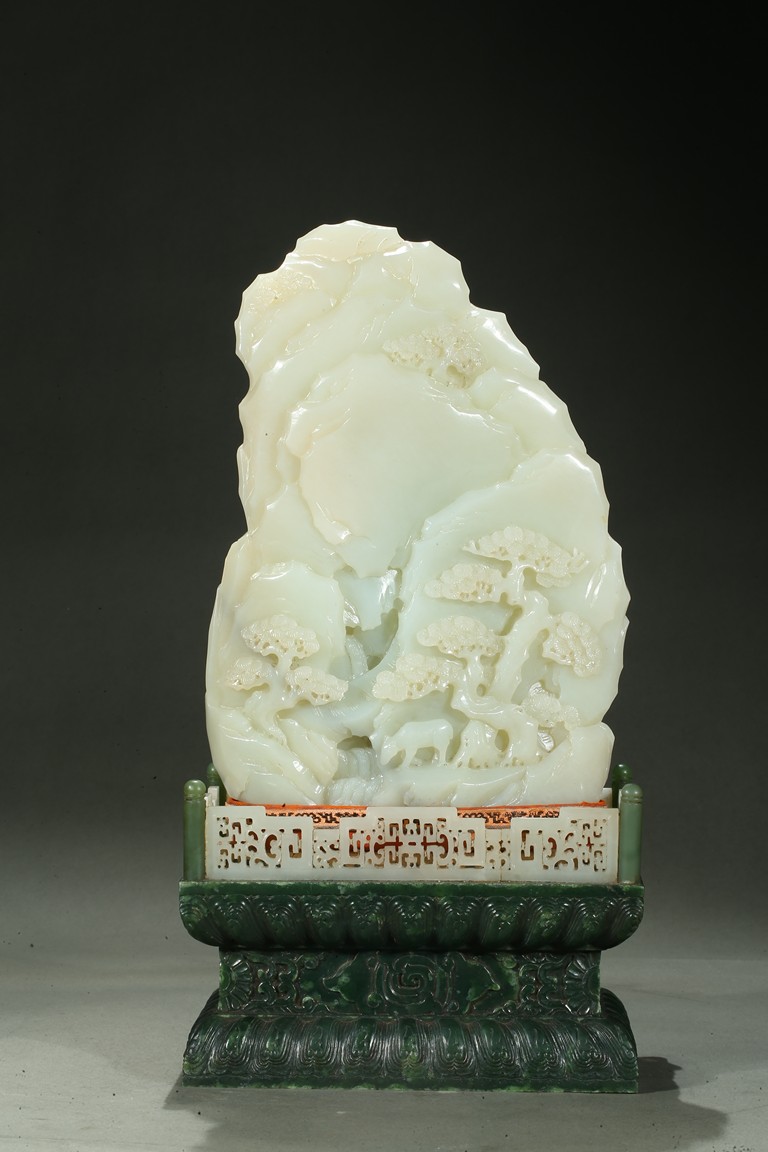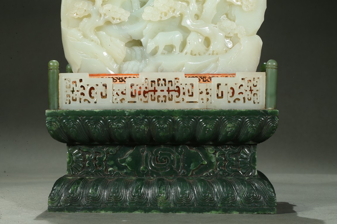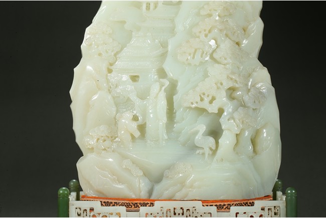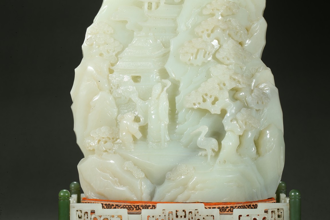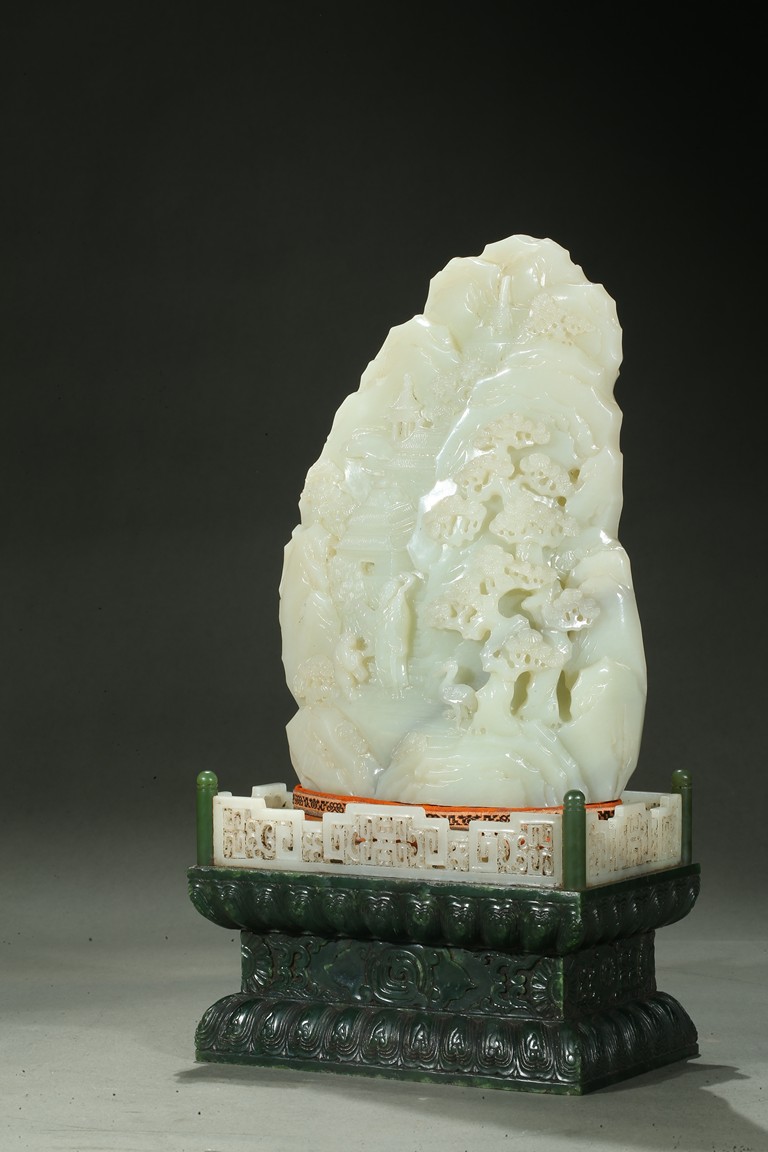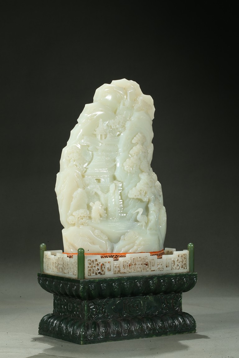 The upright mountain boulder carved in varying depth of an immortal accompanied by his attendant and crane on a rocky cliff, on the higher part carved with pavilion and temples. The stone of an greenish white tone. The boulder is supported by an rectangular spinach and white jade double lotus stand.