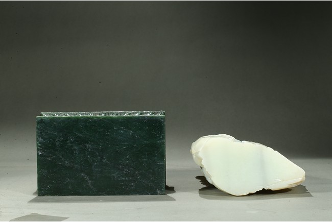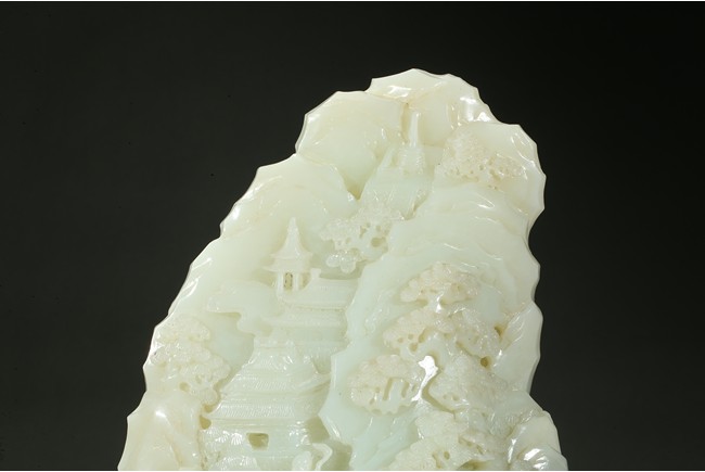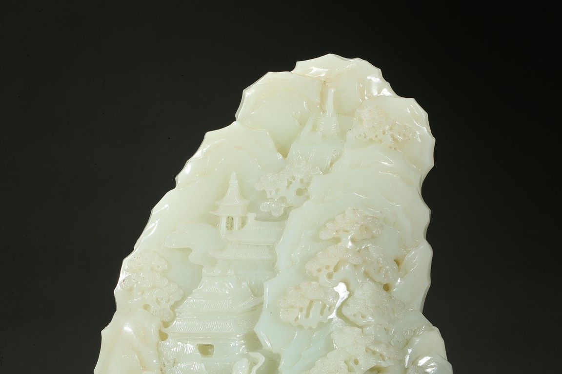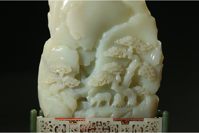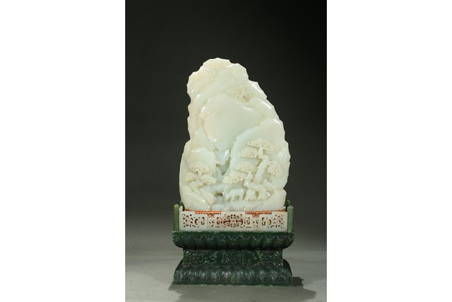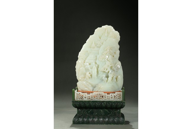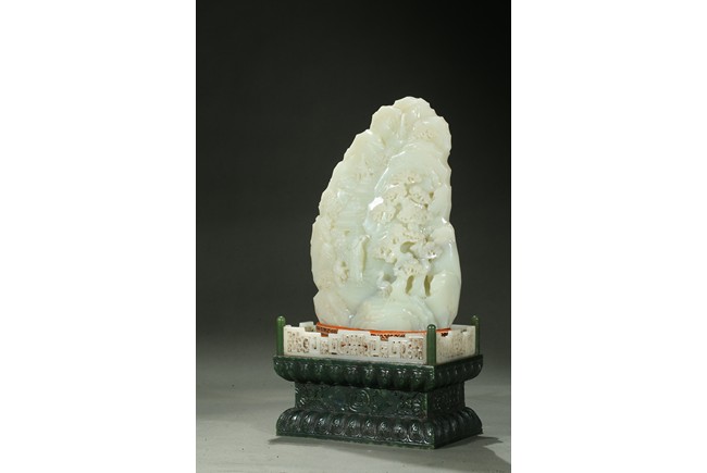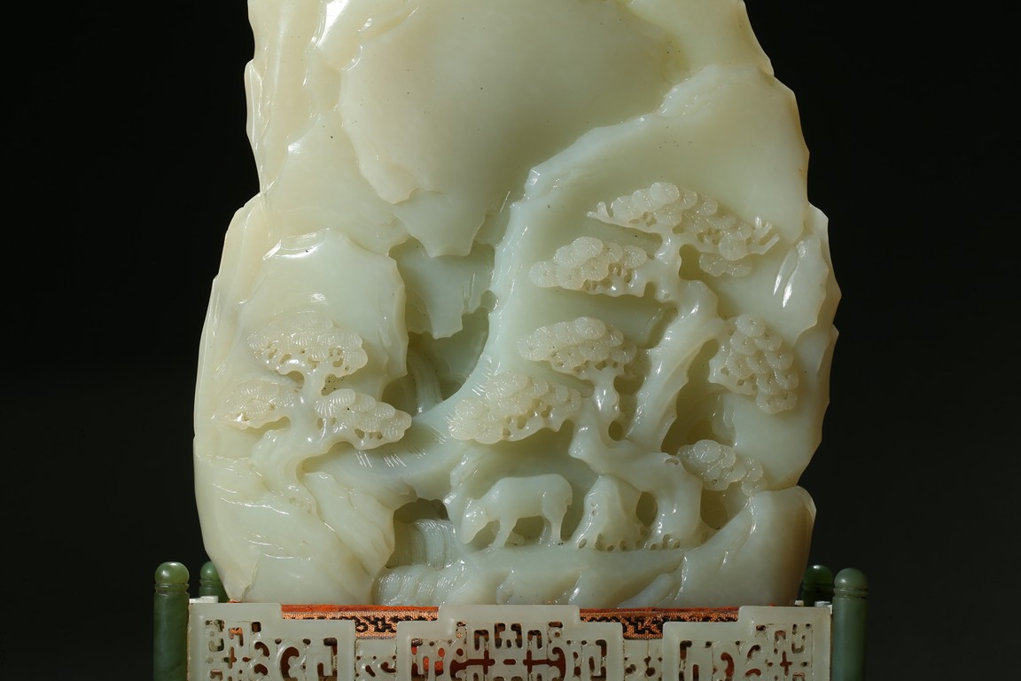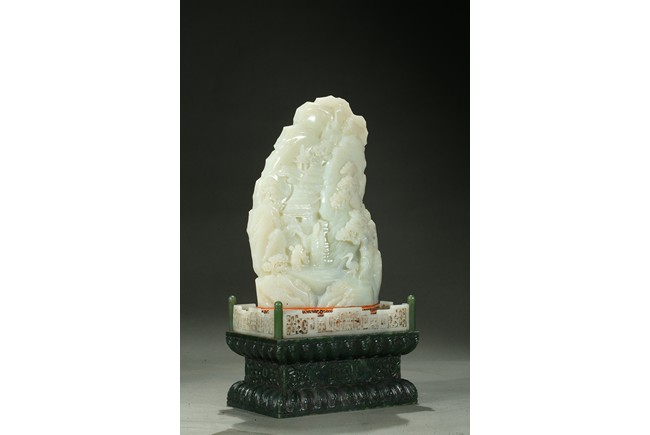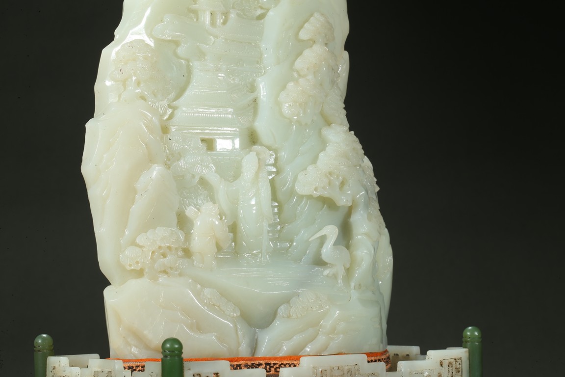 The upright mountain boulder carved in varying depth of an immortal accompanied by his attendant and crane on a rocky cliff, on the higher part carved with pavilion and temples. The stone of an greenish white tone. The boulder is supported by an rectangular spinach and white jade double lotus stand.