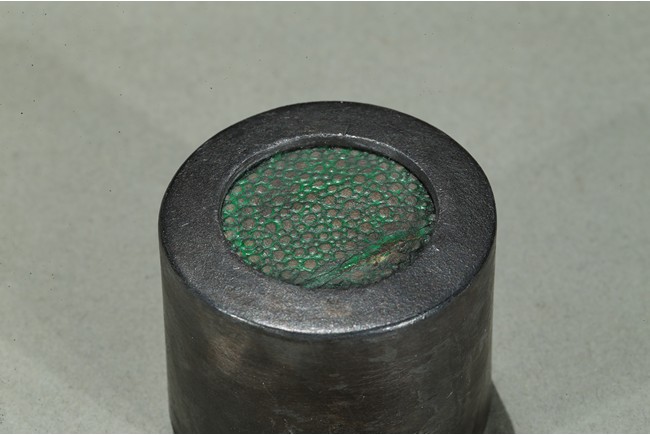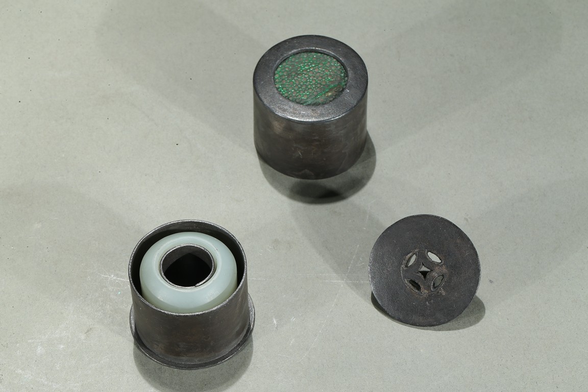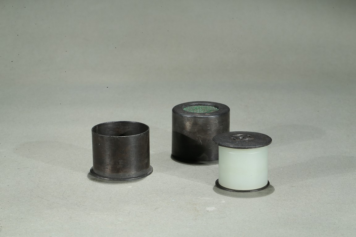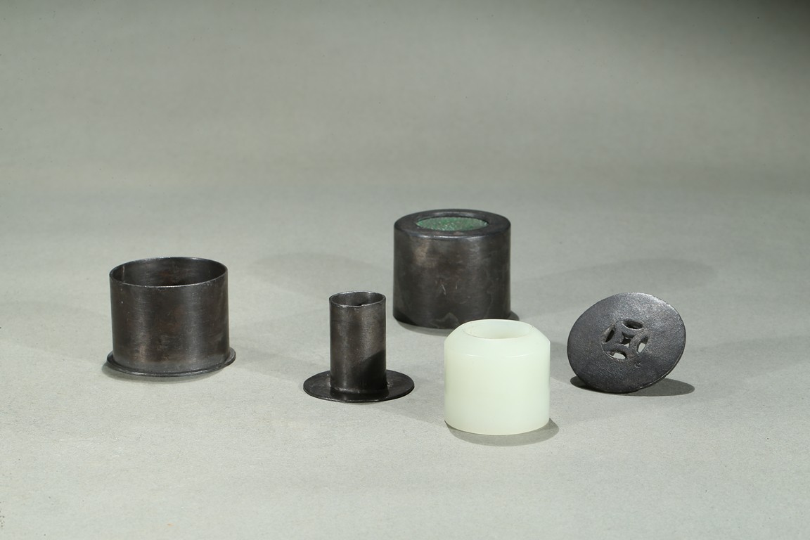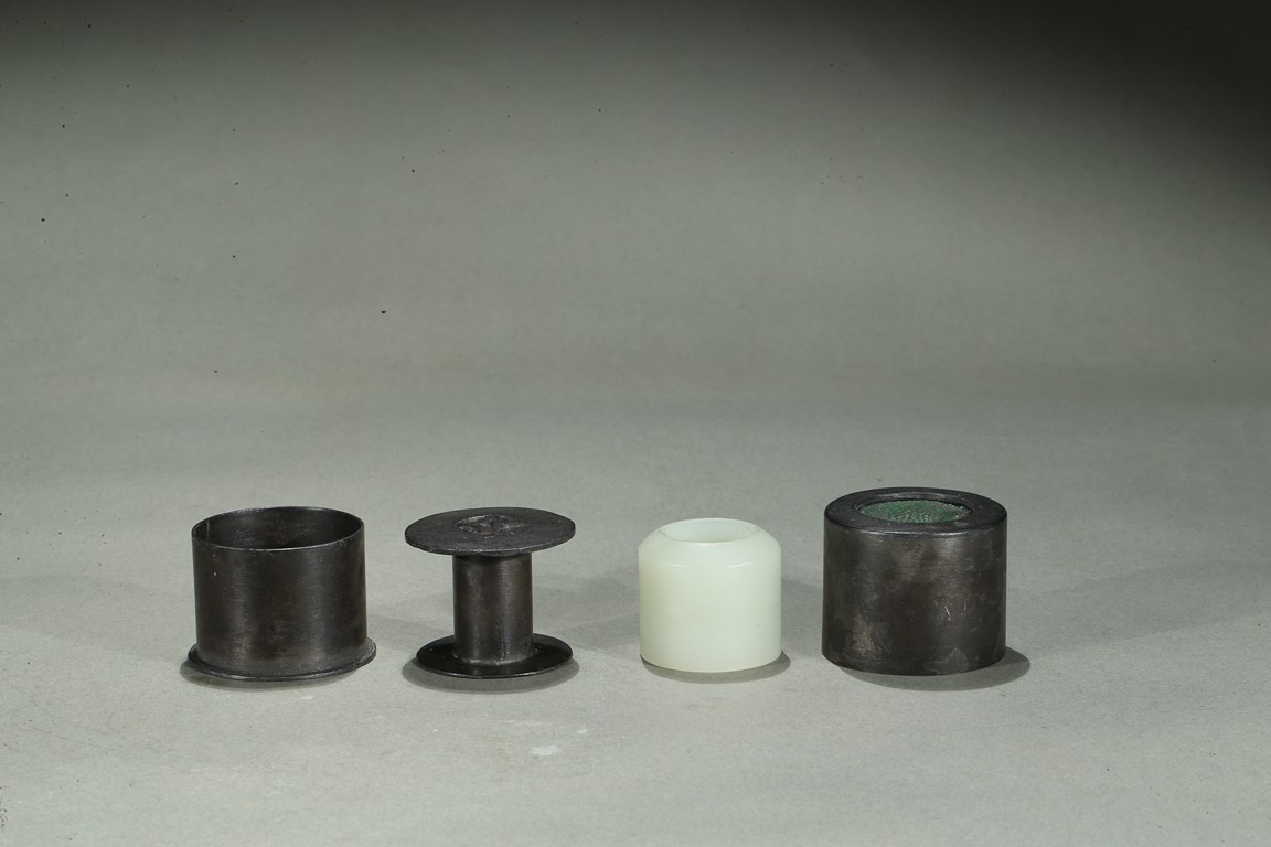 The white jade archer's ring is of even smoothly polished white tone with plain design, accompanied with a fitted metal box. Qing Dynasty period.