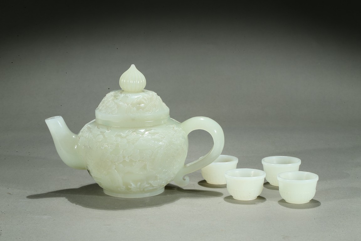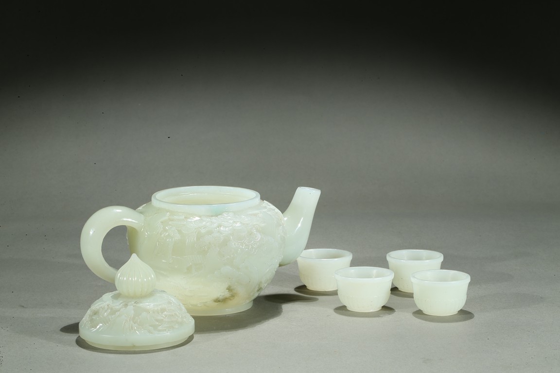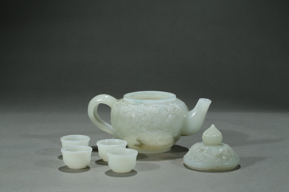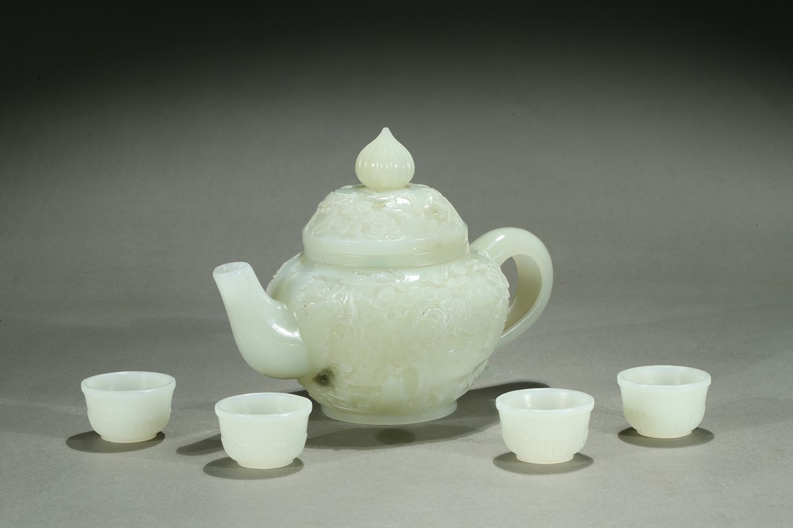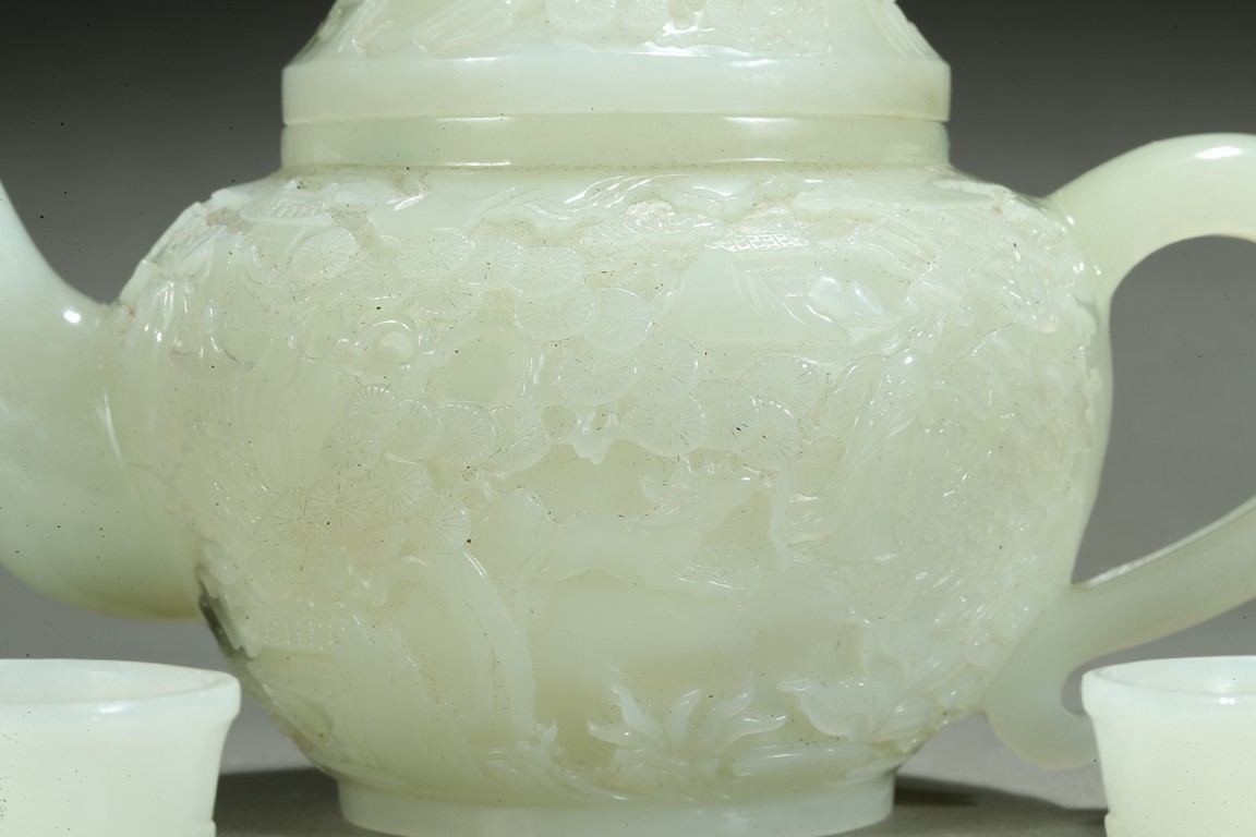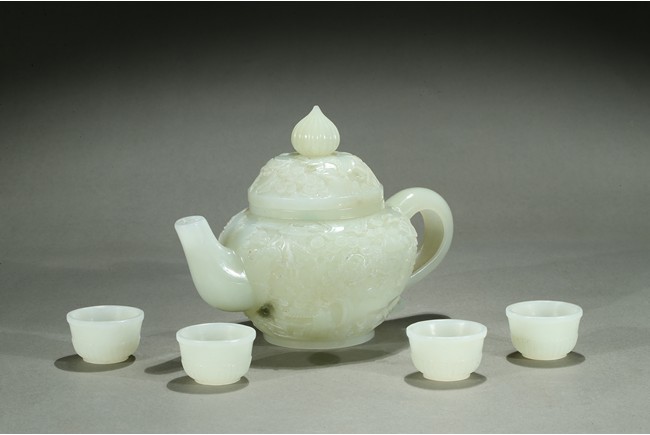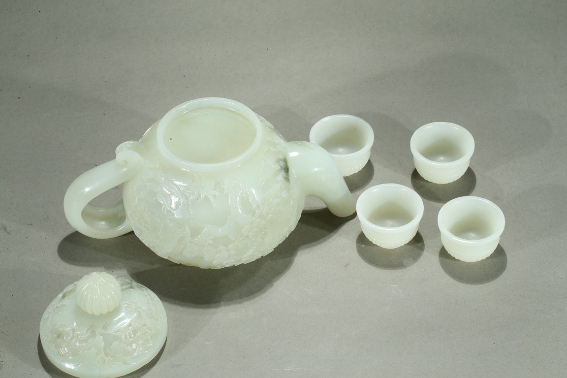 The set consists of a teapot with globular form supported on a short foot, set with a tapered spout opposite a 'C'-shaped handle, the exterior finely carved in low relief with a garden landscape scene, the domed cover similarly decorated with pine trees below a finial in the form of a lotus bud; and four cups carved with a row of lotus petals around the foot.