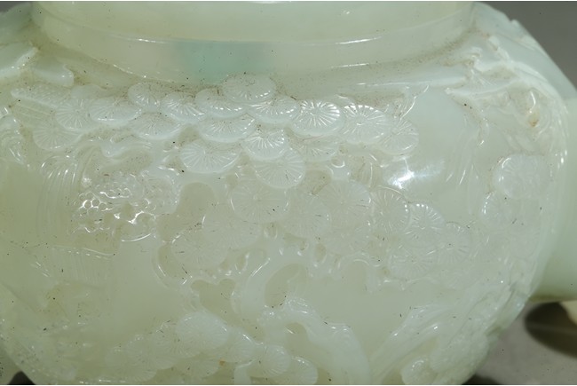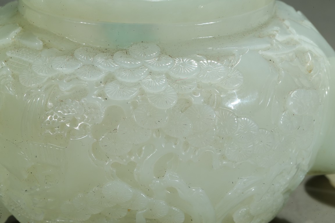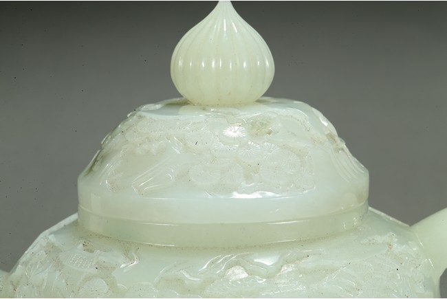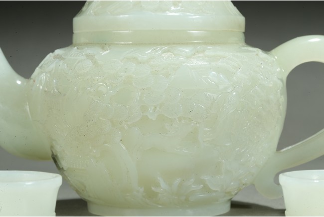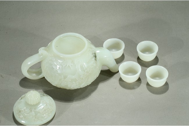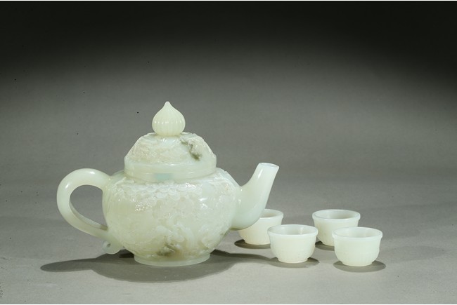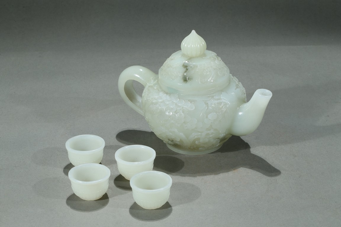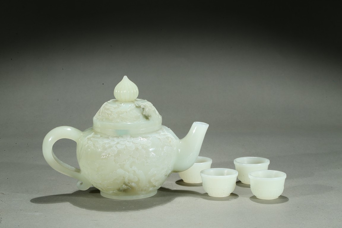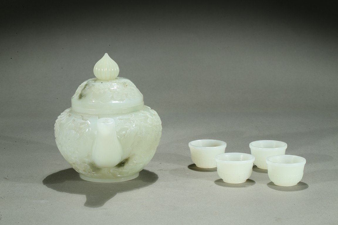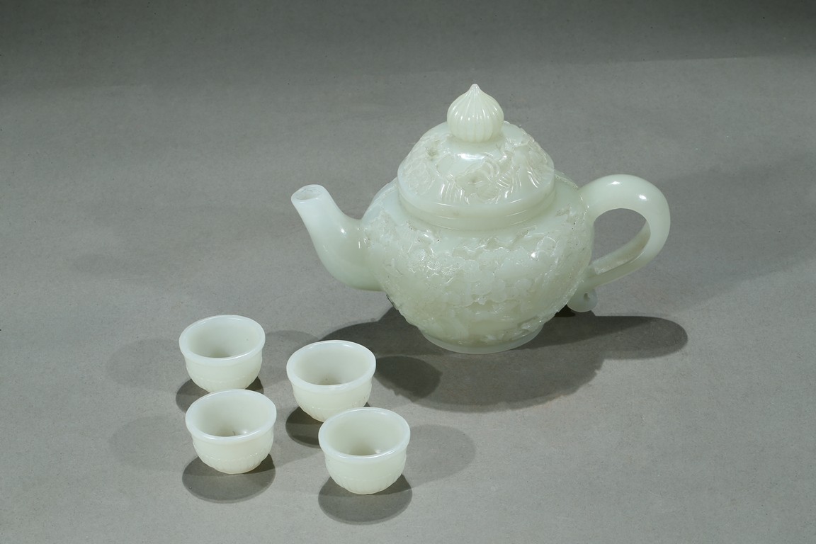 The set consists of a teapot with globular form supported on a short foot, set with a tapered spout opposite a 'C'-shaped handle, the exterior finely carved in low relief with a garden landscape scene, the domed cover similarly decorated with pine trees below a finial in the form of a lotus bud; and four cups carved with a row of lotus petals around the foot.