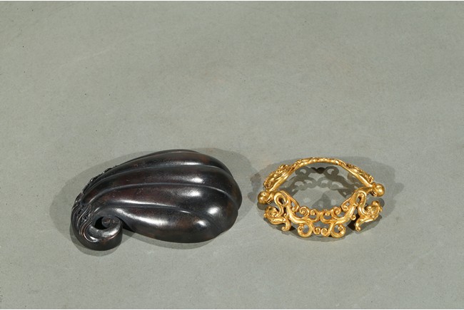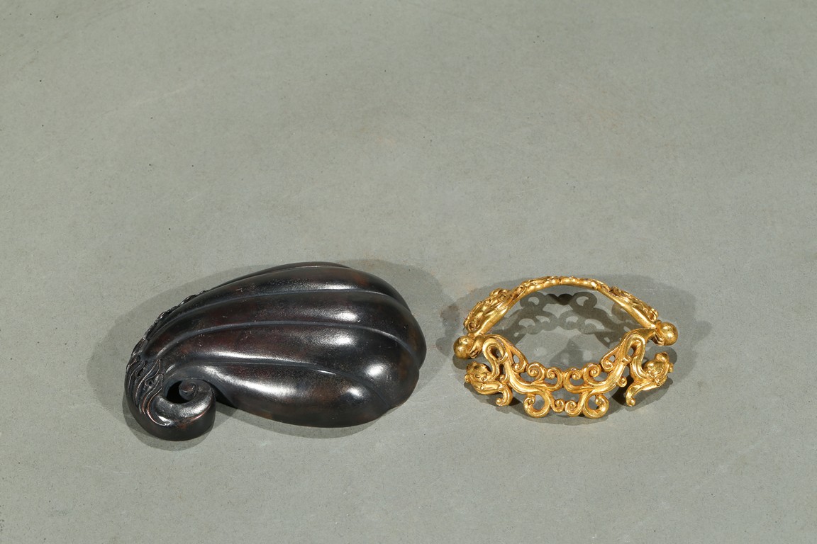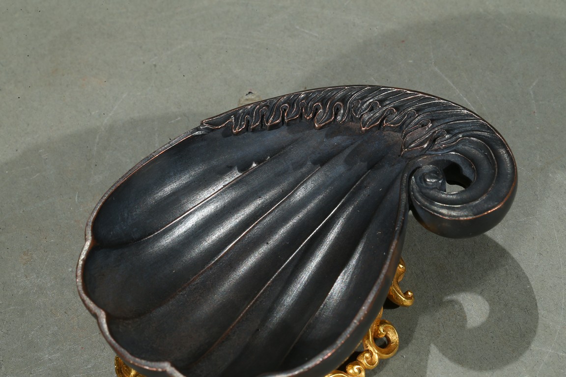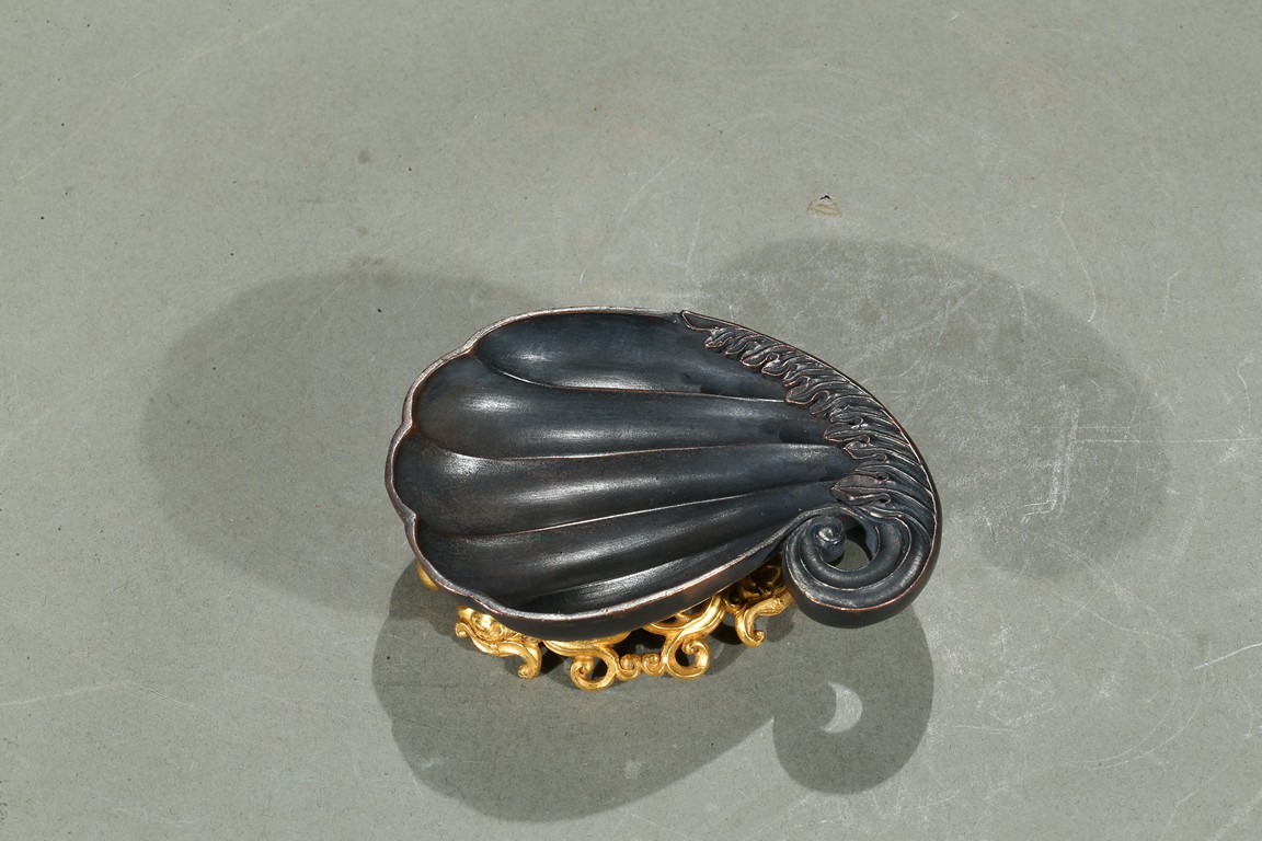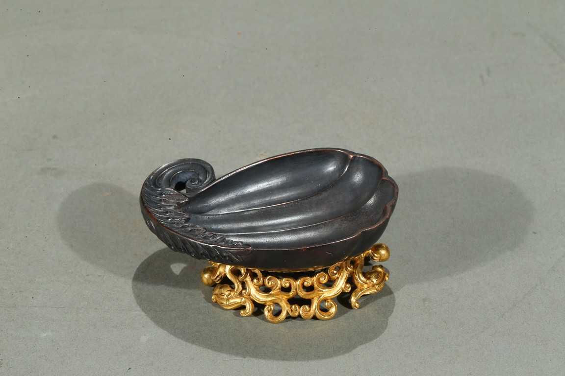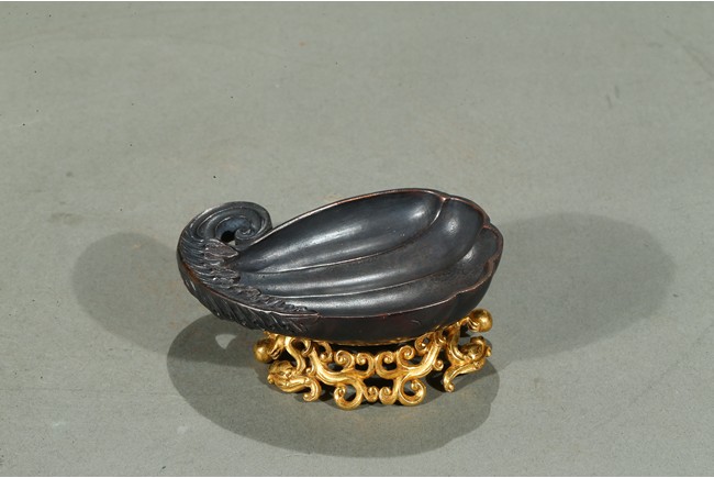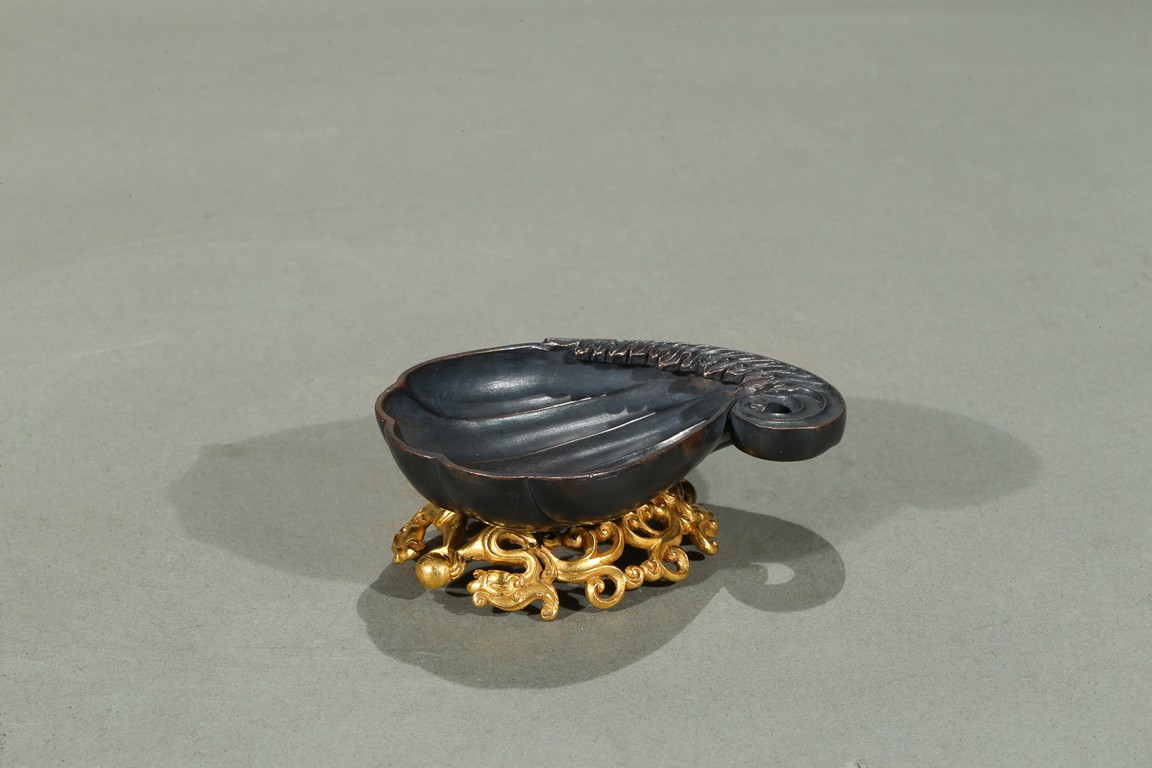 Carved in the form of a lobed floral bloom with a coiled handle in style of mughal style jade cup, supported on openwork gilt-bronze stand. Qing Dynasty period.