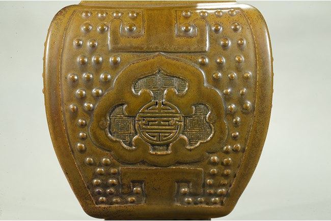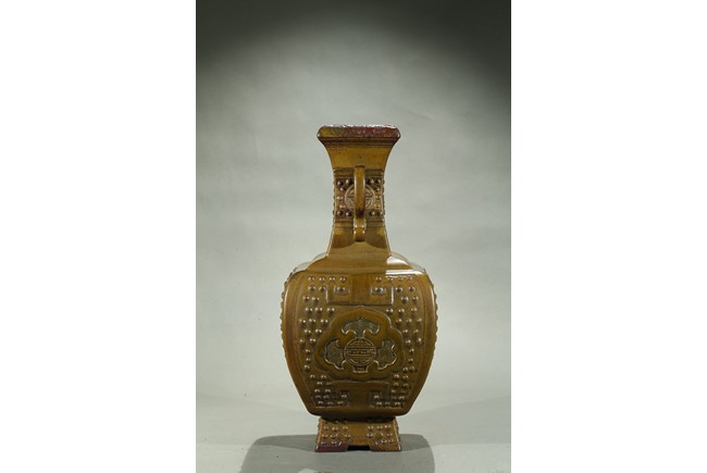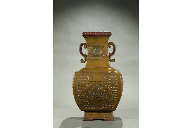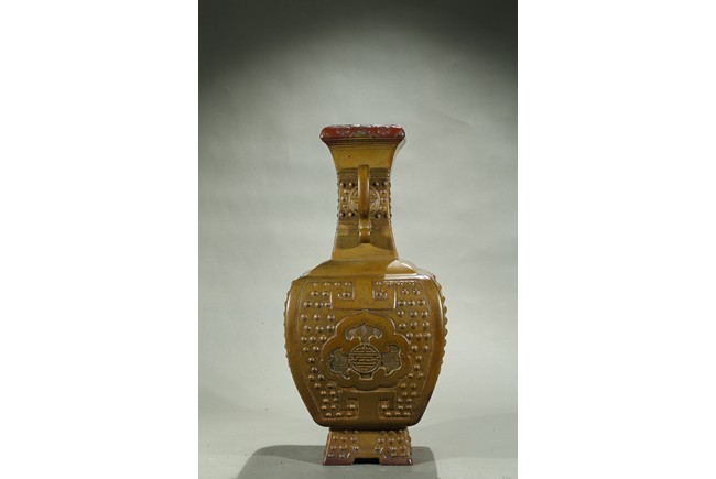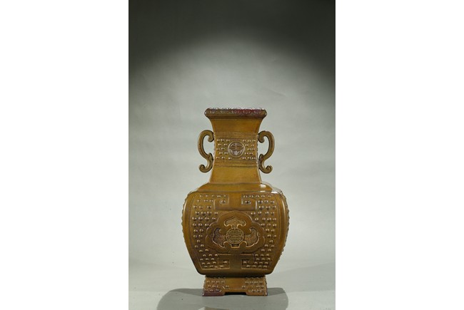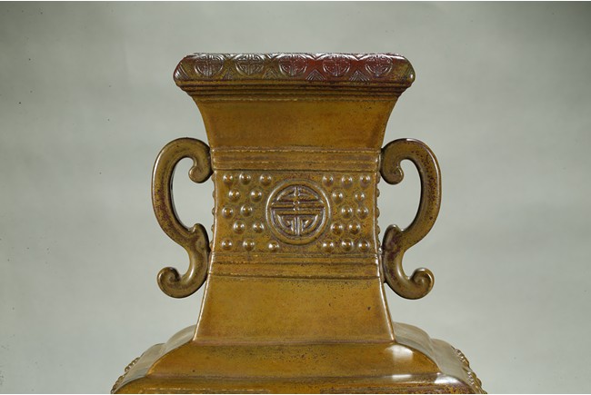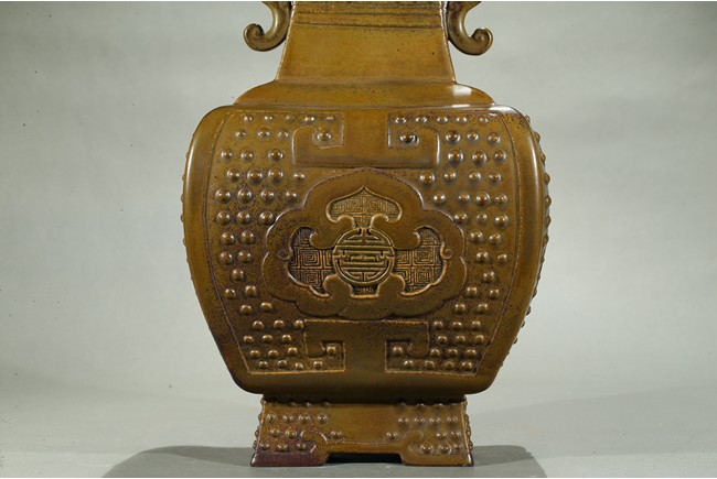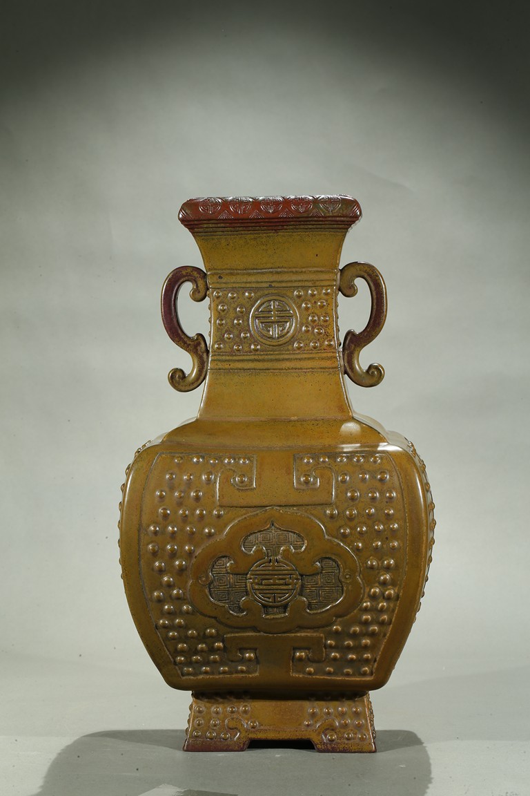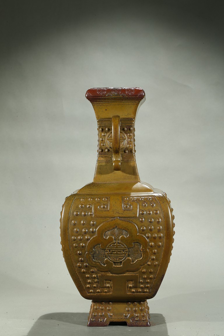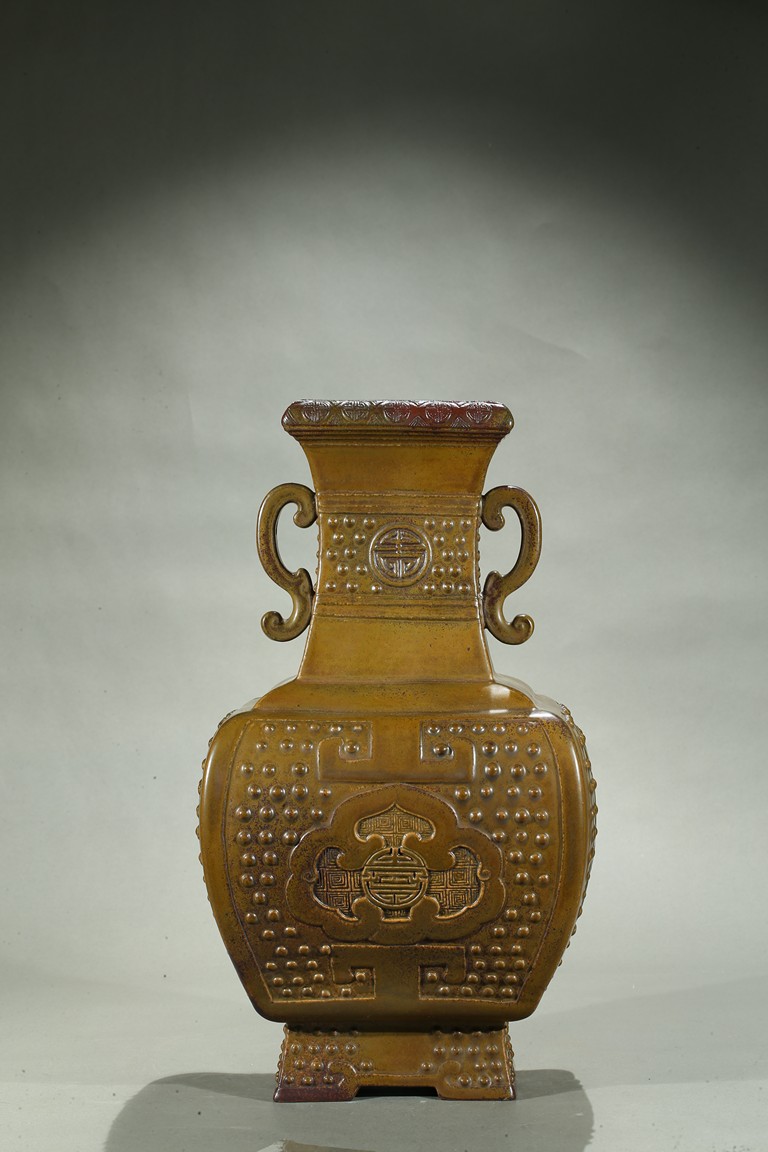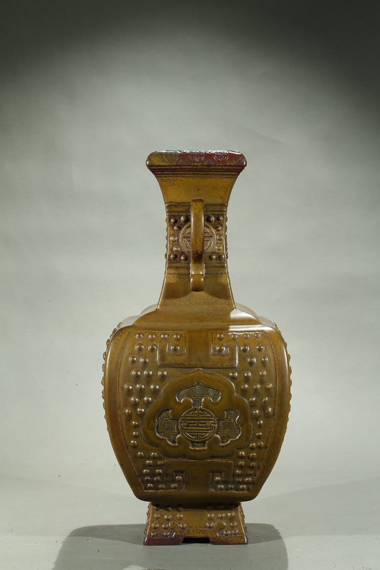 Of baluster form, the body moulded with ruyi cloud enclosing shou character medallion surrounded by raised diamond boss, the waisted neck flanked by curved handles. The base impressed with six characte Qianlong mark. Qing Dynasty period.