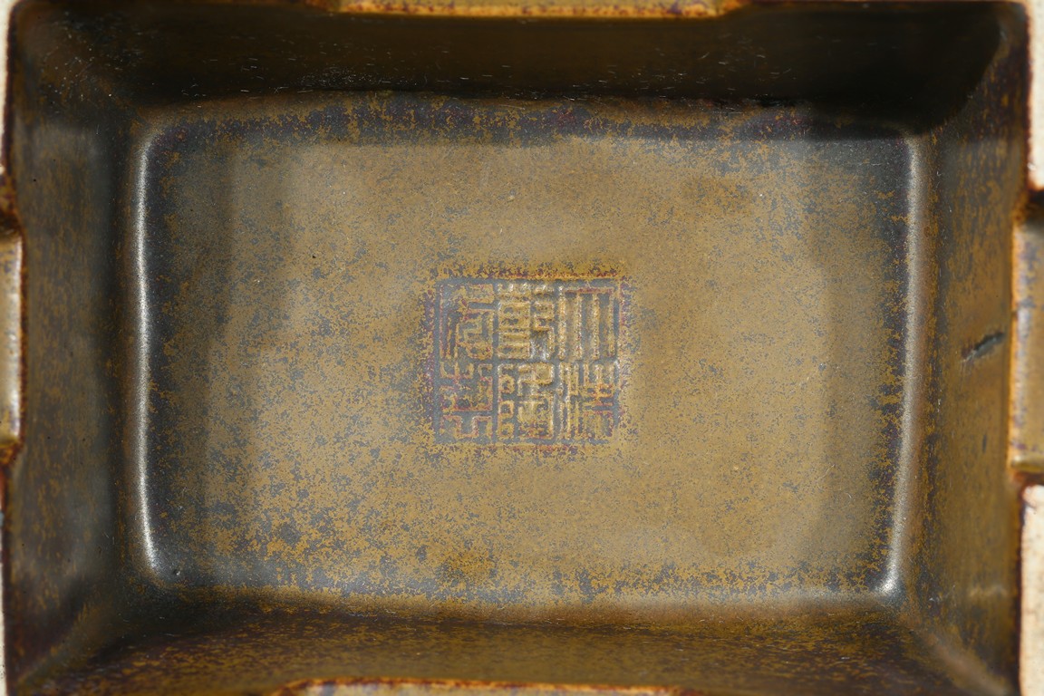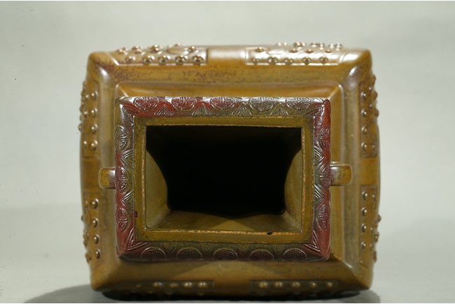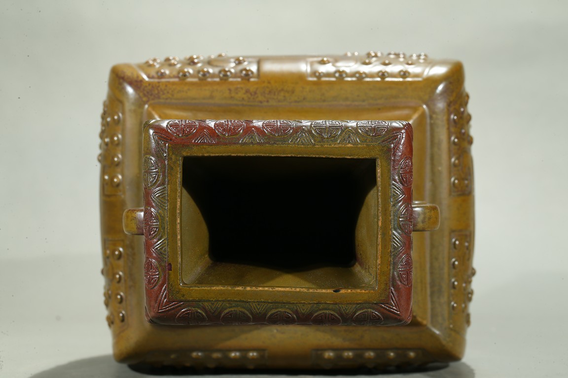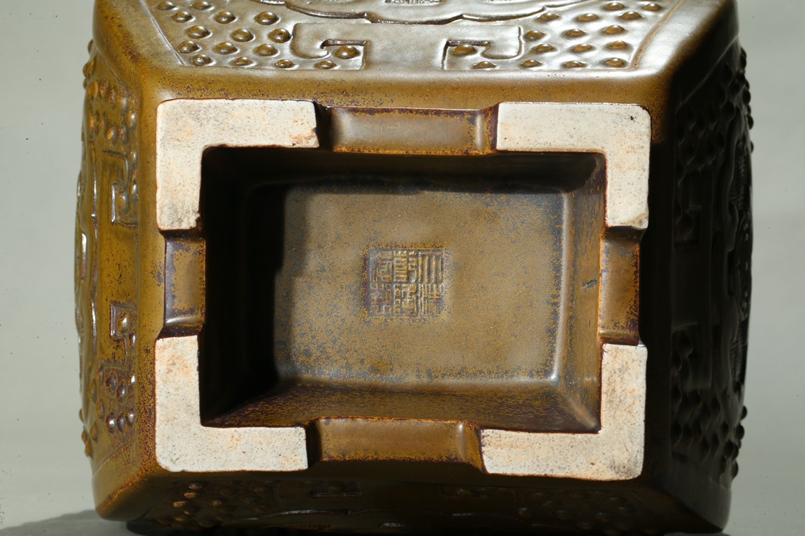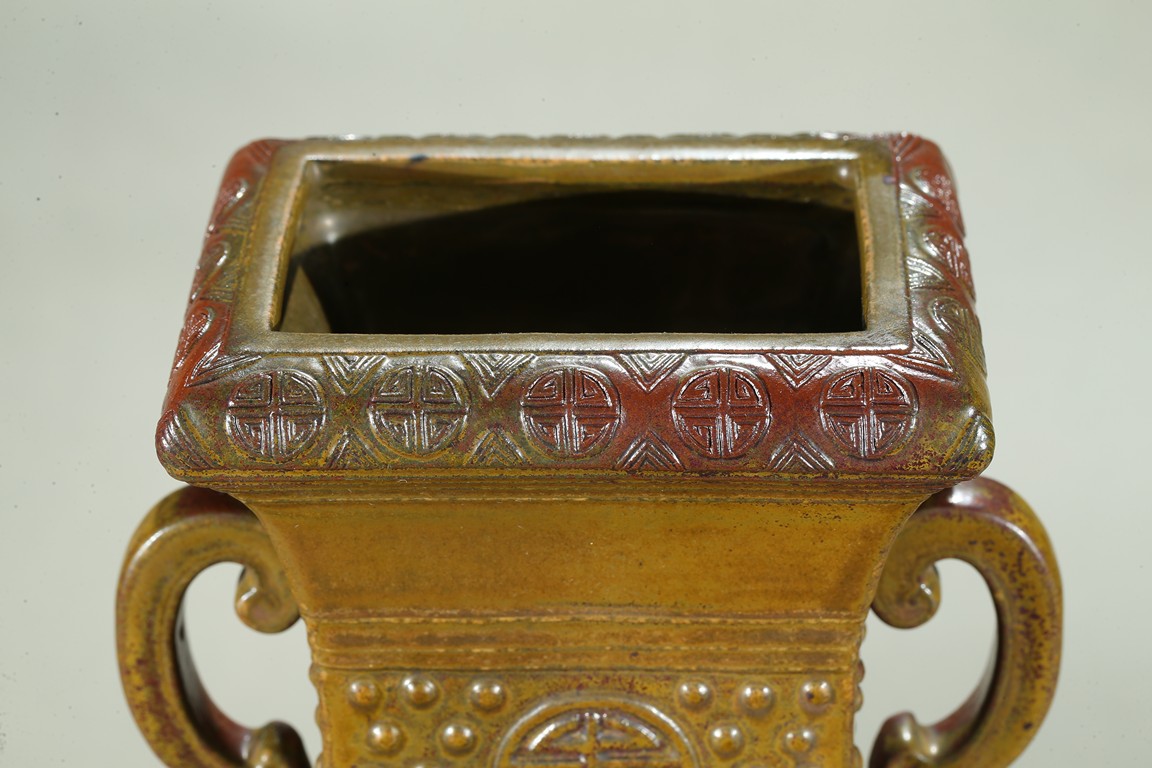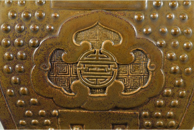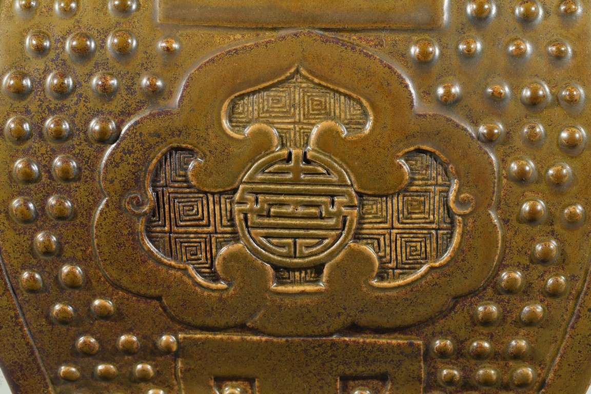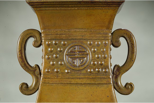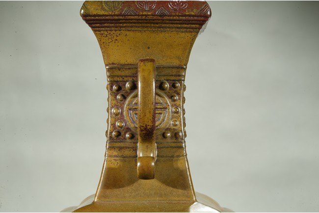 Of baluster form, the body moulded with ruyi cloud enclosing shou character medallion surrounded by raised diamond boss, the waisted neck flanked by curved handles. The base impressed with six characte Qianlong mark. Qing Dynasty period.