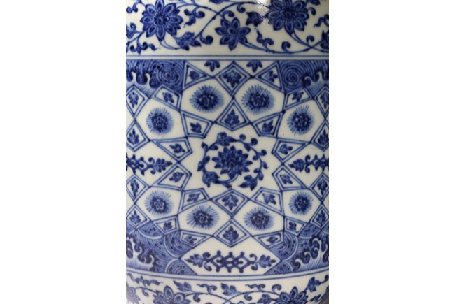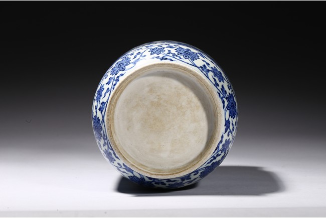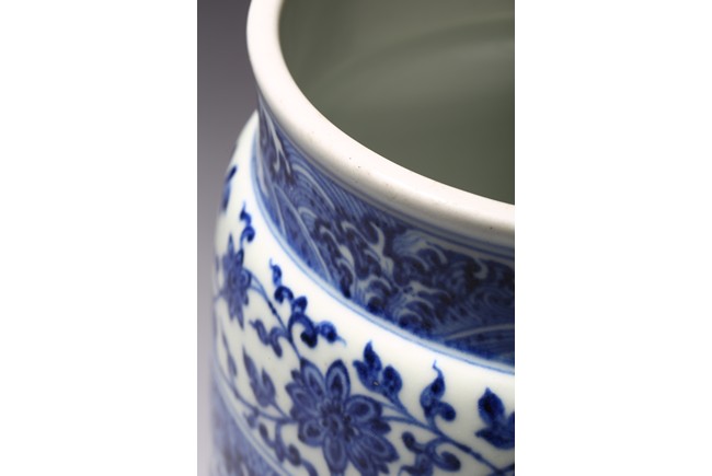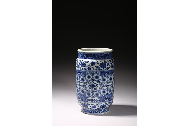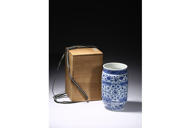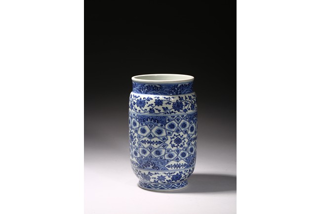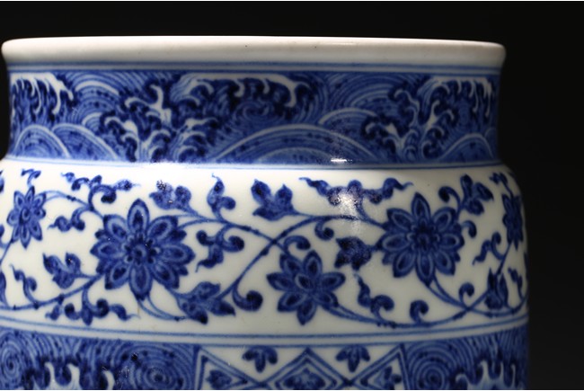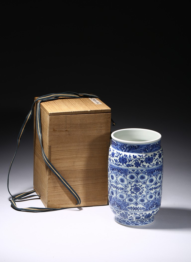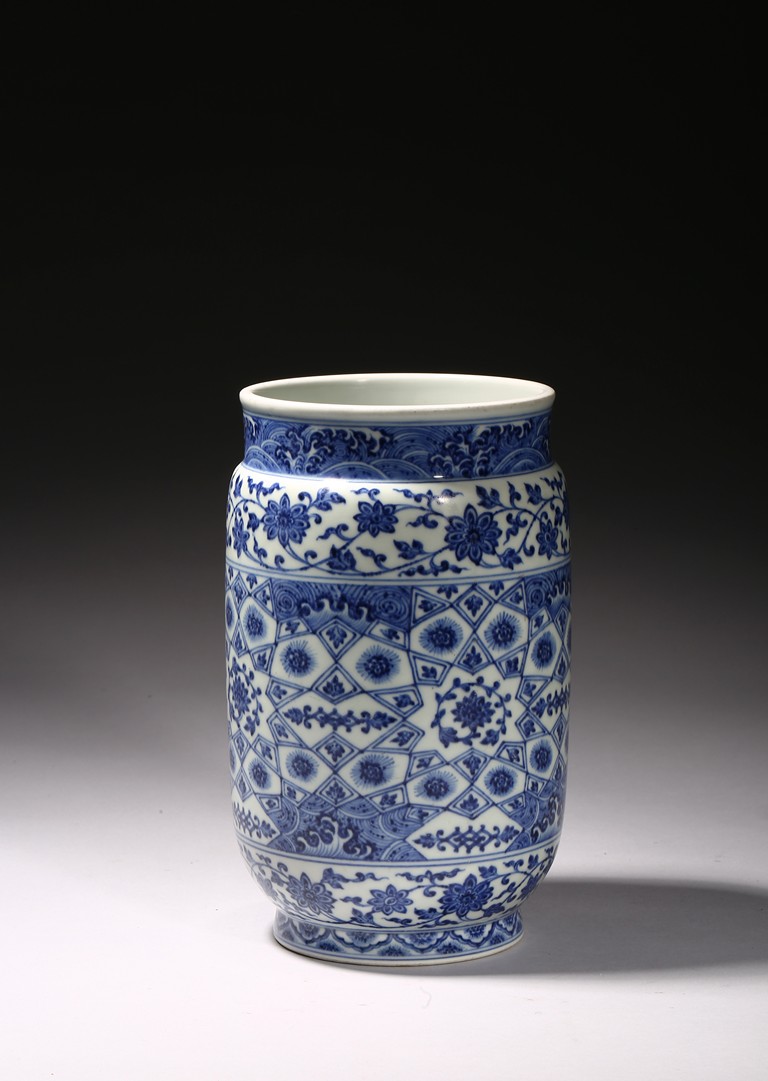 此瓶圓唇,直頸,筒腹,斂脛,圈足微外撇。自頸部以下依次飾波濤海水紋、纏枝蓮紋、冰凌錦地朵花紋、纏枝蓮紋和如意頭狀朵花紋。此瓶為仿明永宣同類之作,原名“仿宣窯青花蘆粟錦壯罐”。此拍品胎體細膩堅致,釉面光潤,青花髮色青翠艷麗,為典型的乾隆朝官窯特徵。類似拍品可參考香港蘇富比2013年秋季拍賣,拍品號3197。來源:東岸美籍日裔藏家提供