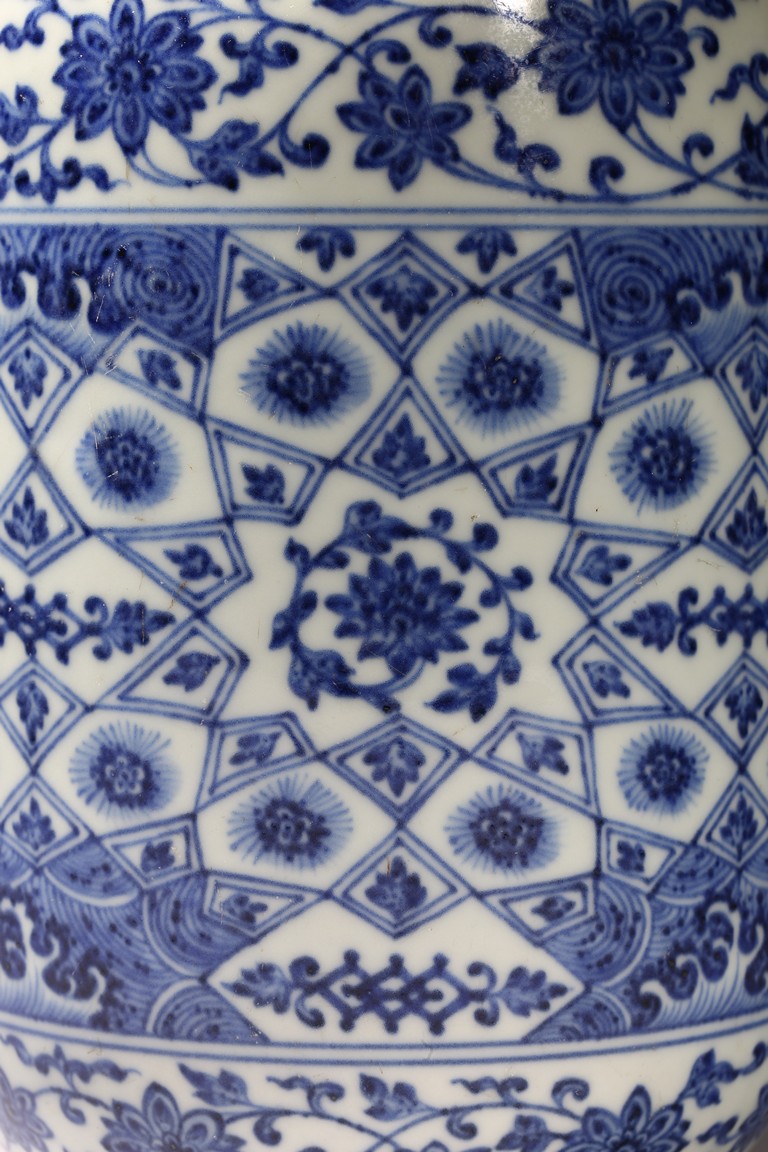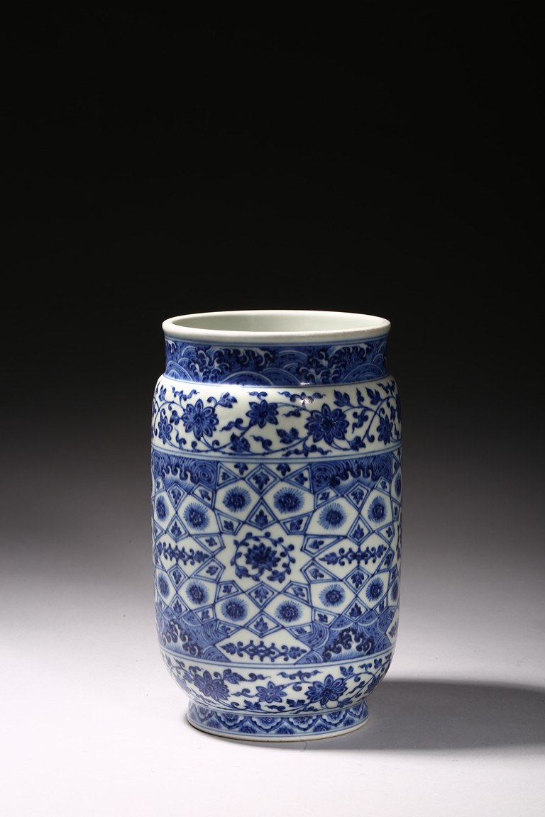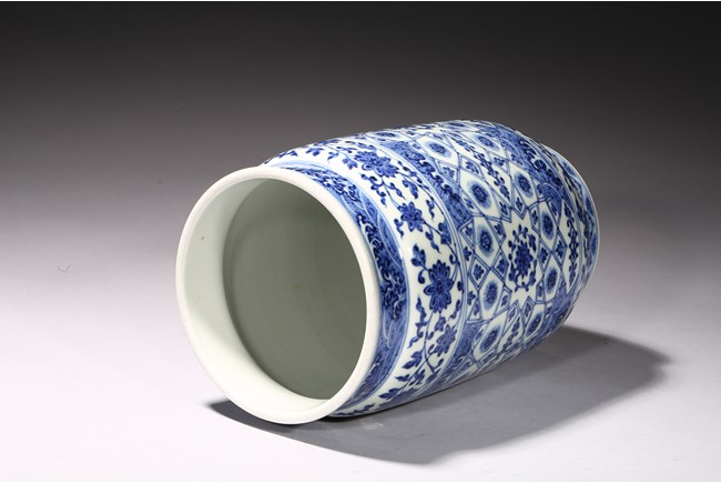 Of cylindrical form, the body finely decorated with five ten pointed star shaped panels enclosing lotus surrounded by leafy stem, in between painted with octagonal panels enclosing foliate motif, all against dense ground of geometric pattern and between two bands of lotus scrolls, the neck enamelled with a band of crashing waves. Qing Dynasty Qianlong period.