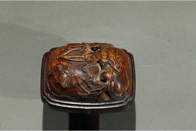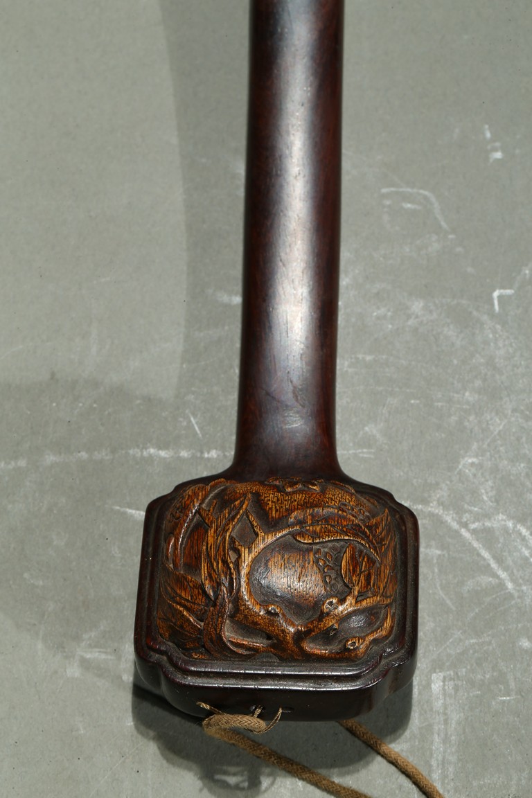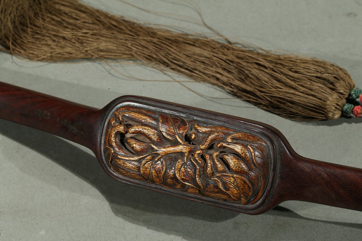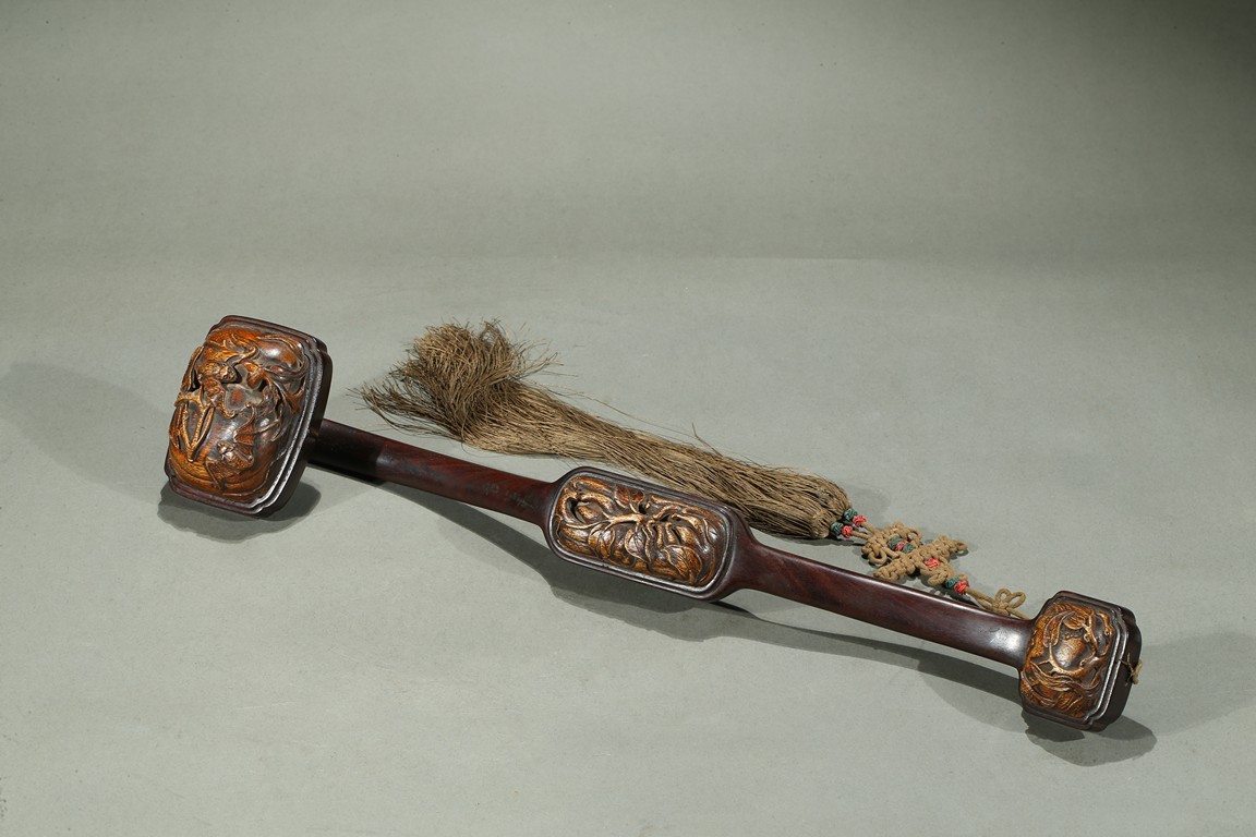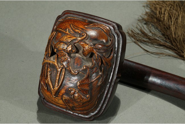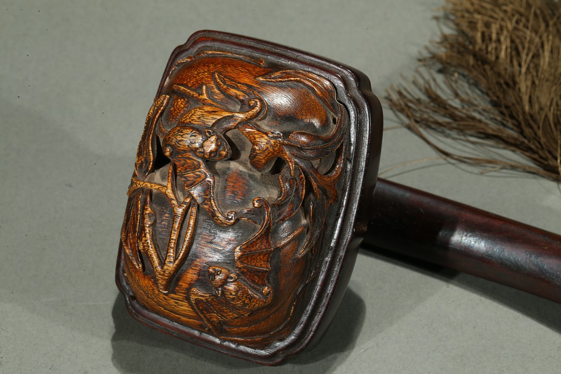 The agarwood embellished ruyi head finely carved with two auspicious bats flying among the tree branches, the rectangular shaft with various stylized leaves, the square shaped and decorated with winding leafy branches surrounded with flower patterns.