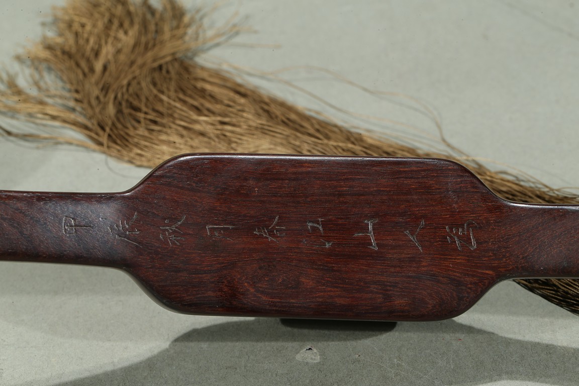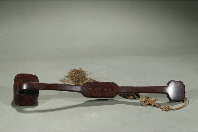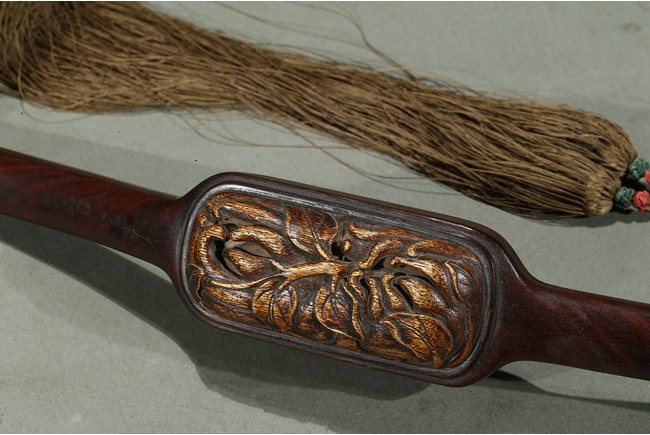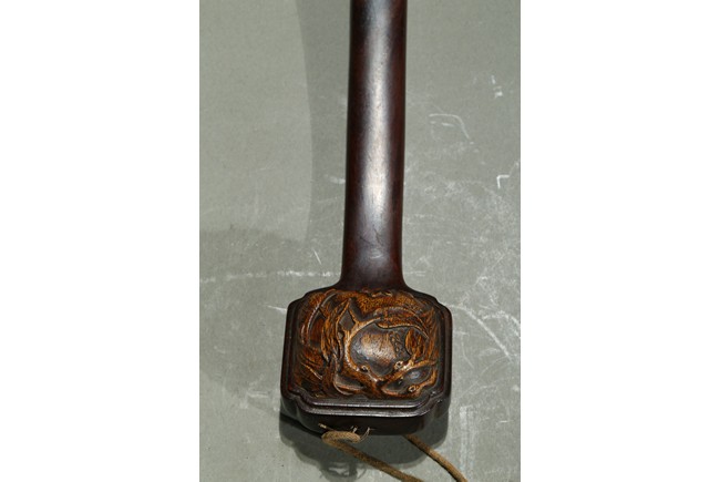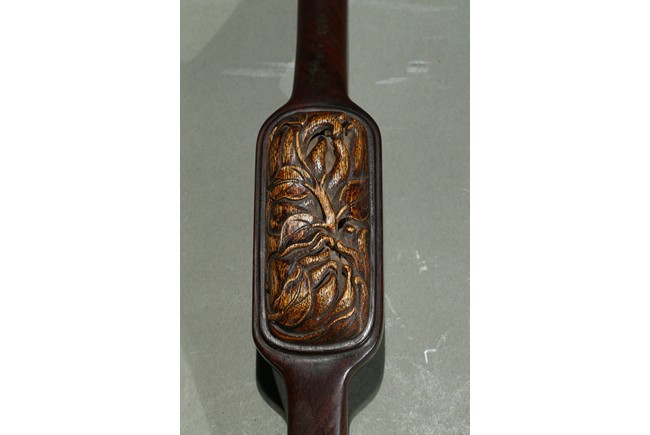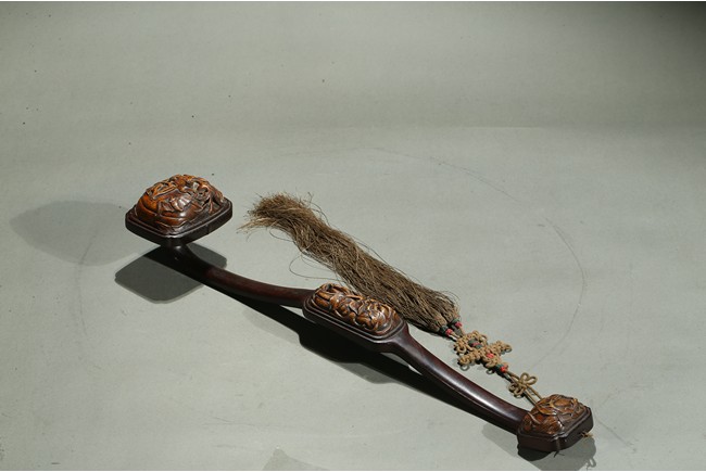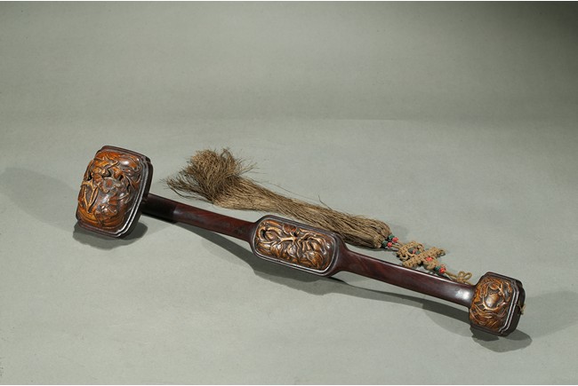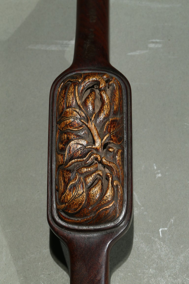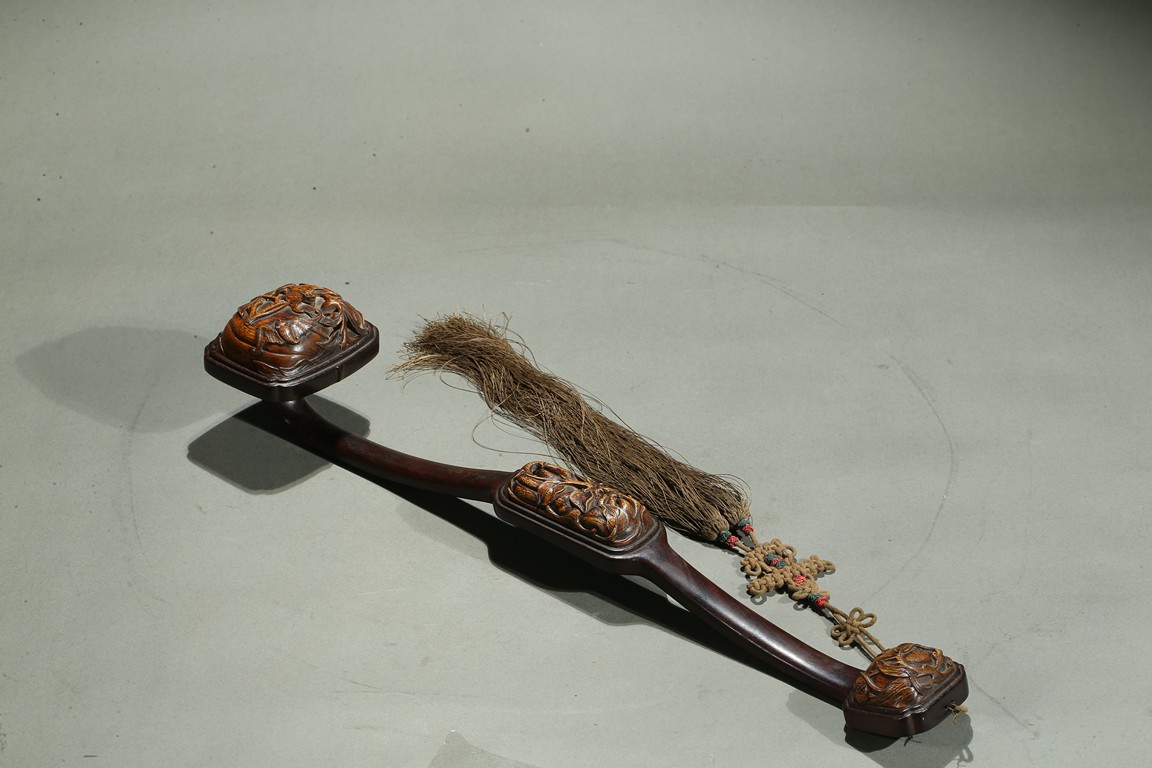 The agarwood embellished ruyi head finely carved with two auspicious bats flying among the tree branches, the rectangular shaft with various stylized leaves, the square shaped and decorated with winding leafy branches surrounded with flower patterns.