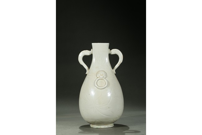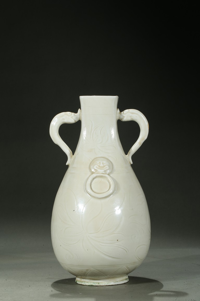 Well potted, the flattened pear shaped body rising from short foot to a flaring neck with rectangular section mouth, the neck flanked by a pair of molded handles, covered overall with white glaze, the body and neck overall carved with lotus flowers with curling leaves. Song Dynasty period.