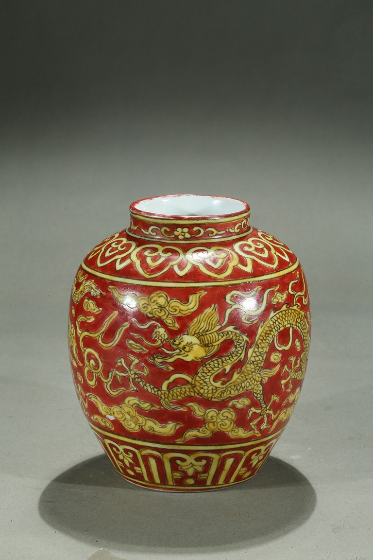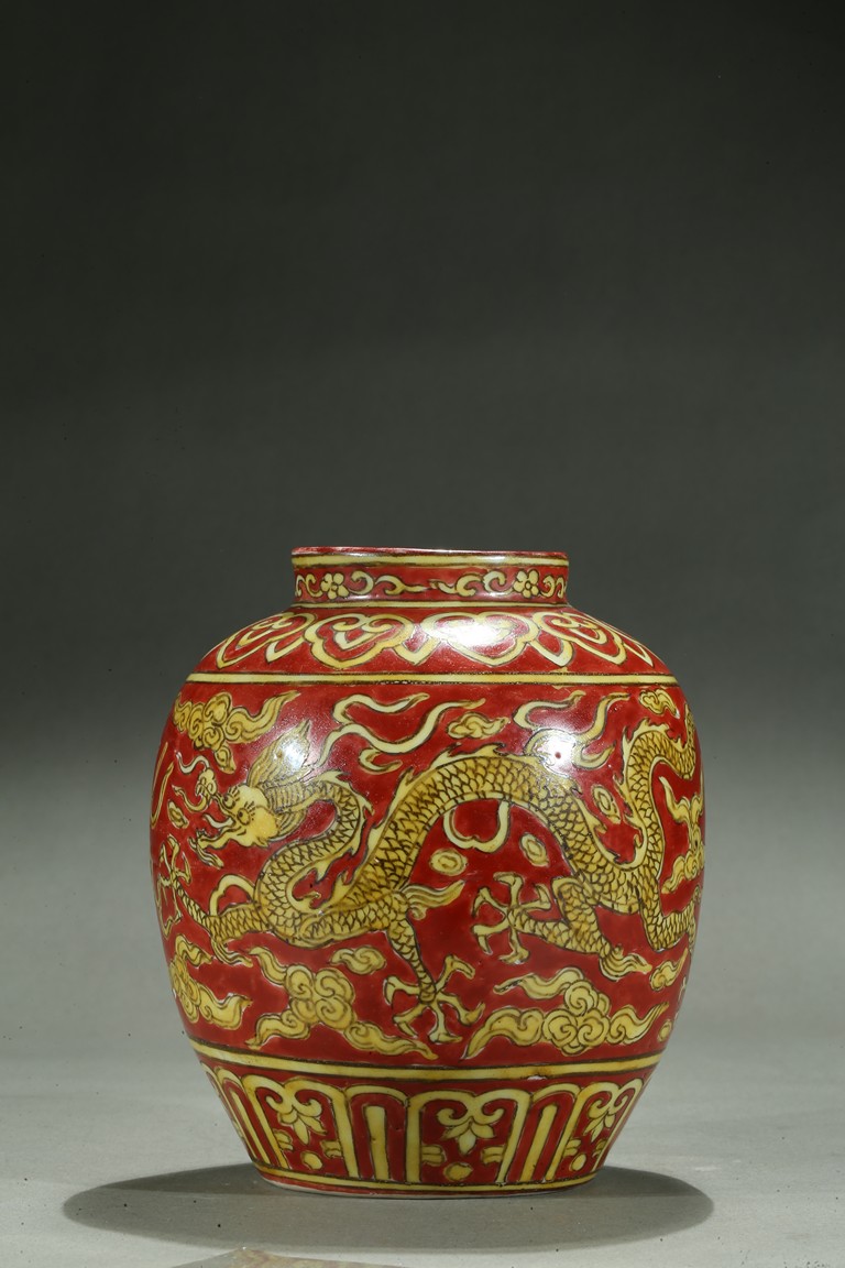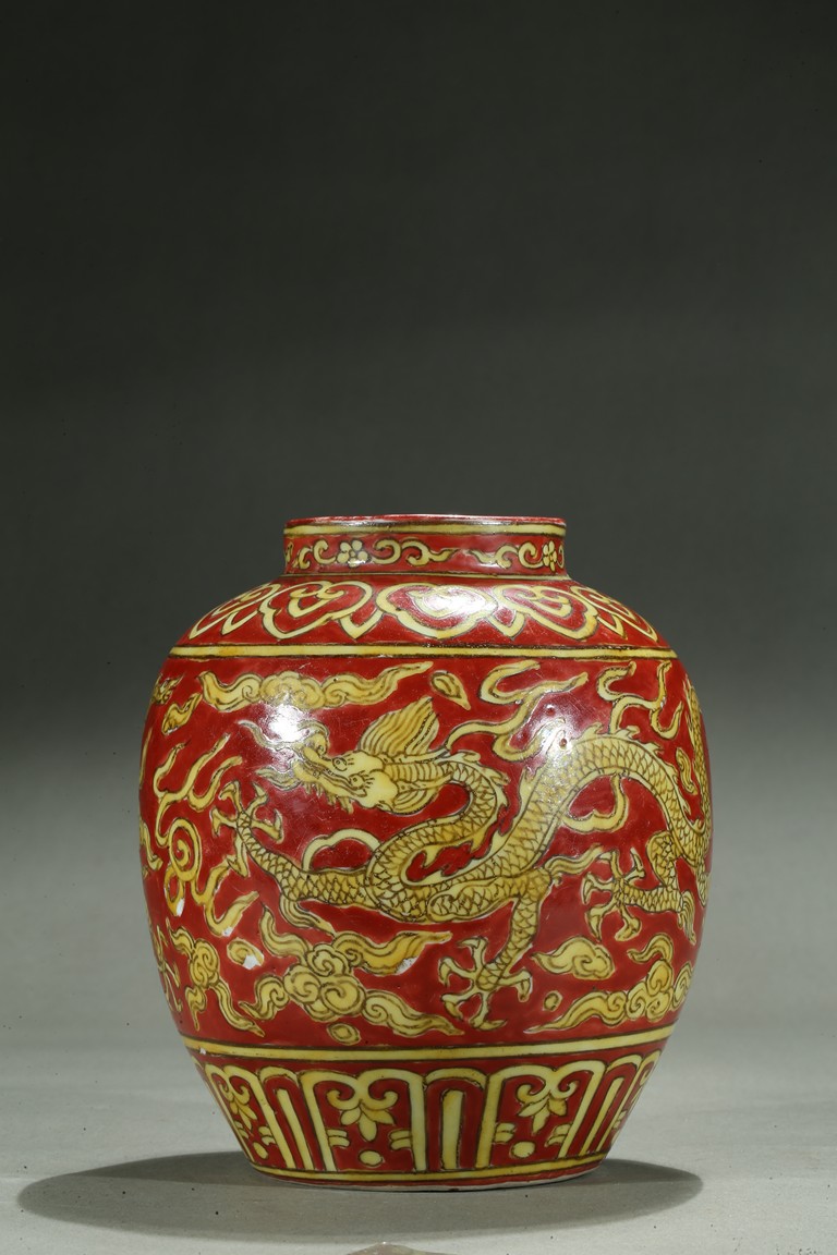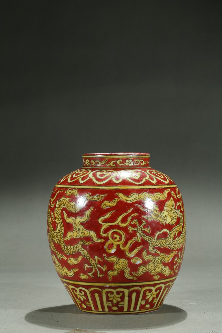 此罐圓口,短頸,圈足。外壁红釉作地,黑彩勾繪輪廓。肩飾如意雲紋,腹飾黄彩游龍靈芝紋,紋飾空處填紅釉為地。內部、圈足內施透明釉,外底青花書「大明嘉靖年制」楷書款。 紅地黃彩器為明代嘉靖朝特有品種,需先以1300攝氏溫度燒好白瓷,再於外壁釉上施以黃彩以較低的溫度入窯復燒,再以黑彩點睛、描繪輪廓,並以礬紅彩塗地,然後第三次入窯燒造。因過程繁複,難度極高,故傳世品數量稀少。