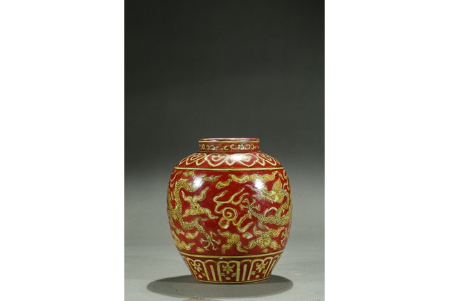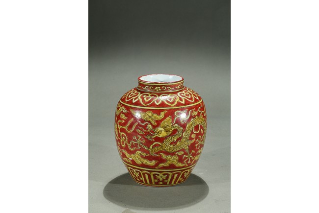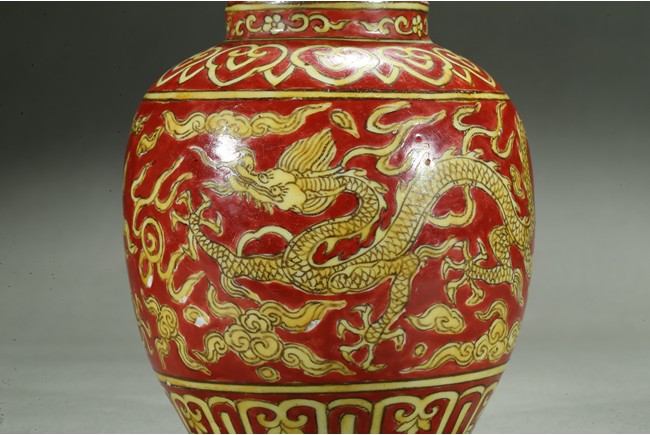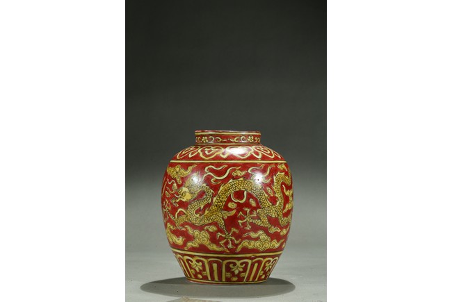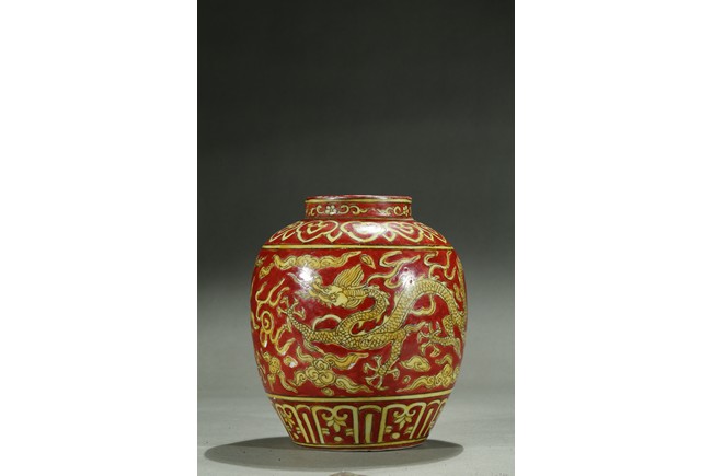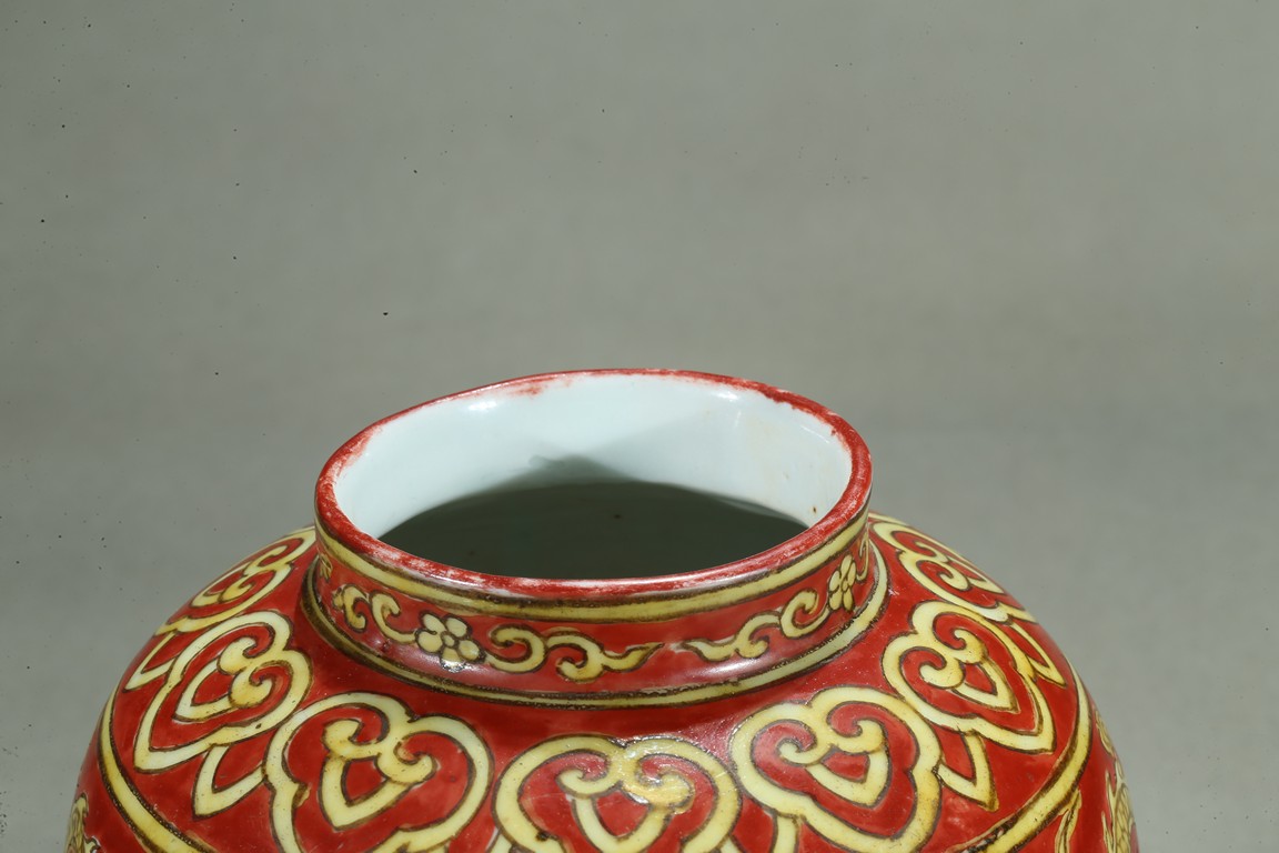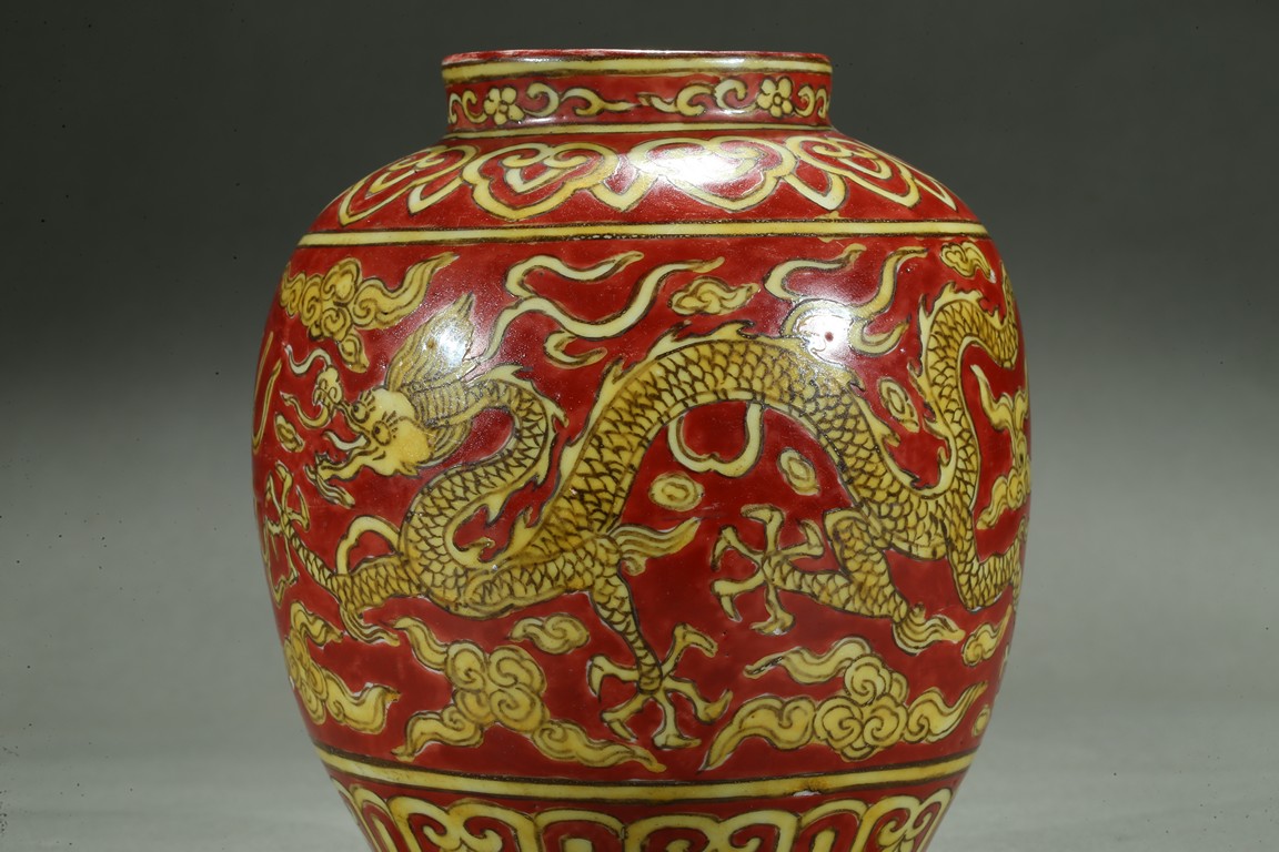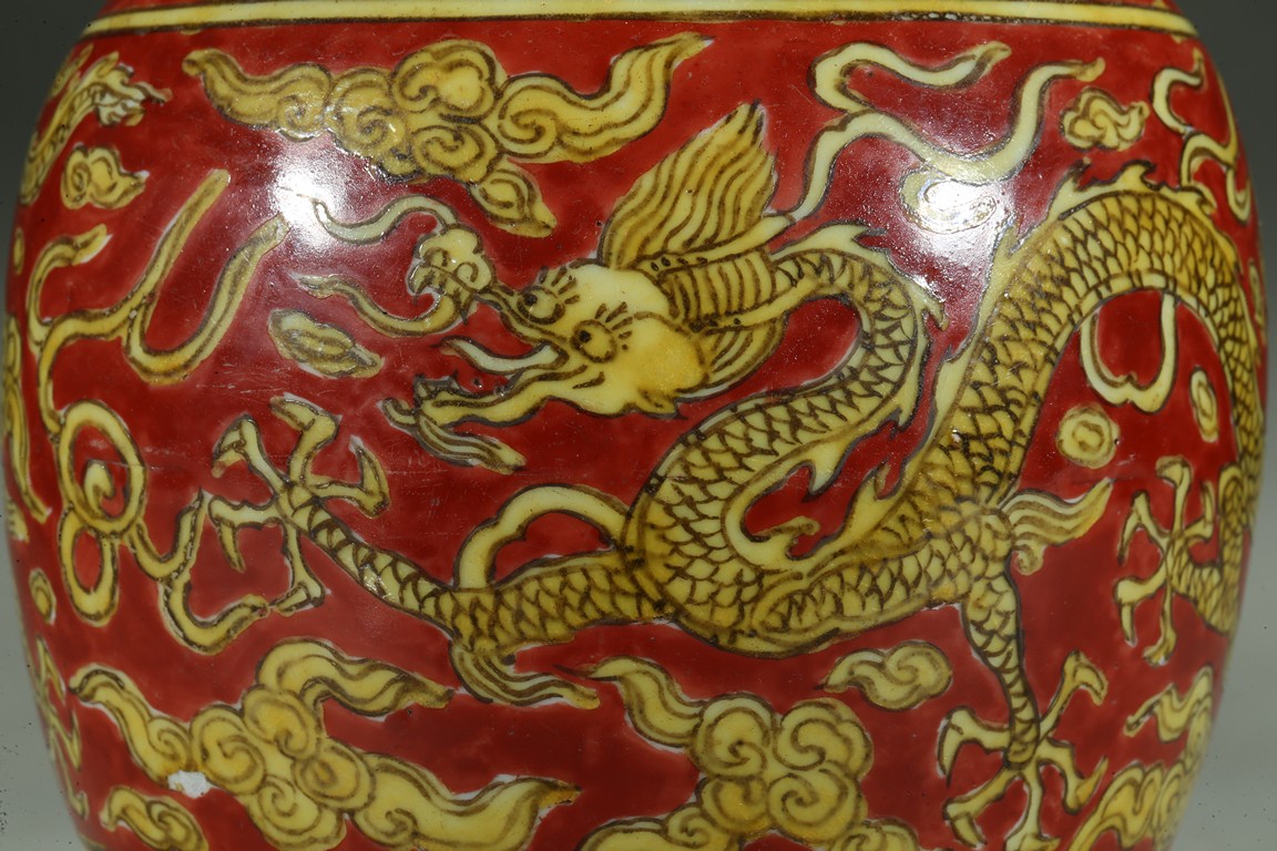 此罐圓口,短頸,圈足。外壁红釉作地,黑彩勾繪輪廓。肩飾如意雲紋,腹飾黄彩游龍靈芝紋,紋飾空處填紅釉為地。內部、圈足內施透明釉,外底青花書「大明嘉靖年制」楷書款。 紅地黃彩器為明代嘉靖朝特有品種,需先以1300攝氏溫度燒好白瓷,再於外壁釉上施以黃彩以較低的溫度入窯復燒,再以黑彩點睛、描繪輪廓,並以礬紅彩塗地,然後第三次入窯燒造。因過程繁複,難度極高,故傳世品數量稀少。