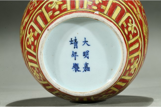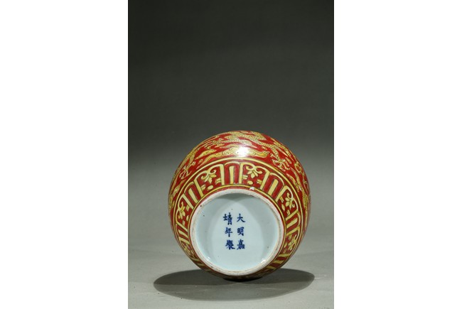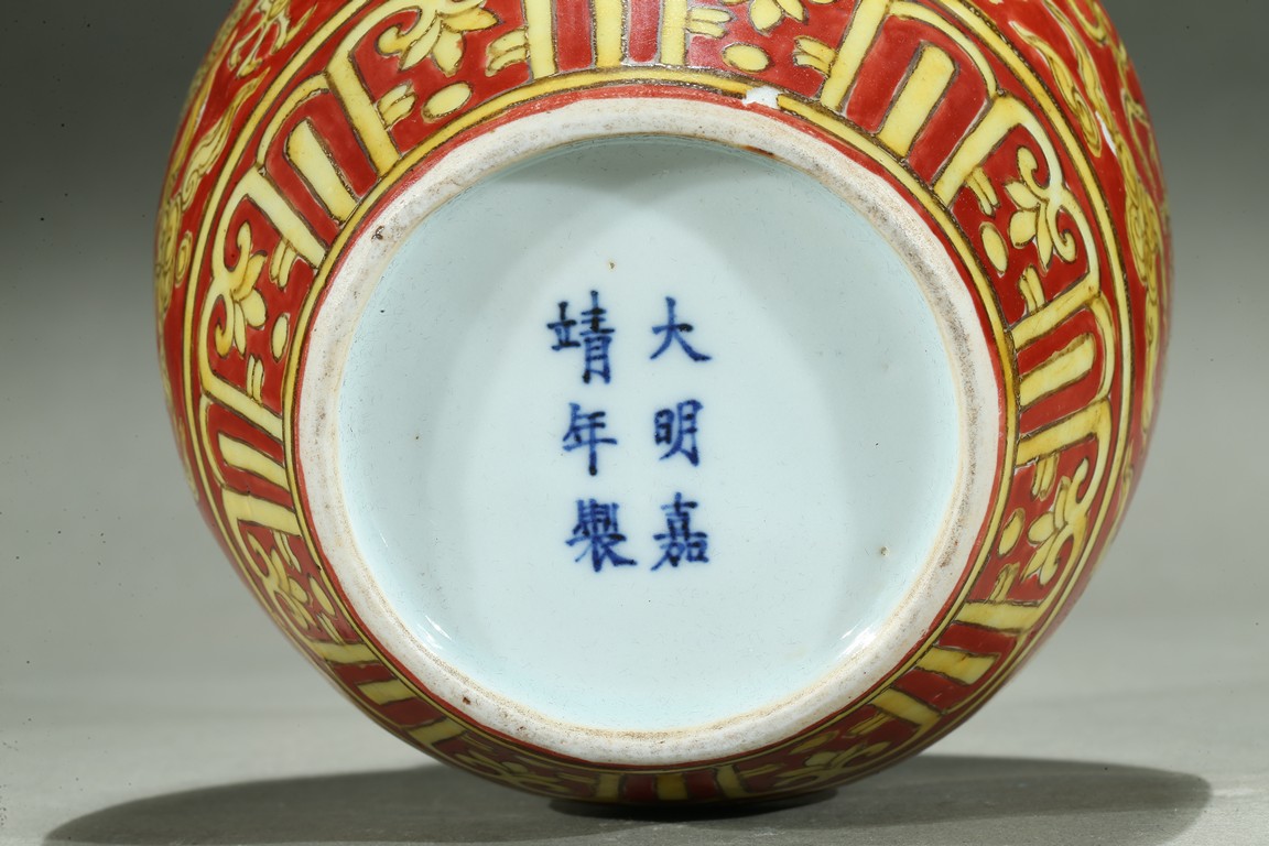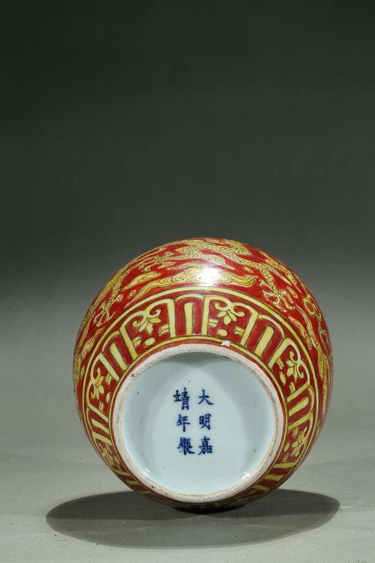 Of bulbous form with rounded sides rising from base to broad shoulders, the body brightly decorated with yellow enamel on iron red ground, depicting two five clawed sinuous dragons travelling through auspicious clouds chasing flaming pearl, all between pendant ruyi heads and upright lappets, the base with six character Jiajing mark. Ming Dynasty Jiajing period.