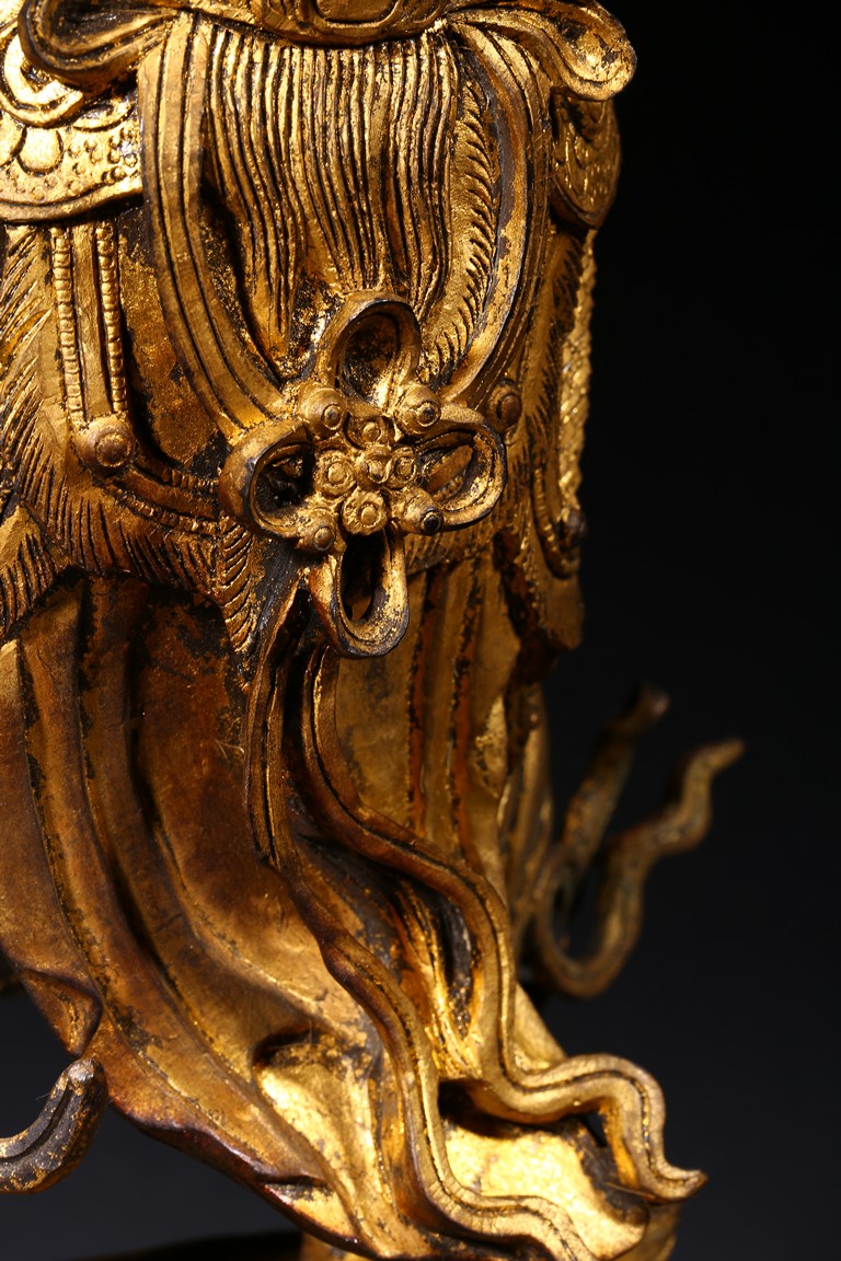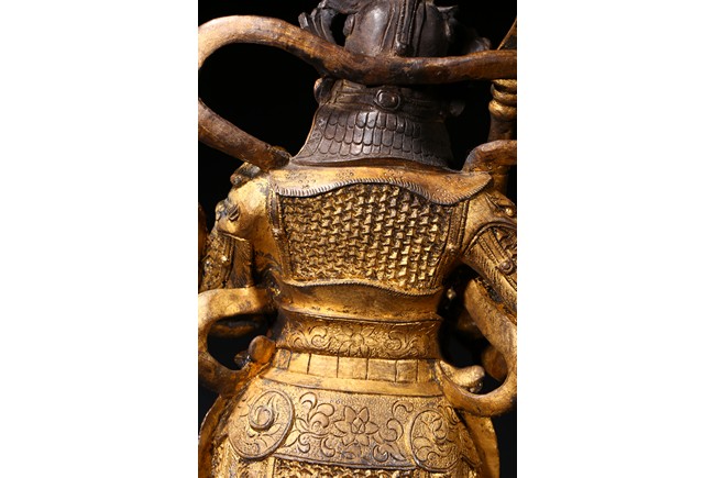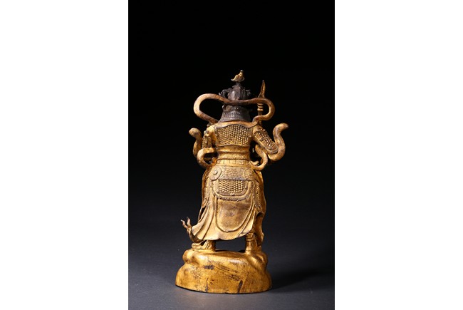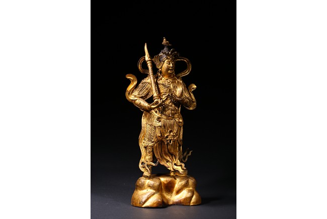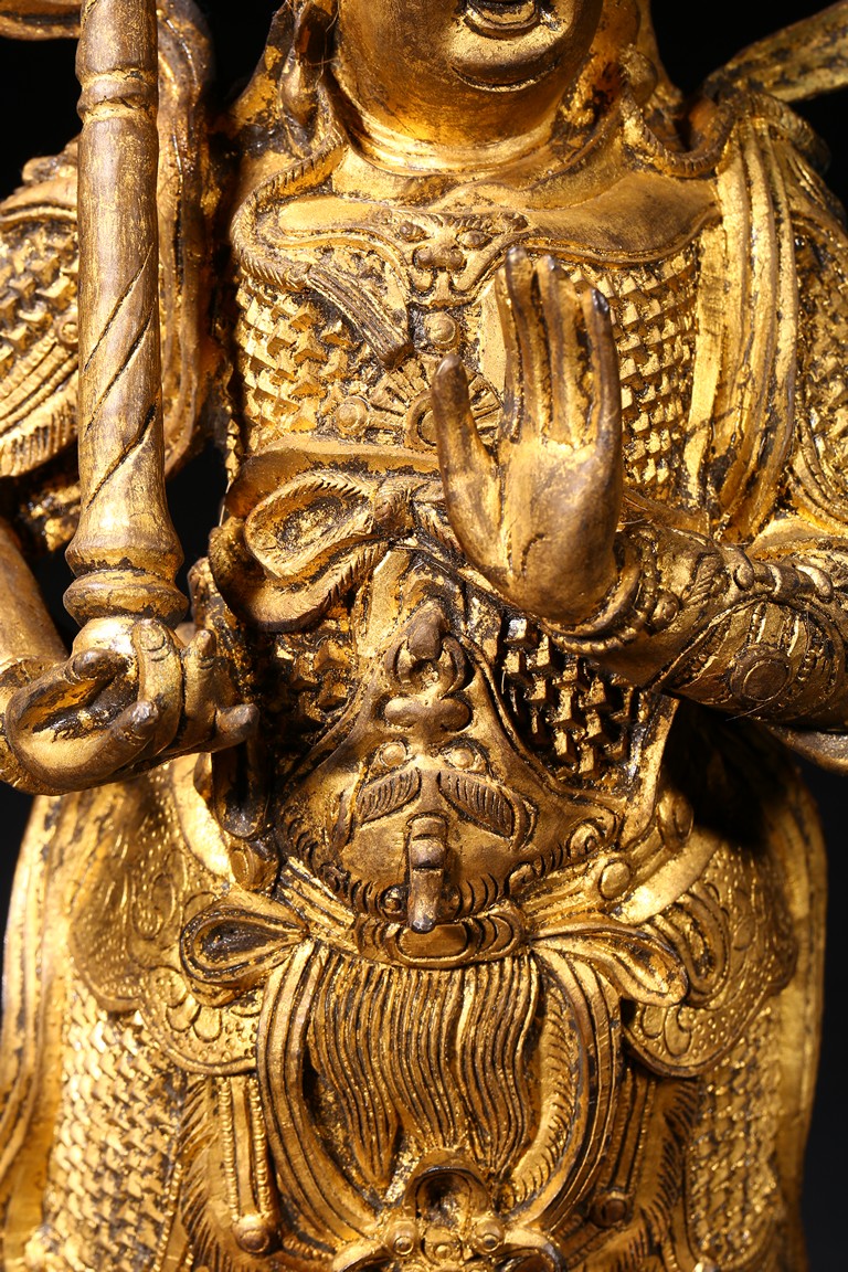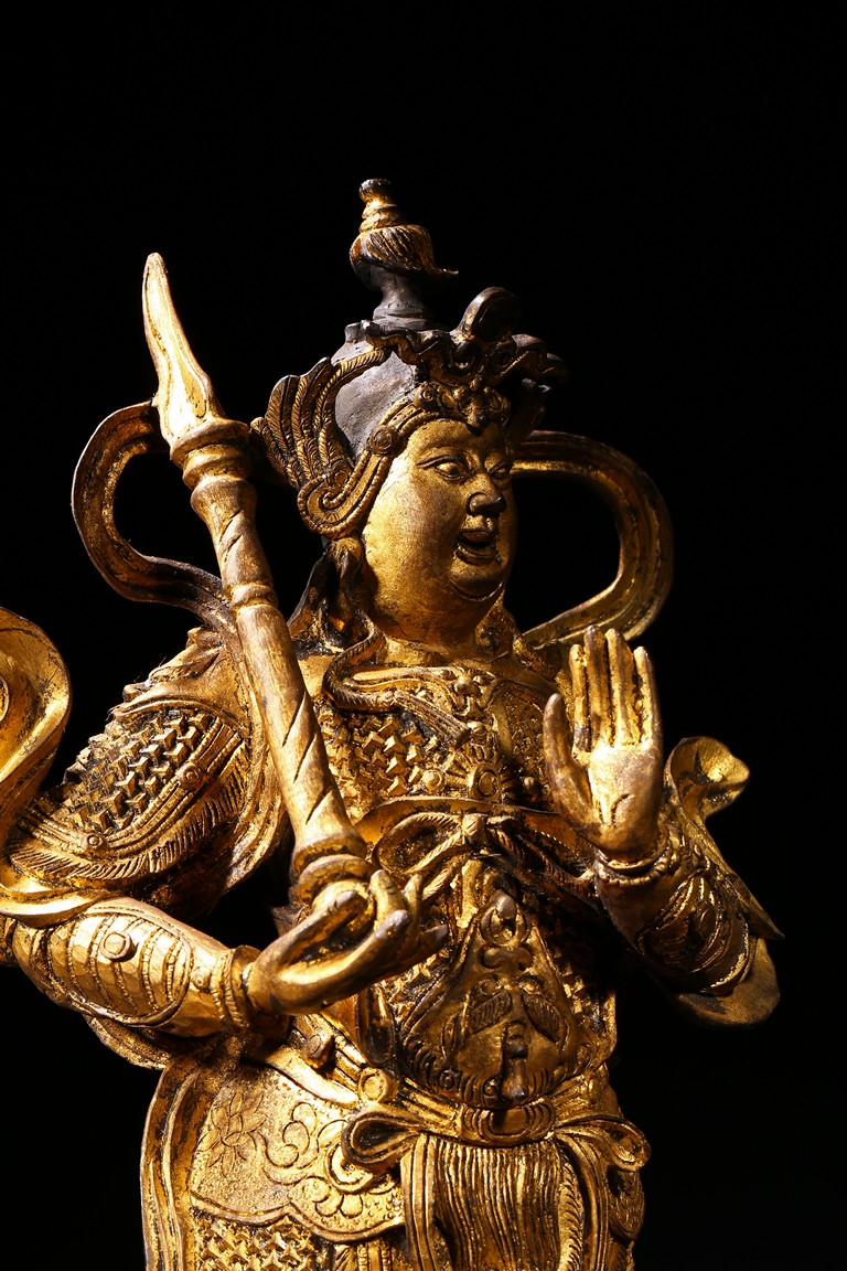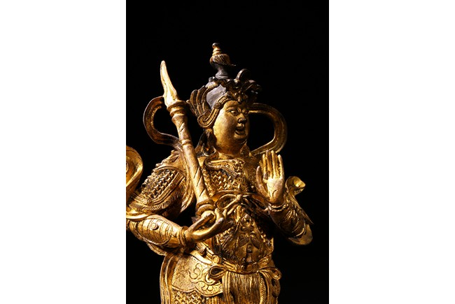 The skanda is shown standing and dressed in a scale-armor with a celestial ribbon across shoulders, his right hand holding a weapon in a non-threatening manner, the left hand raised, face with serene expression. Ming Dynasty period.