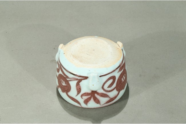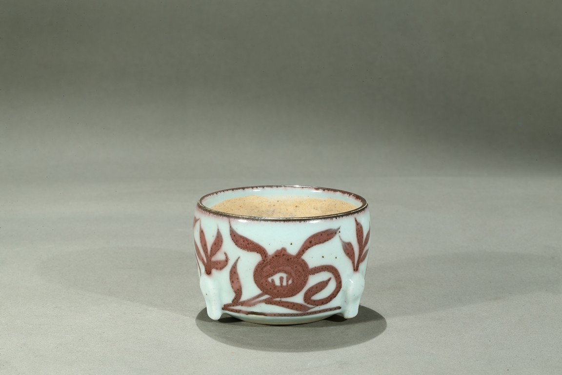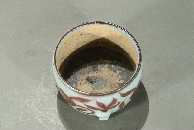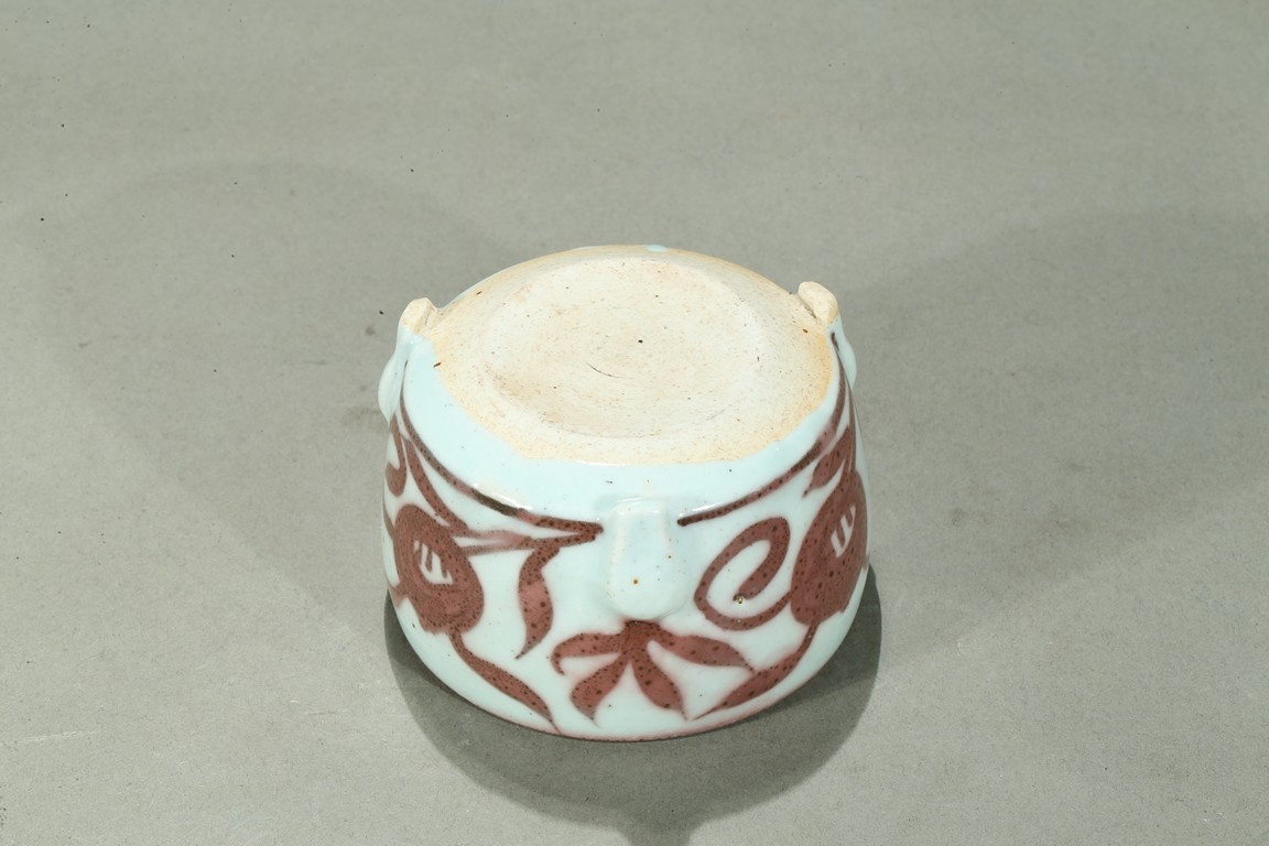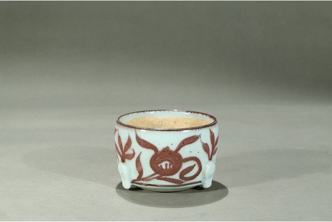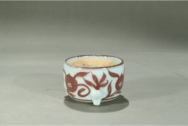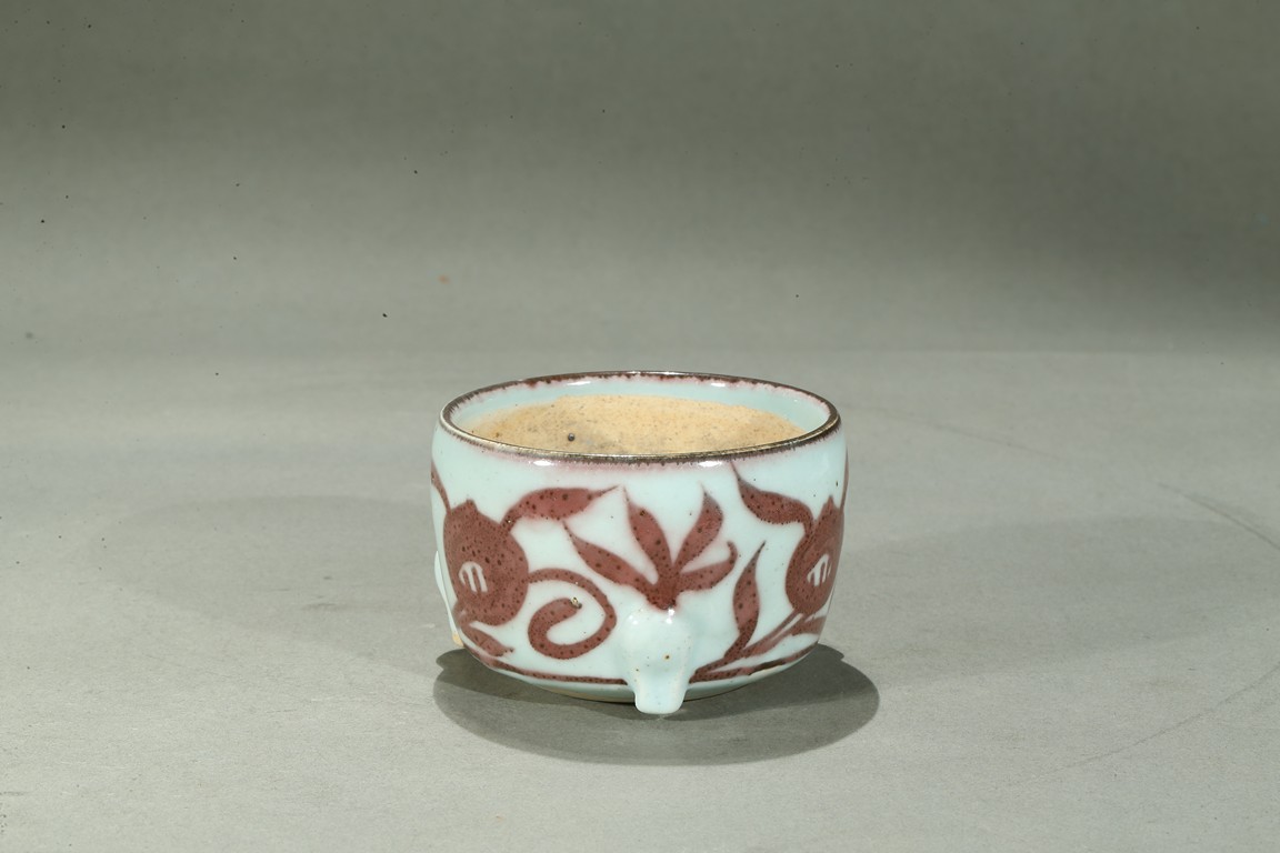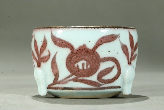 Supported on three shot feet, the bowl finely painted to the exterior with leafy peach in underglaze red, the interior and foot unglazed. Yuan Dynasty period.