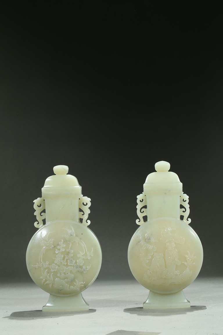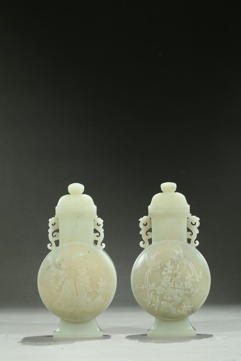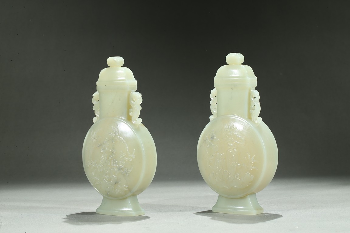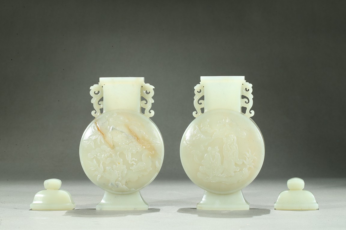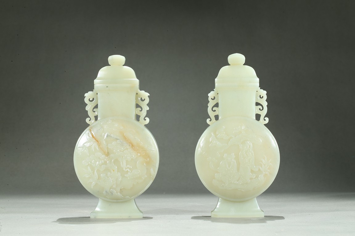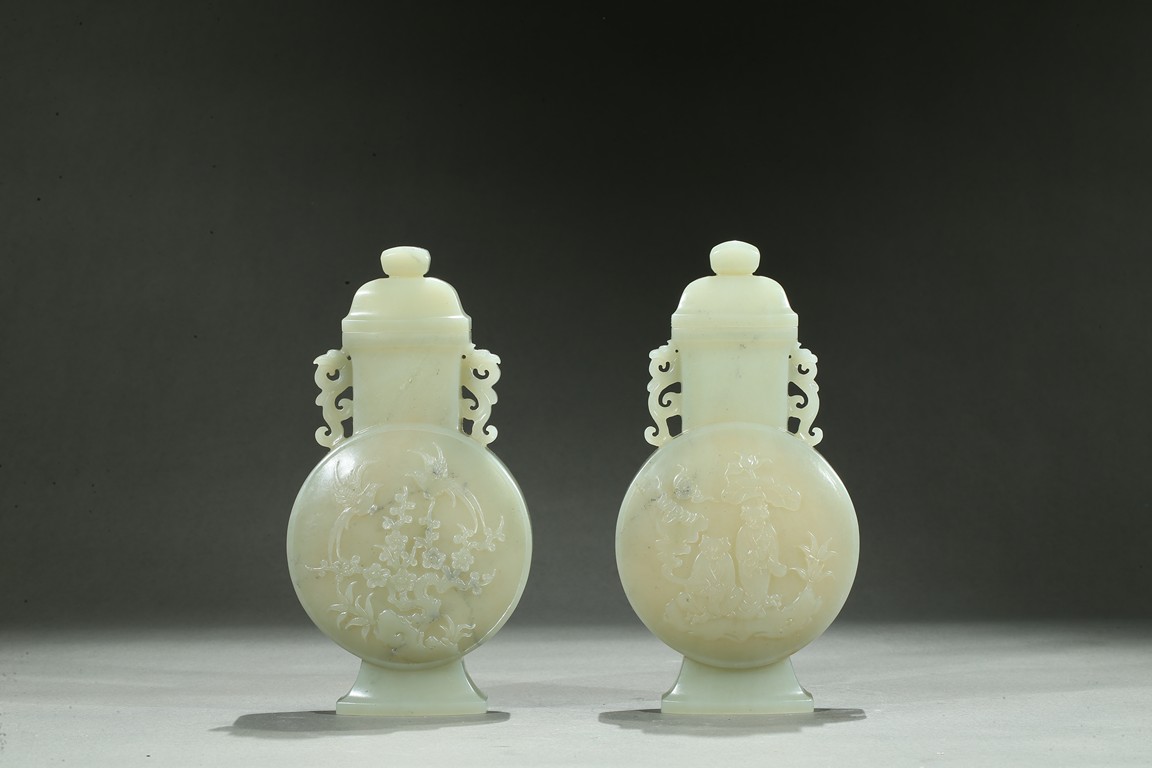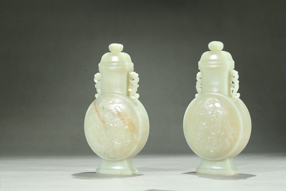 Each body of flattened globular form, the body delicately carved in shallow relief, depicting scenes of the two 'He he' immortals as well as bird and flowers. The body rising from a spreading foot to a straight neck, the neck flanked by a pair of scroll handles, the domed cover topped with knop finial. Qing Dynasty period.