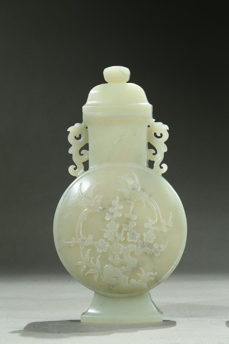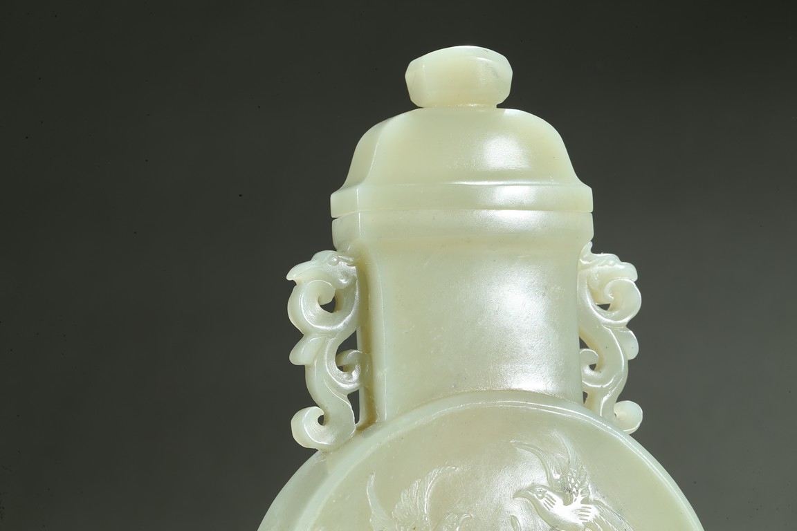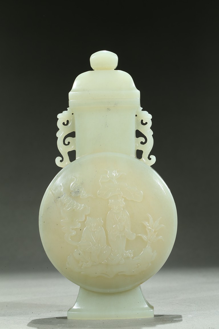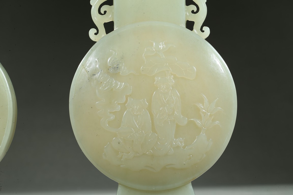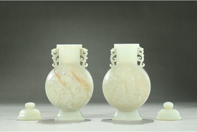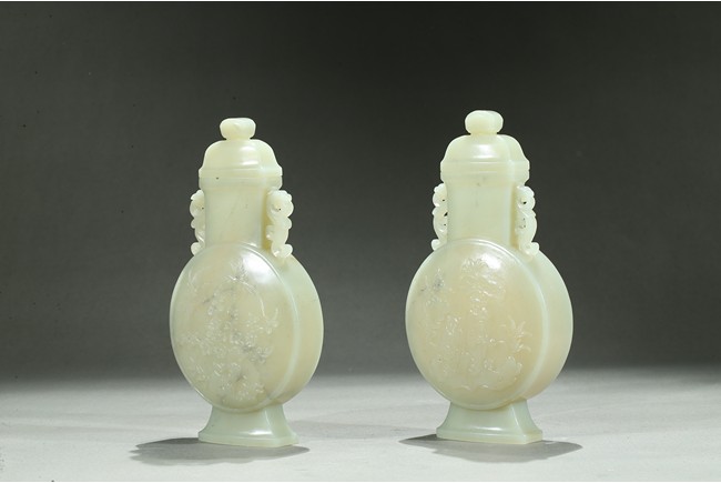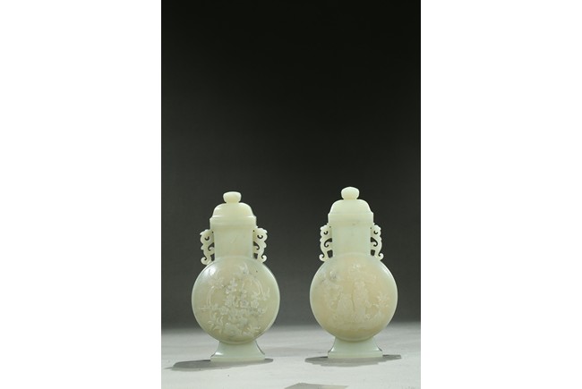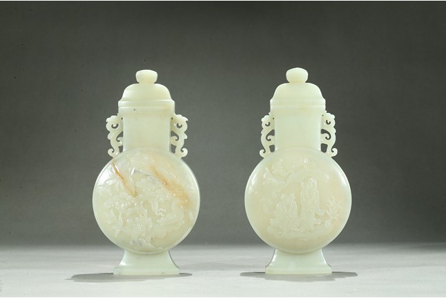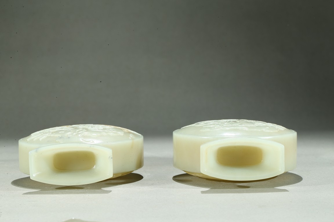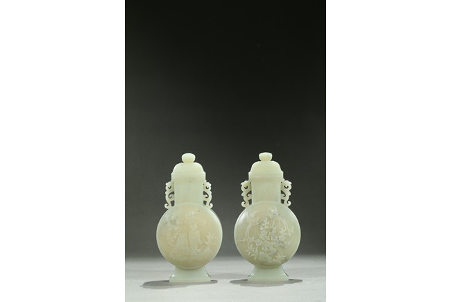 Each body of flattened globular form, the body delicately carved in shallow relief, depicting scenes of the two 'He he' immortals as well as bird and flowers. The body rising from a spreading foot to a straight neck, the neck flanked by a pair of scroll handles, the domed cover topped with knop finial. Qing Dynasty period.