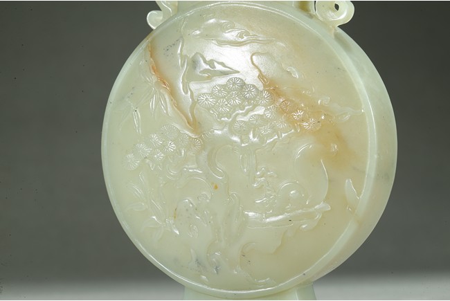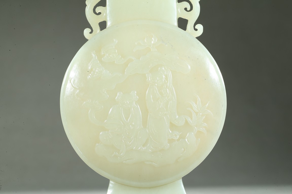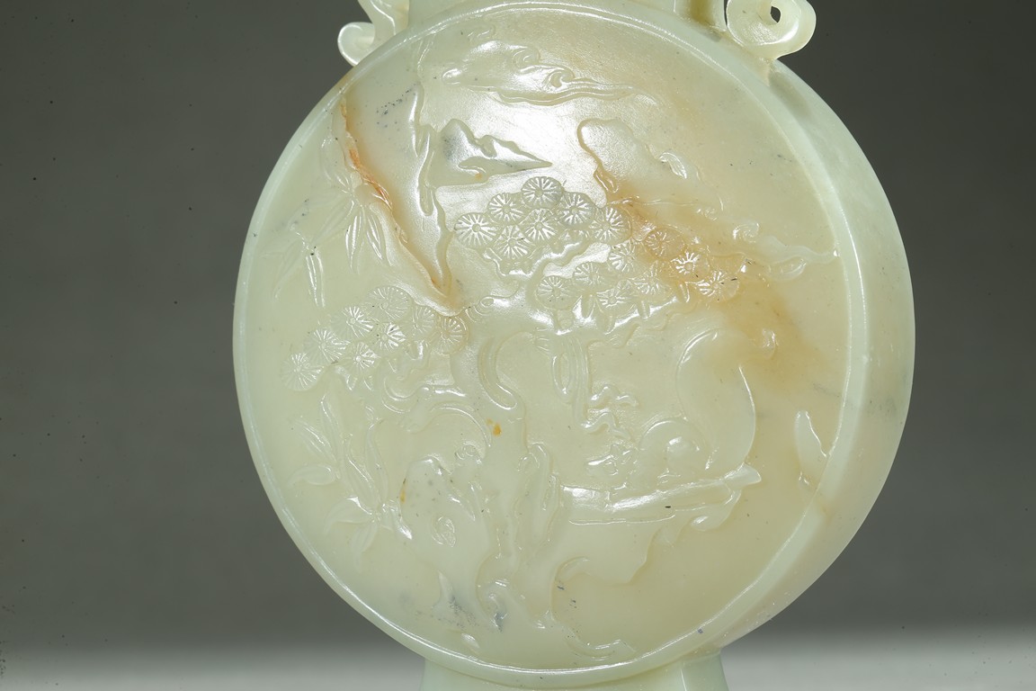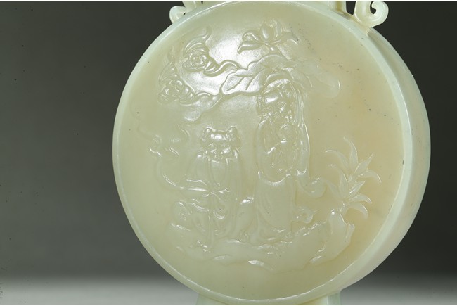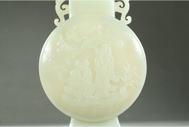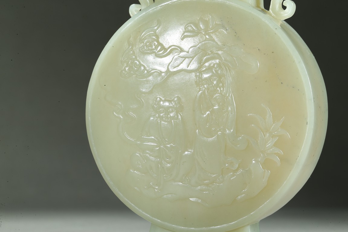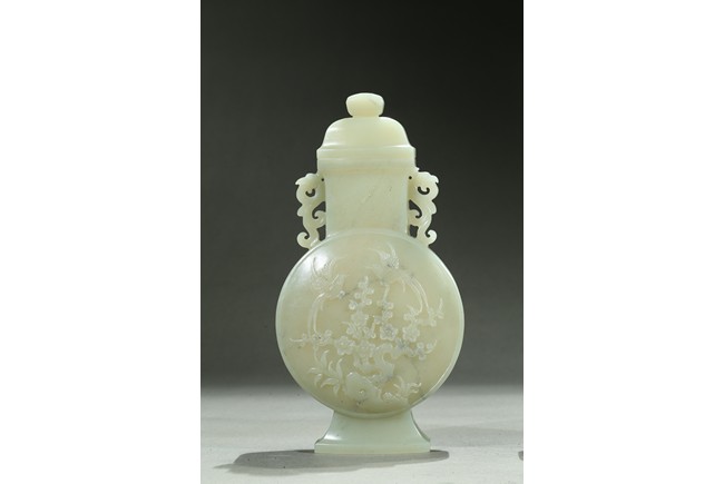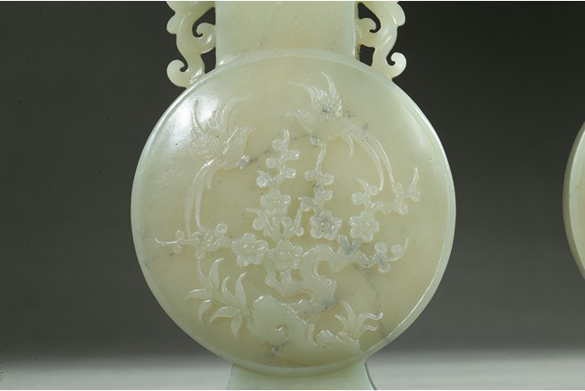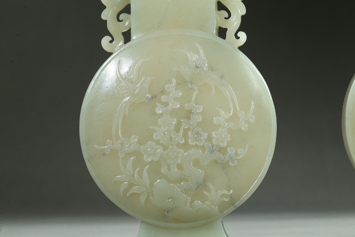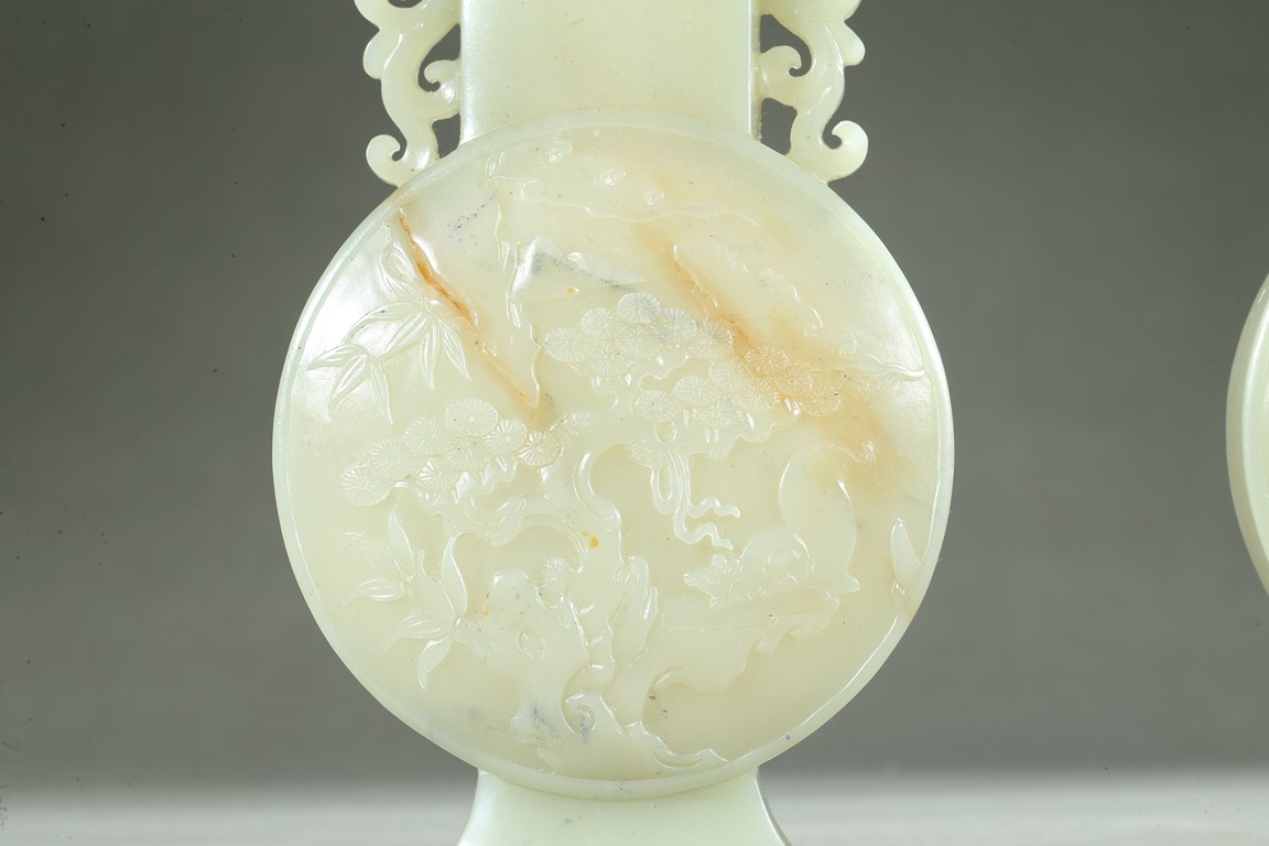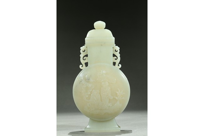 Each body of flattened globular form, the body delicately carved in shallow relief, depicting scenes of the two 'He he' immortals as well as bird and flowers. The body rising from a spreading foot to a straight neck, the neck flanked by a pair of scroll handles, the domed cover topped with knop finial. Qing Dynasty period.