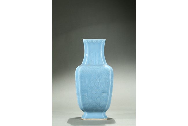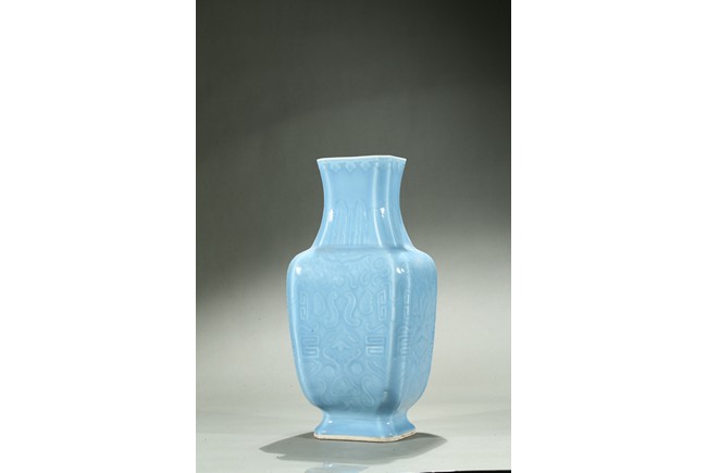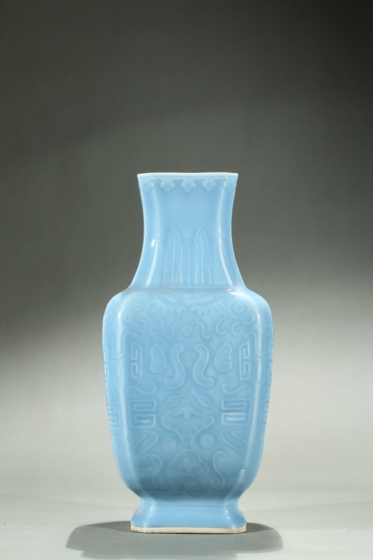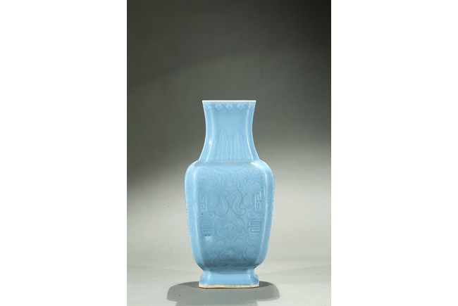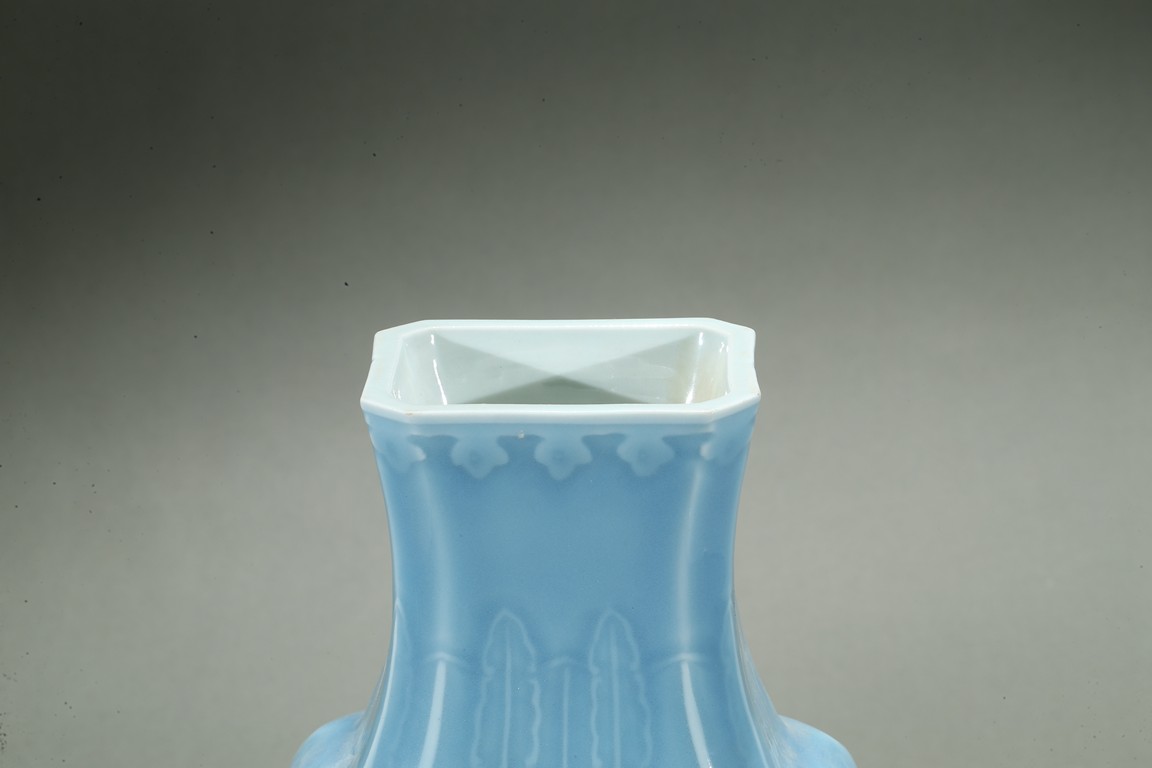 The rectangular body moulded with stylized archaic taotie masks, the waisted neck with overlapping plantain leaves, all covered in attractive pale blue glaze, the base impressed with six character Qianlong mark.