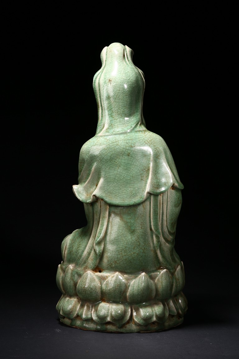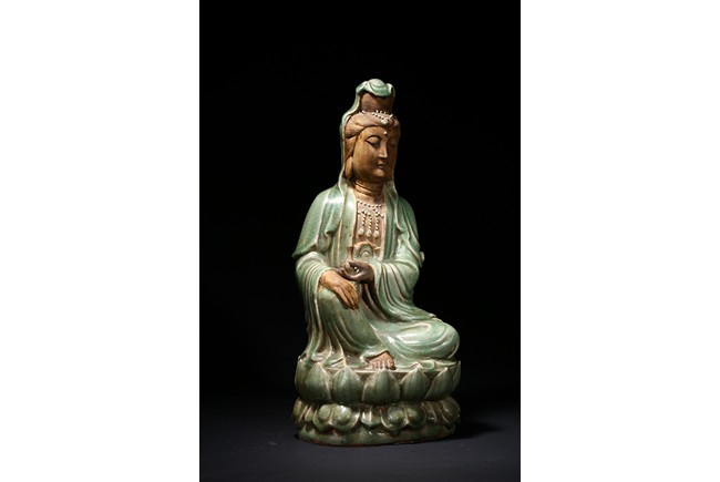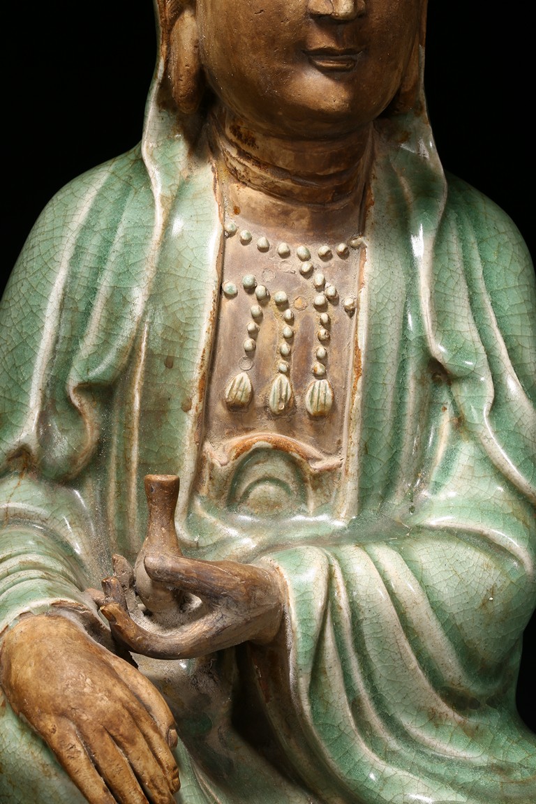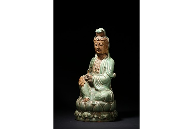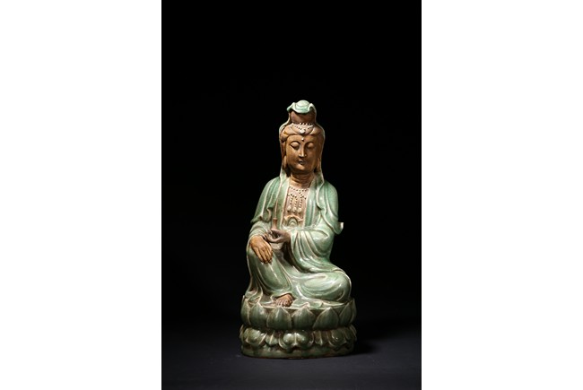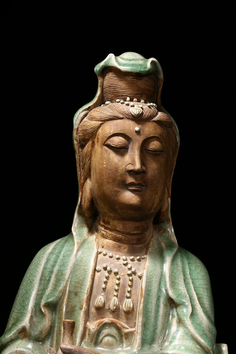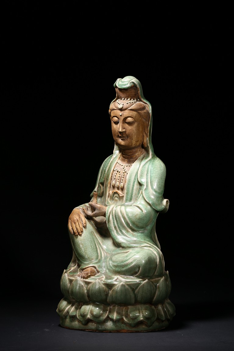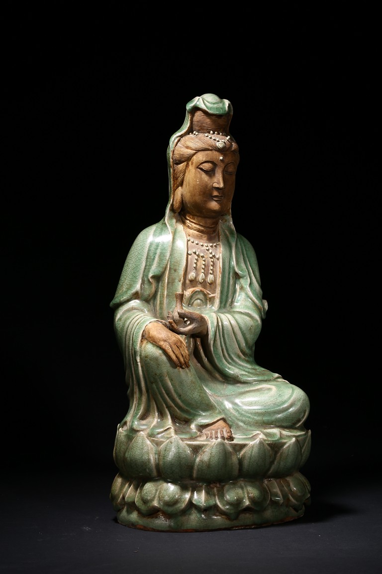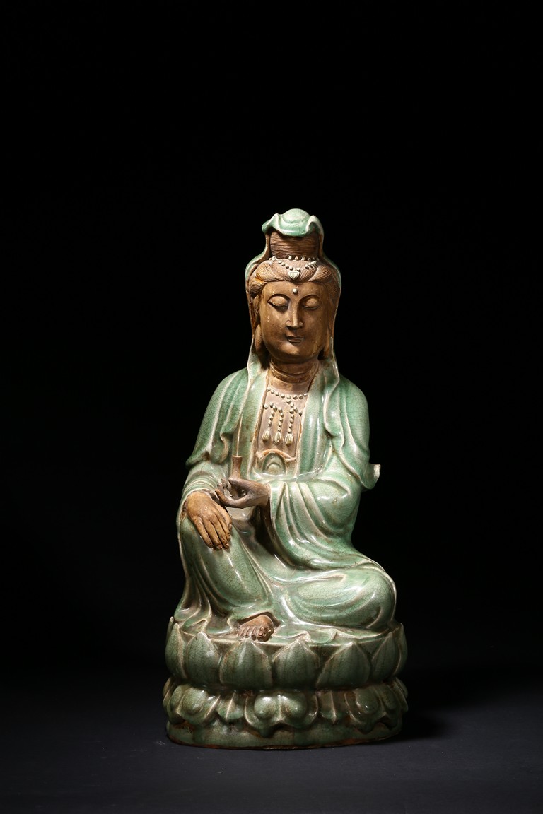Finely modelled in the form of guanyin sitting on a lotus throne in royal posture, left hand holding a vase, right hand resting on knee, wearing loose fitting robe and hair tied into chignon under veil. The lotus throne, robe, and veil are all covered in a olive green glaze, the face, chest, and hands unglazed. Qing Dynasty period.