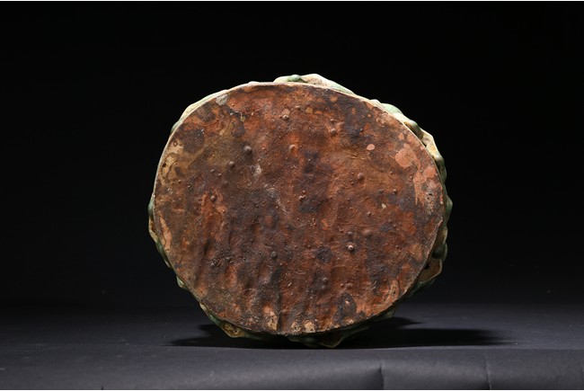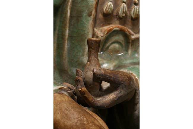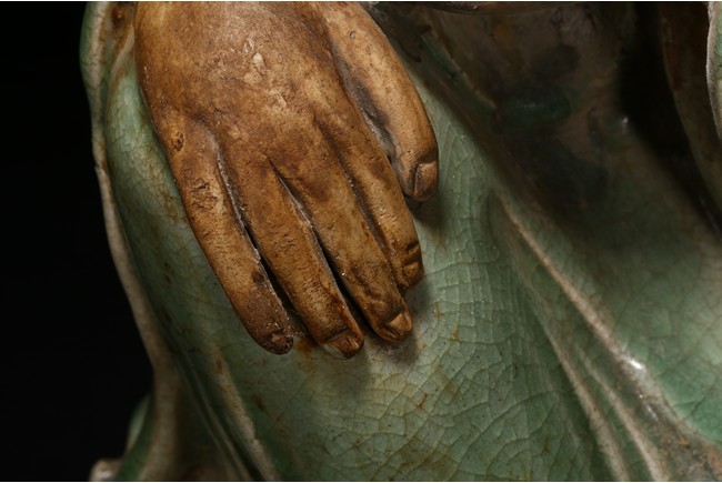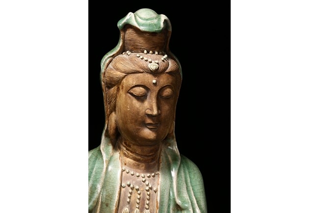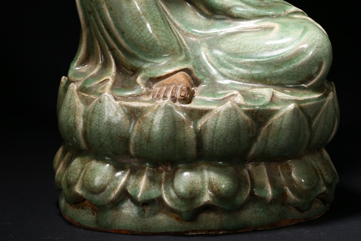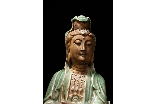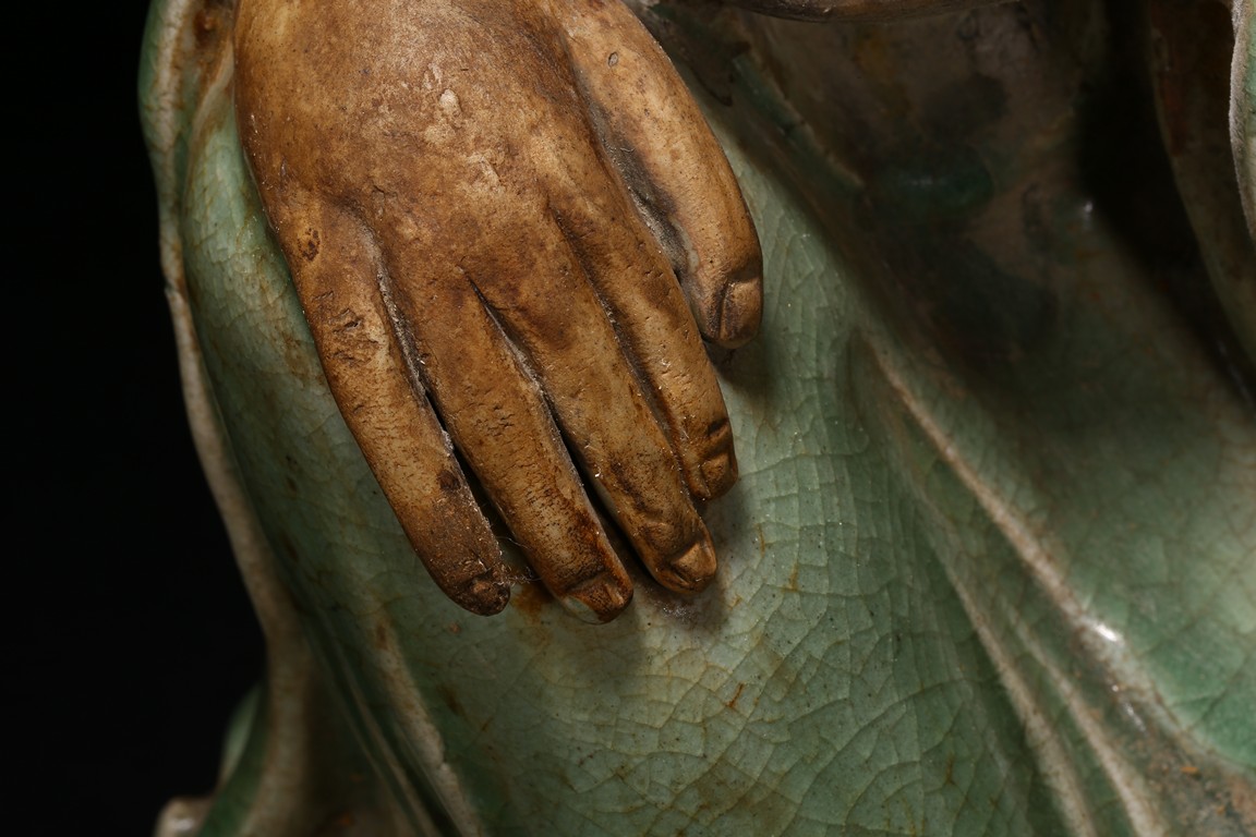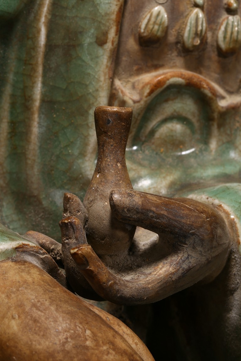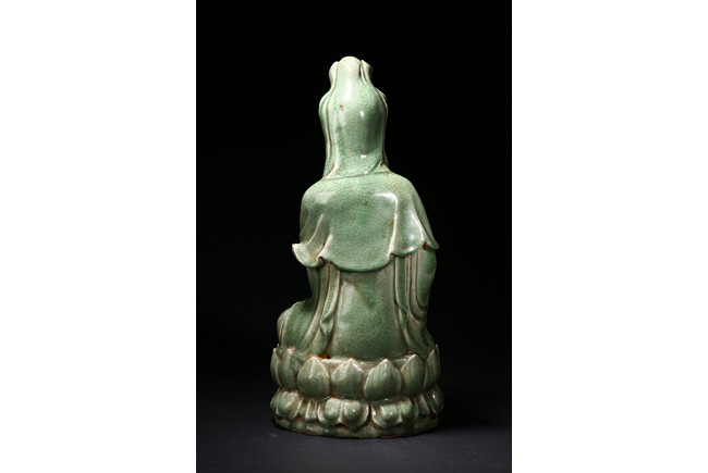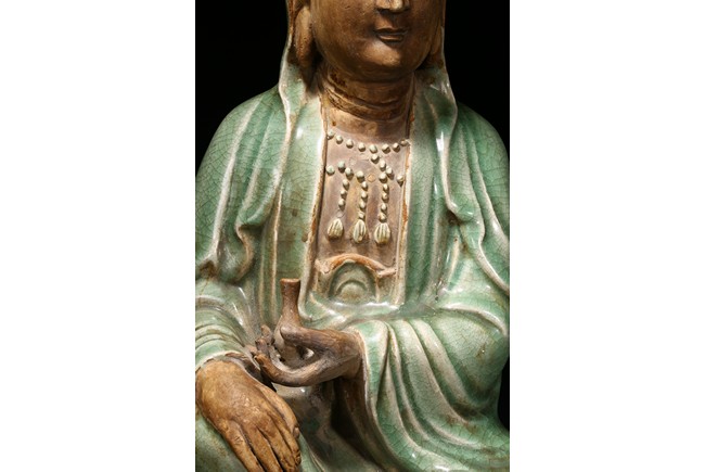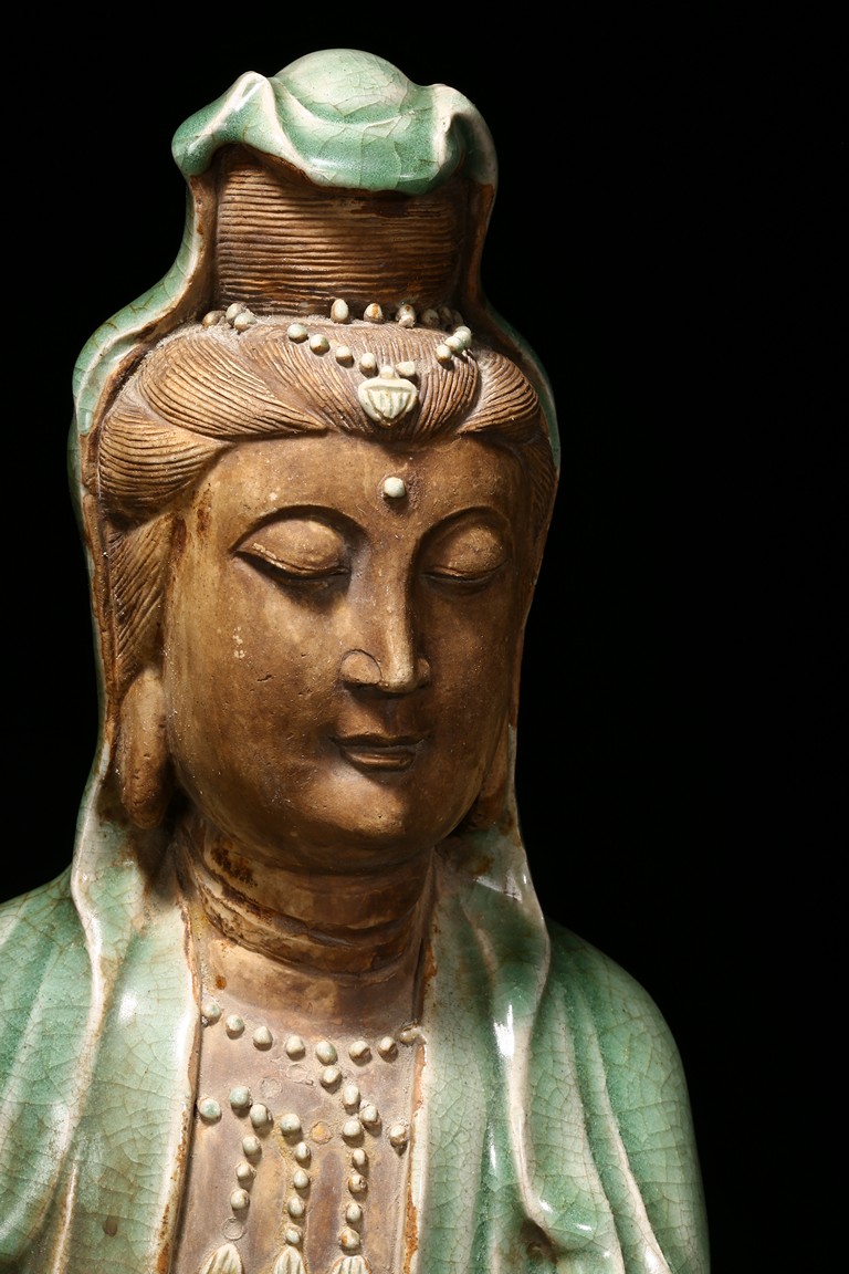 Finely modelled in the form of guanyin sitting on a lotus throne in royal posture, left hand holding a vase, right hand resting on knee, wearing loose fitting robe and hair tied into chignon under veil. The lotus throne, robe, and veil are all covered in a olive green glaze, the face, chest, and hands unglazed. Qing Dynasty period.