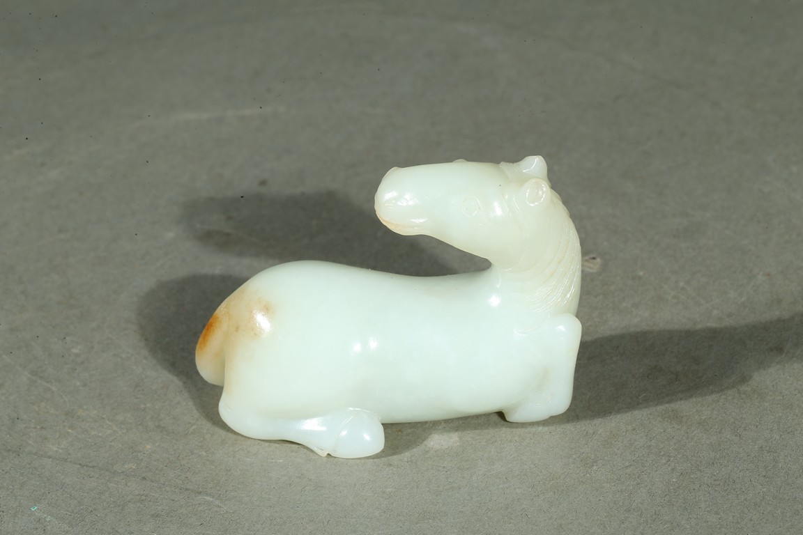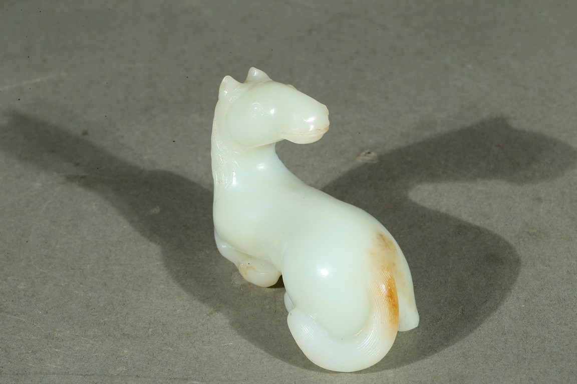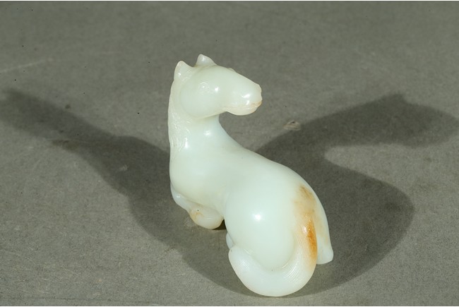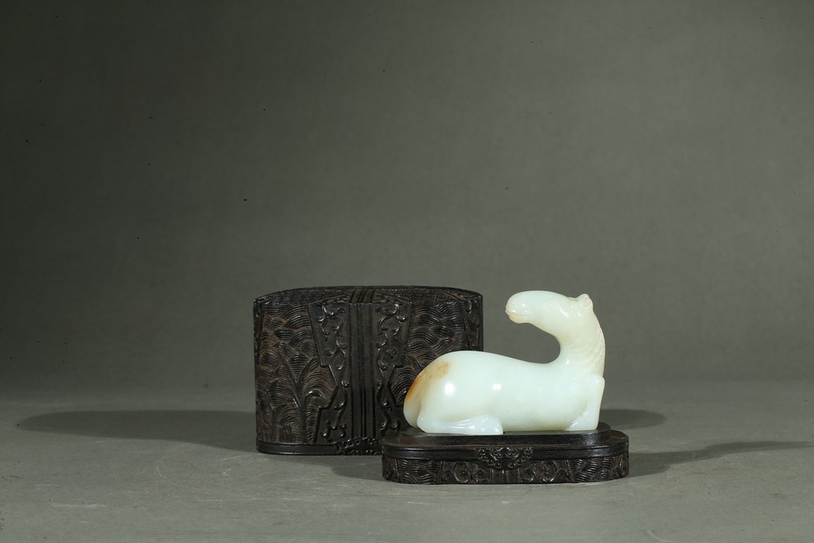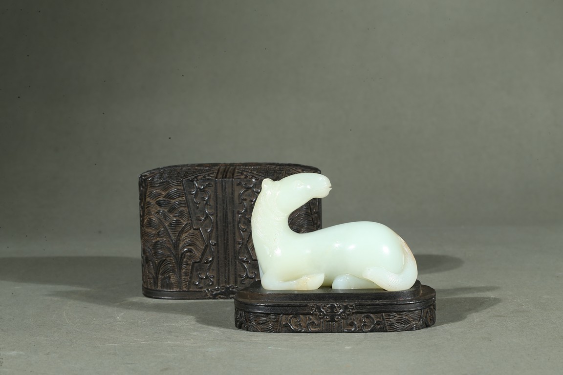 Depicted recumbent with its forelegs bent and hind legs tucked underneath its body, its head turned sharply to the back, its bushy tail curled alongside its left haunch, the smoothly polished stone of an even white tone with minor russet markings, accompanied with zitan stand and box. Qing Dynasty period.