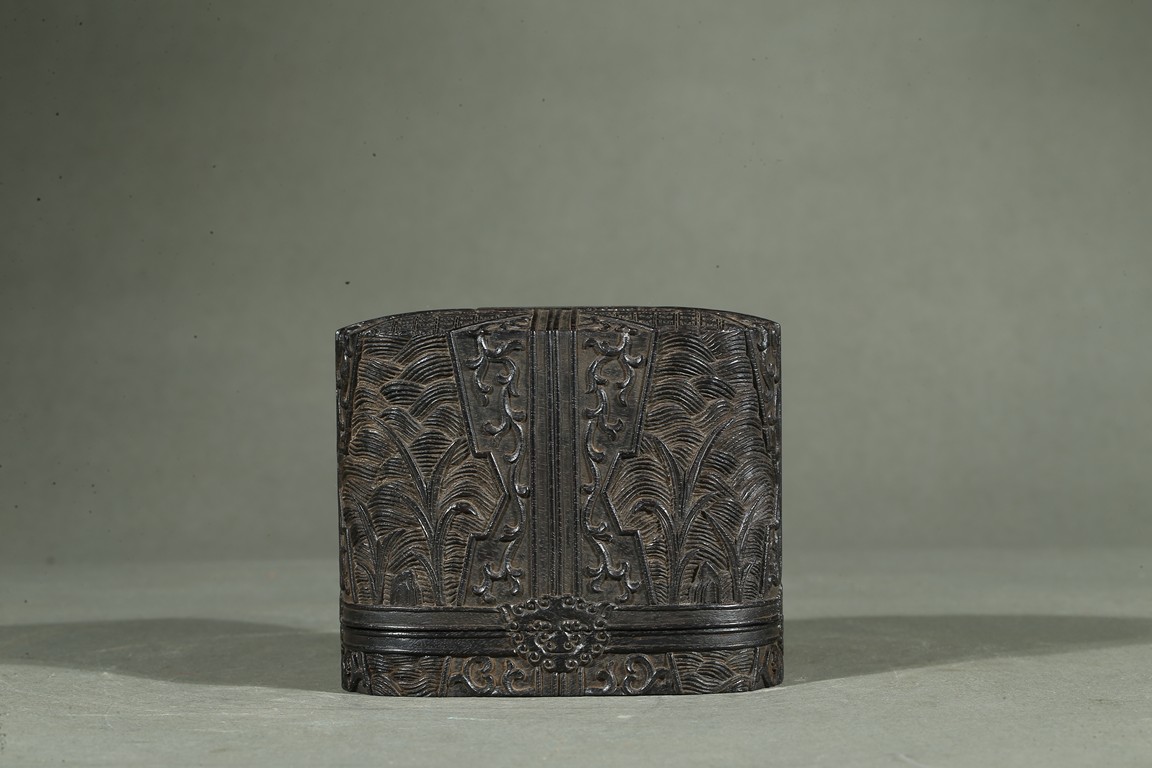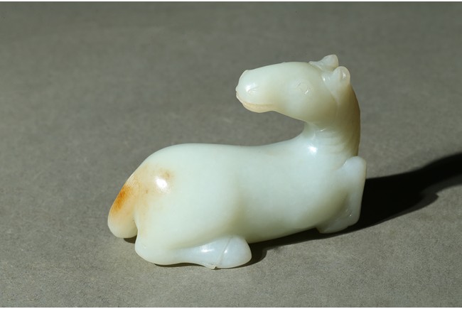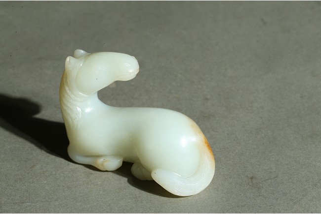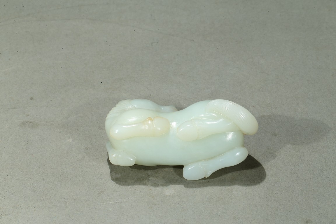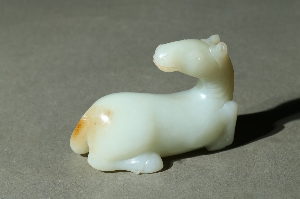 Depicted recumbent with its forelegs bent and hind legs tucked underneath its body, its head turned sharply to the back, its bushy tail curled alongside its left haunch, the smoothly polished stone of an even white tone with minor russet markings, accompanied with zitan stand and box. Qing Dynasty period.