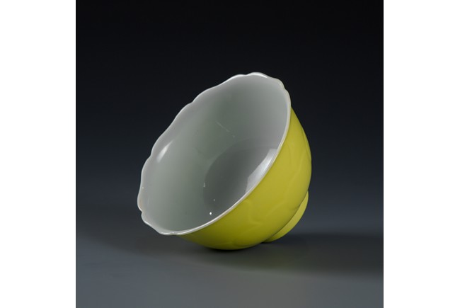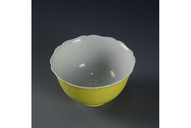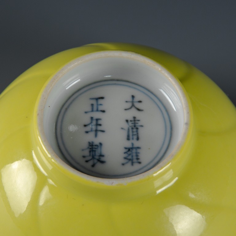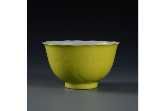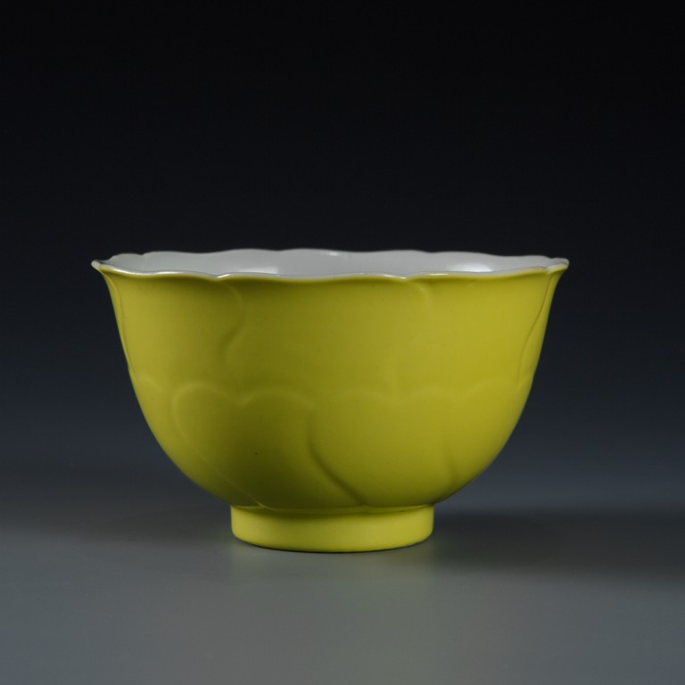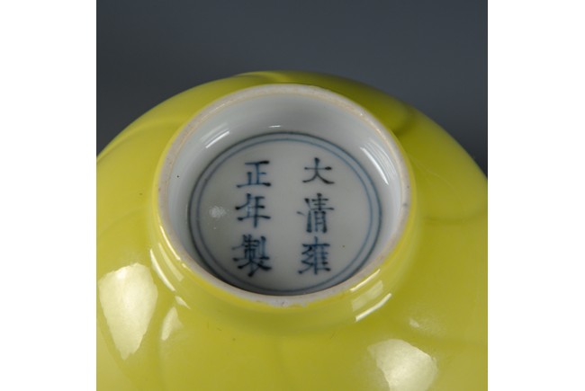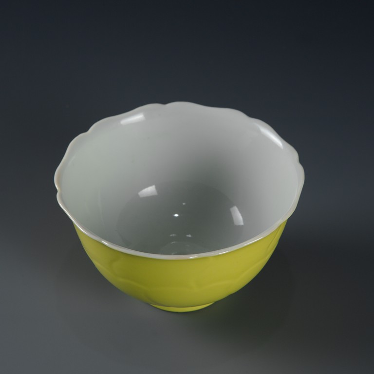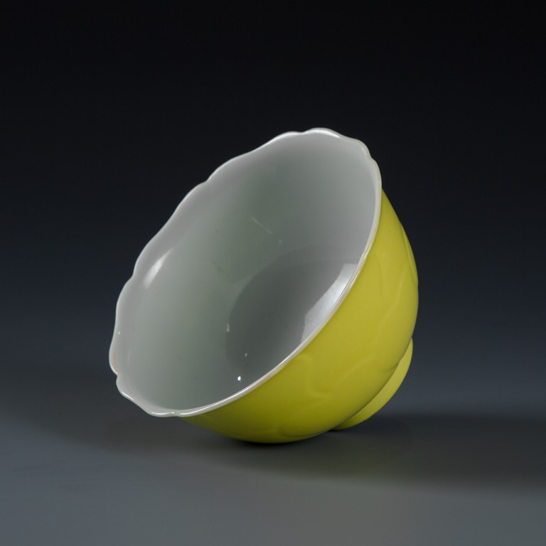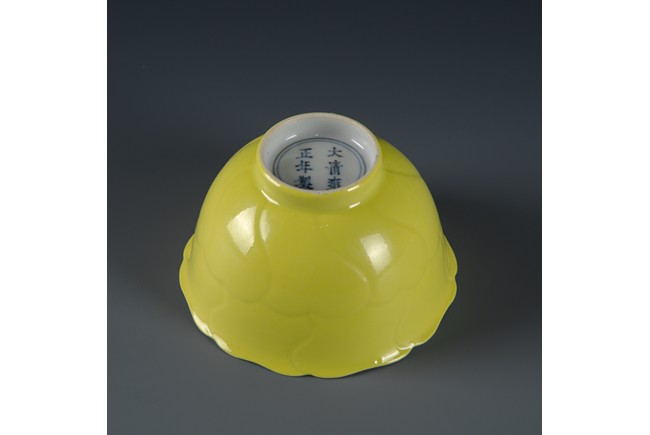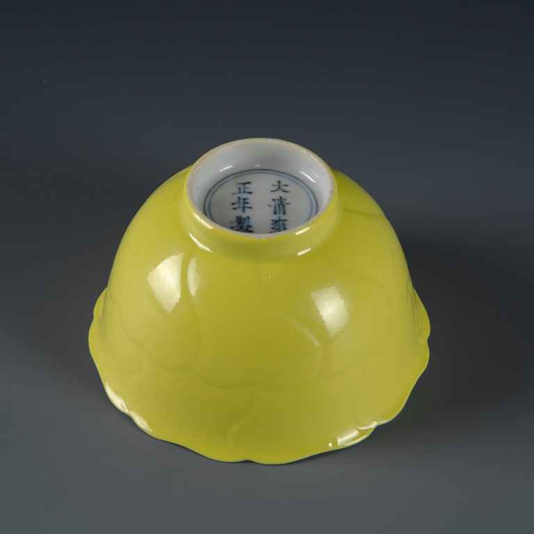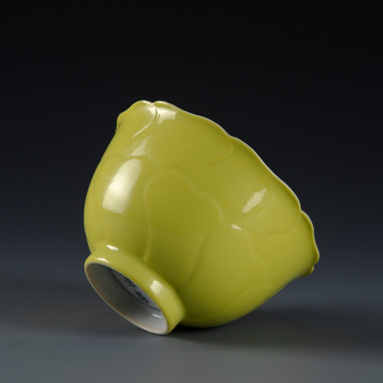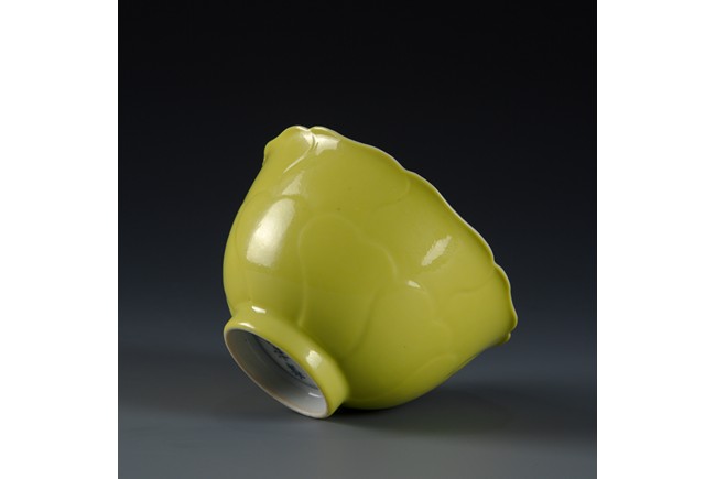 Supporting on a short foot ring and rises to flared rim, the body modelled in the form of lotus leaf and finely suffused with yellow glaze, the base with six character Yongzheng mark. Qing Dynasty Yongzheng period.