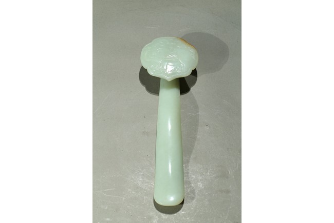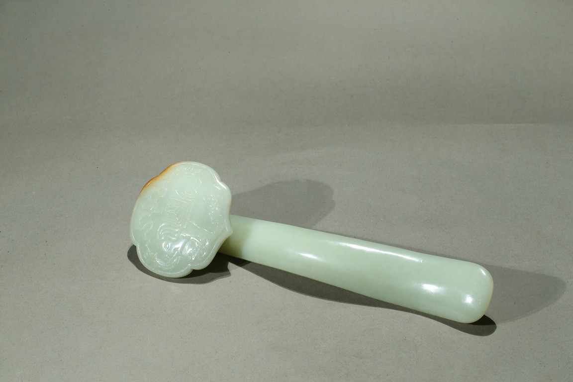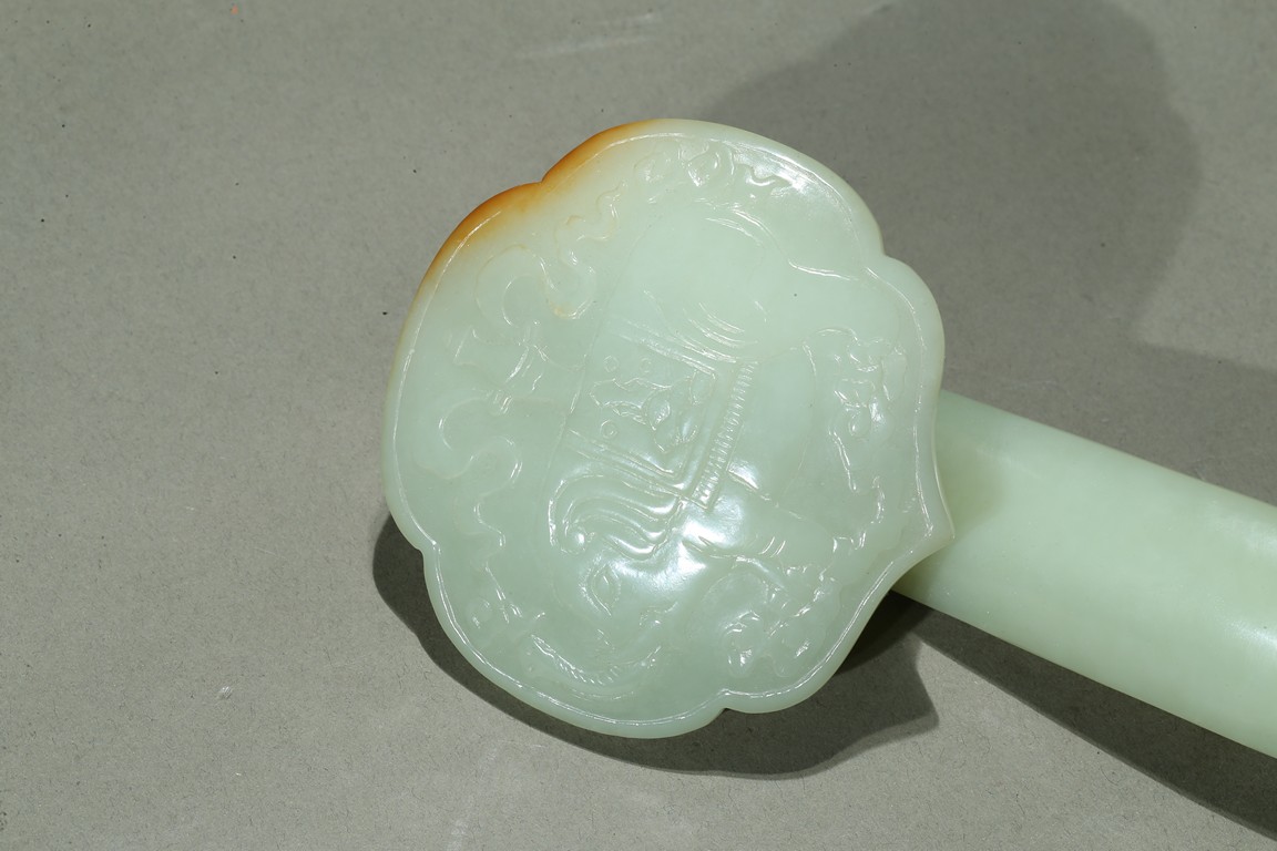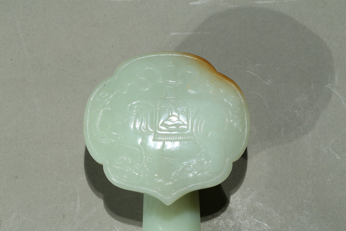 The ruyi head carved in low relief with an elephant supporting a sacred vase, the shaft uncarved. Qing Dynasty period.