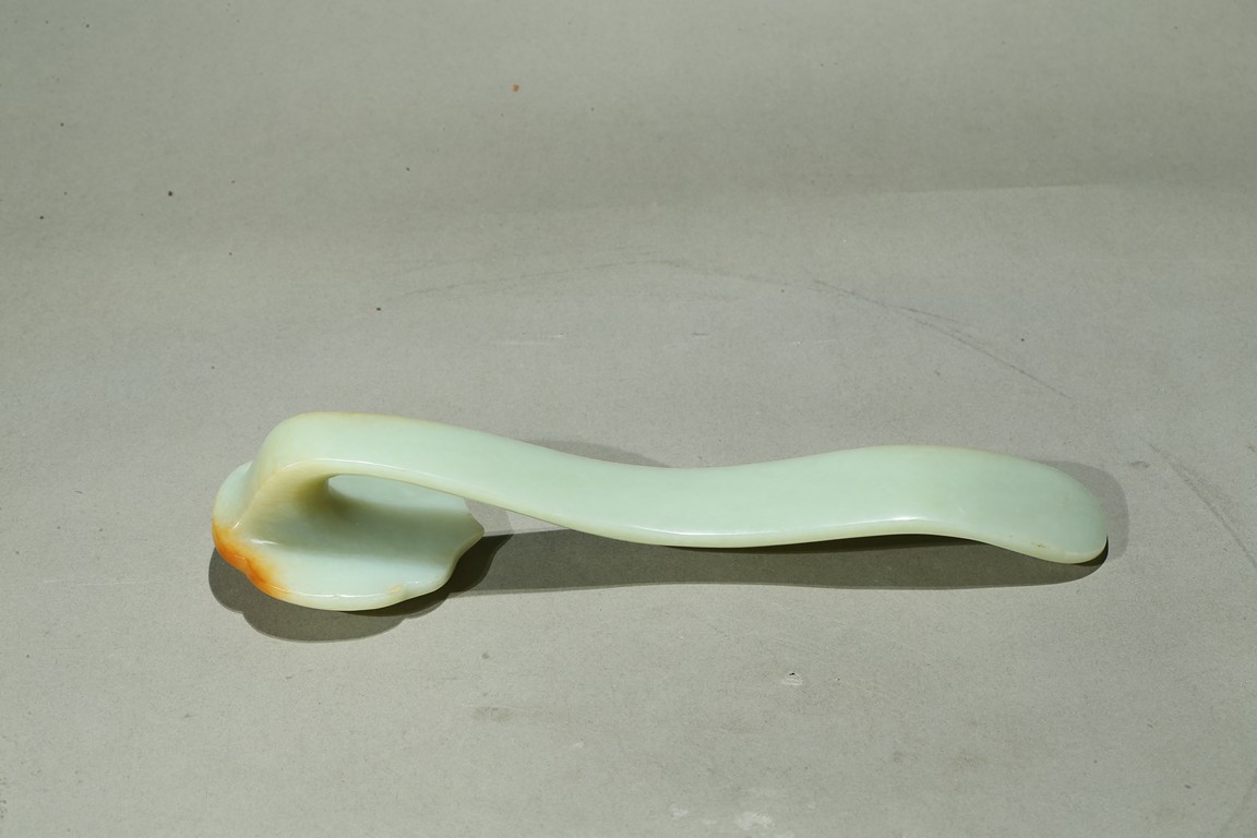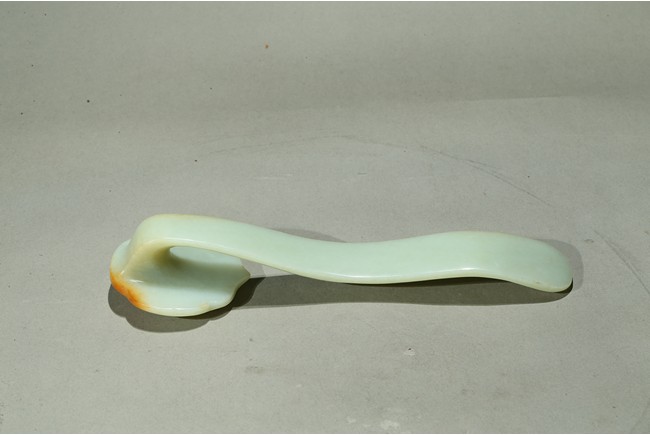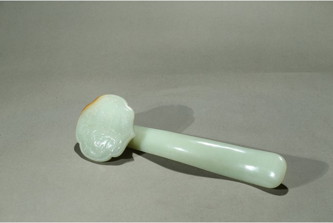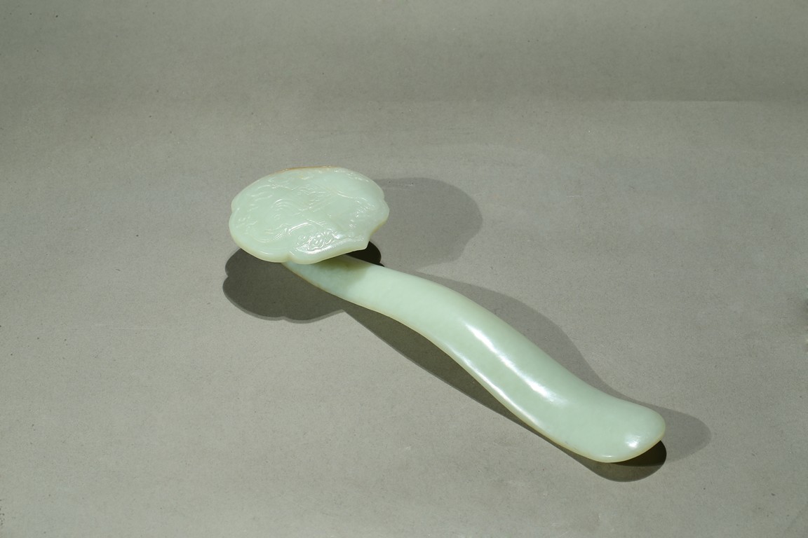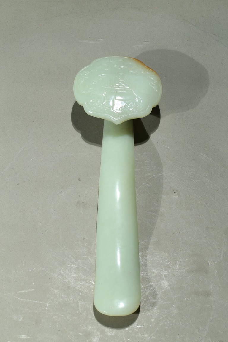 The ruyi head carved in low relief with an elephant supporting a sacred vase, the shaft uncarved. Qing Dynasty period.