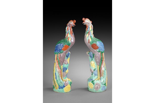 Standing upright on one leg, the phoenix is turned slightly, with closed wings and tail feathers draped on ground. Each long tail feather is colored differently, as the feathers on the phoenix, with red, green, blue, and yellow, while tinted violet was used for the body color. Qing Dynasty period.