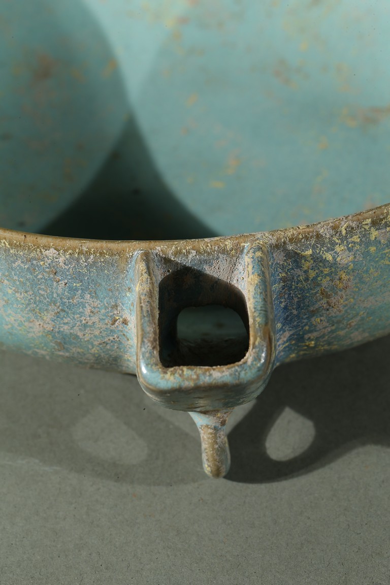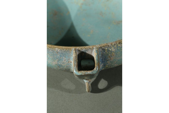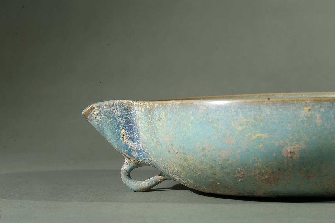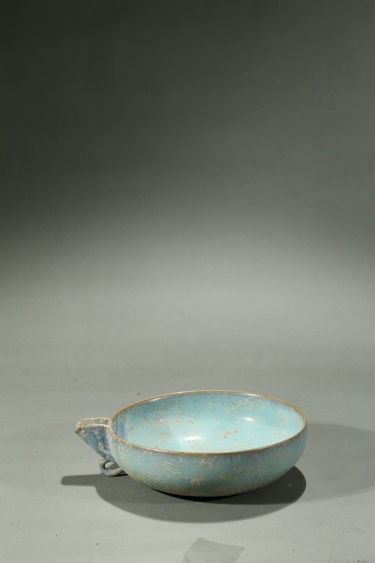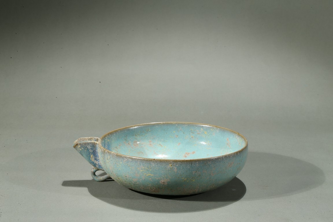 The rounded sides supported on flat base, rising to a straight rim and set with an flaring spout above a lug, overall covered in attractive lavender blue. Song Dynasty period