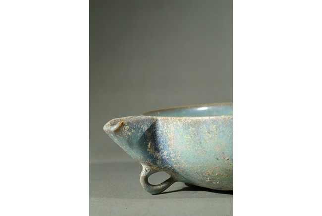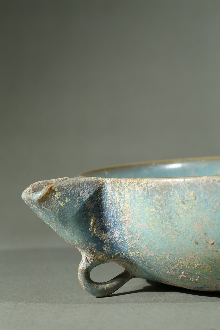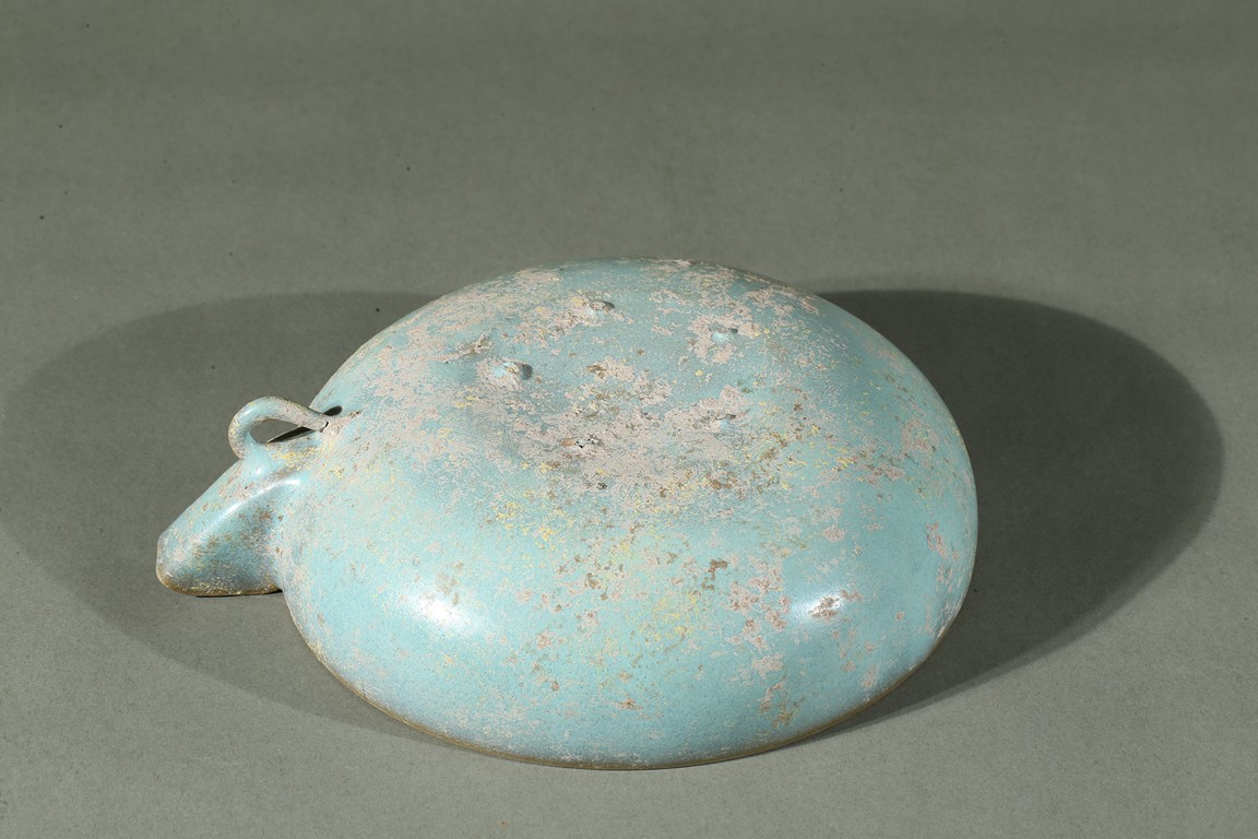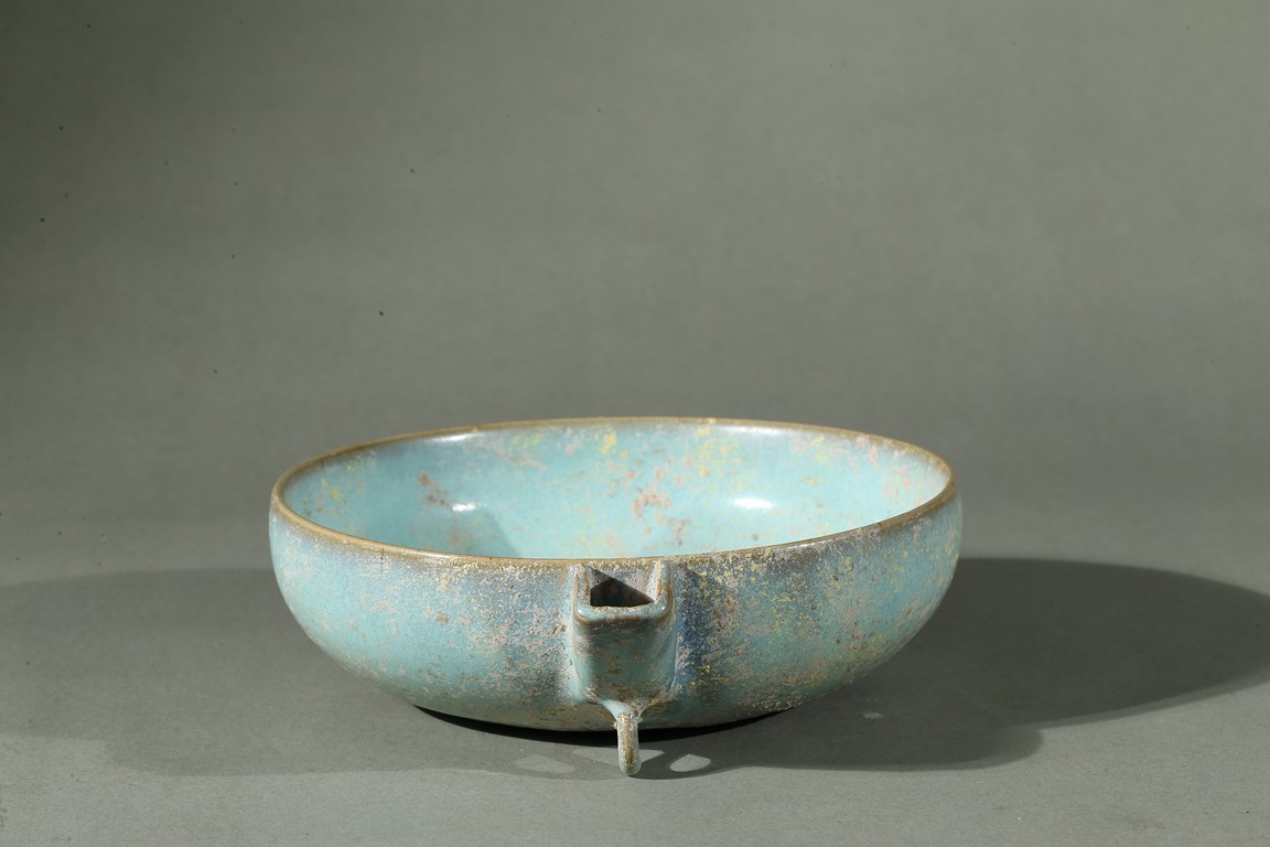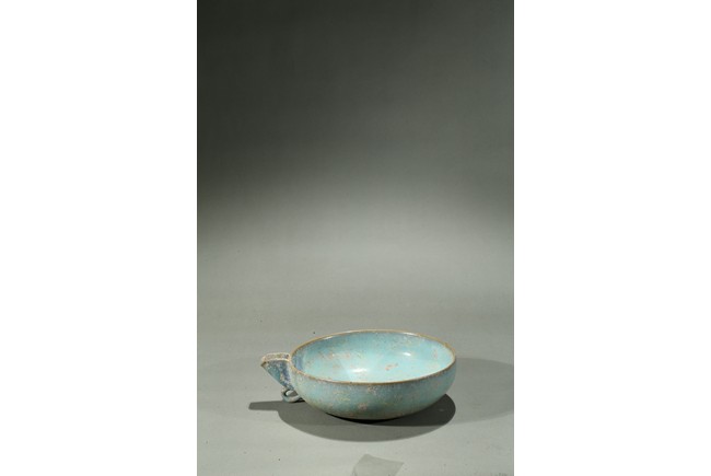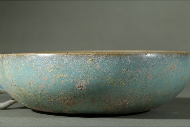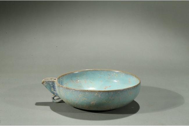The rounded sides supported on flat base, rising to a straight rim and set with an flaring spout above a lug, overall covered in attractive lavender blue. Song Dynasty period